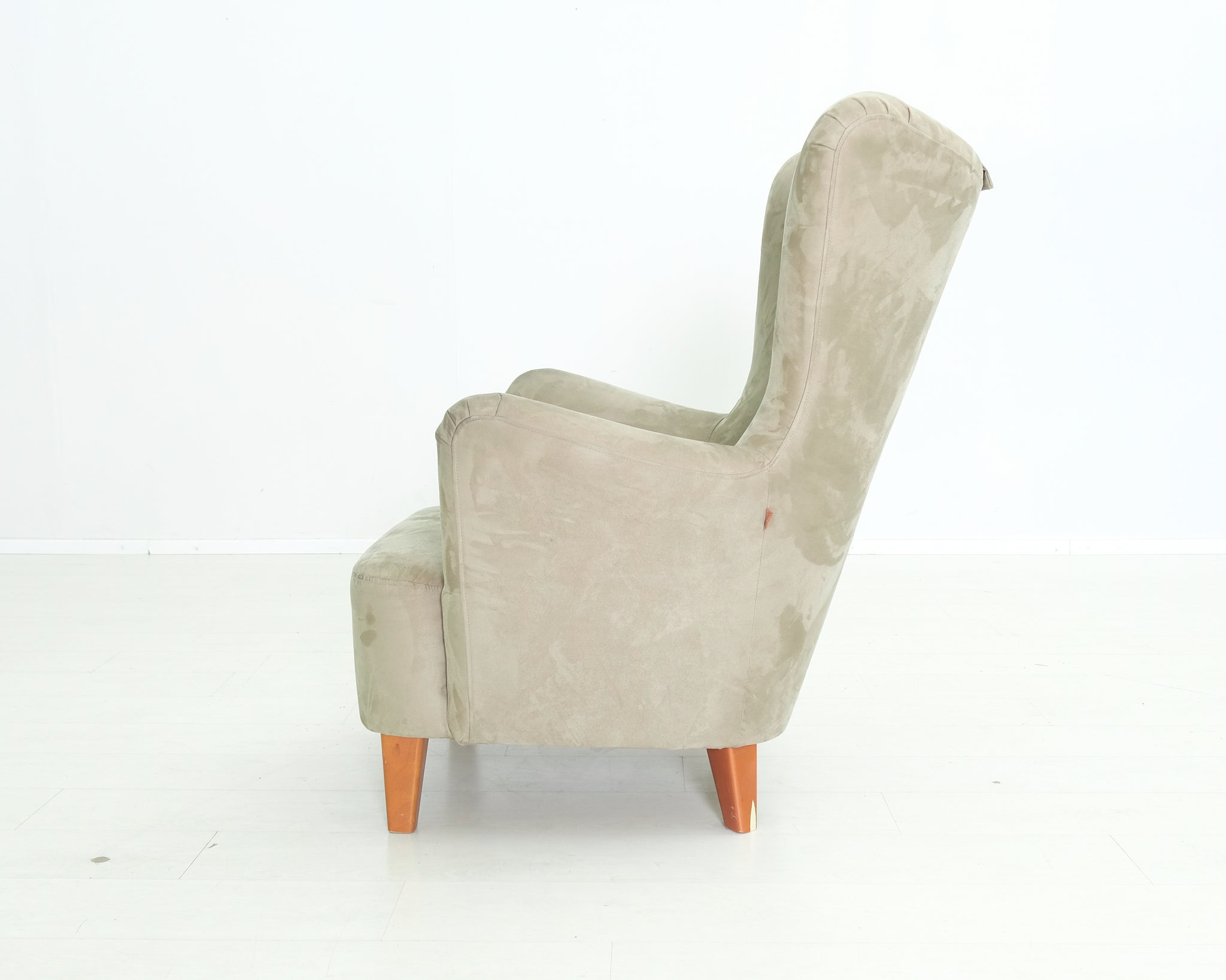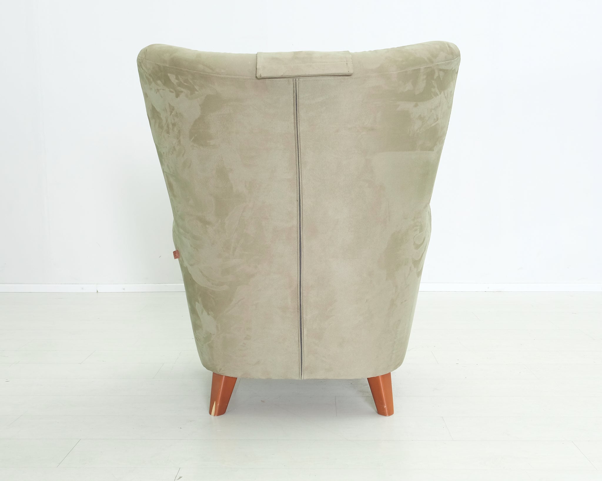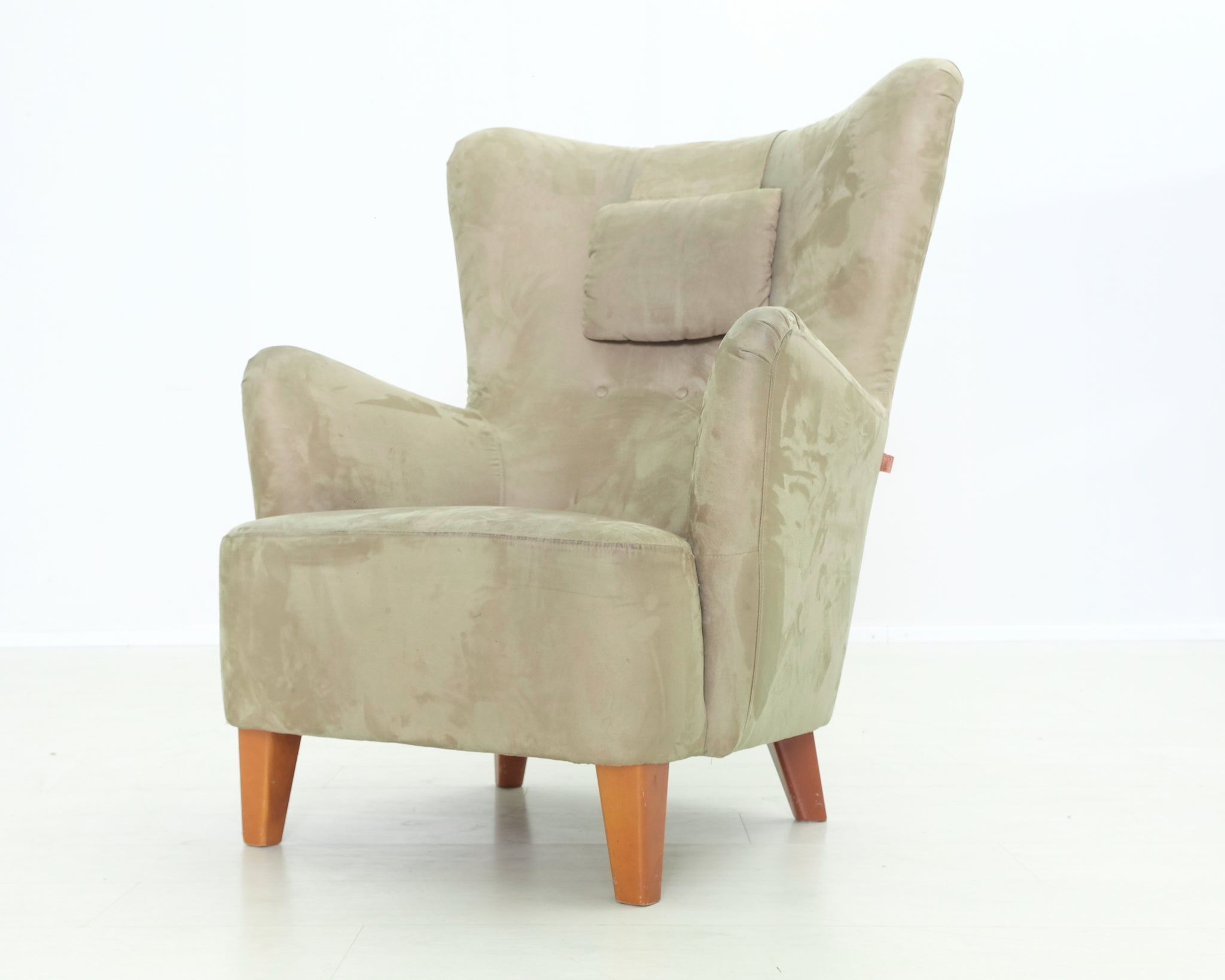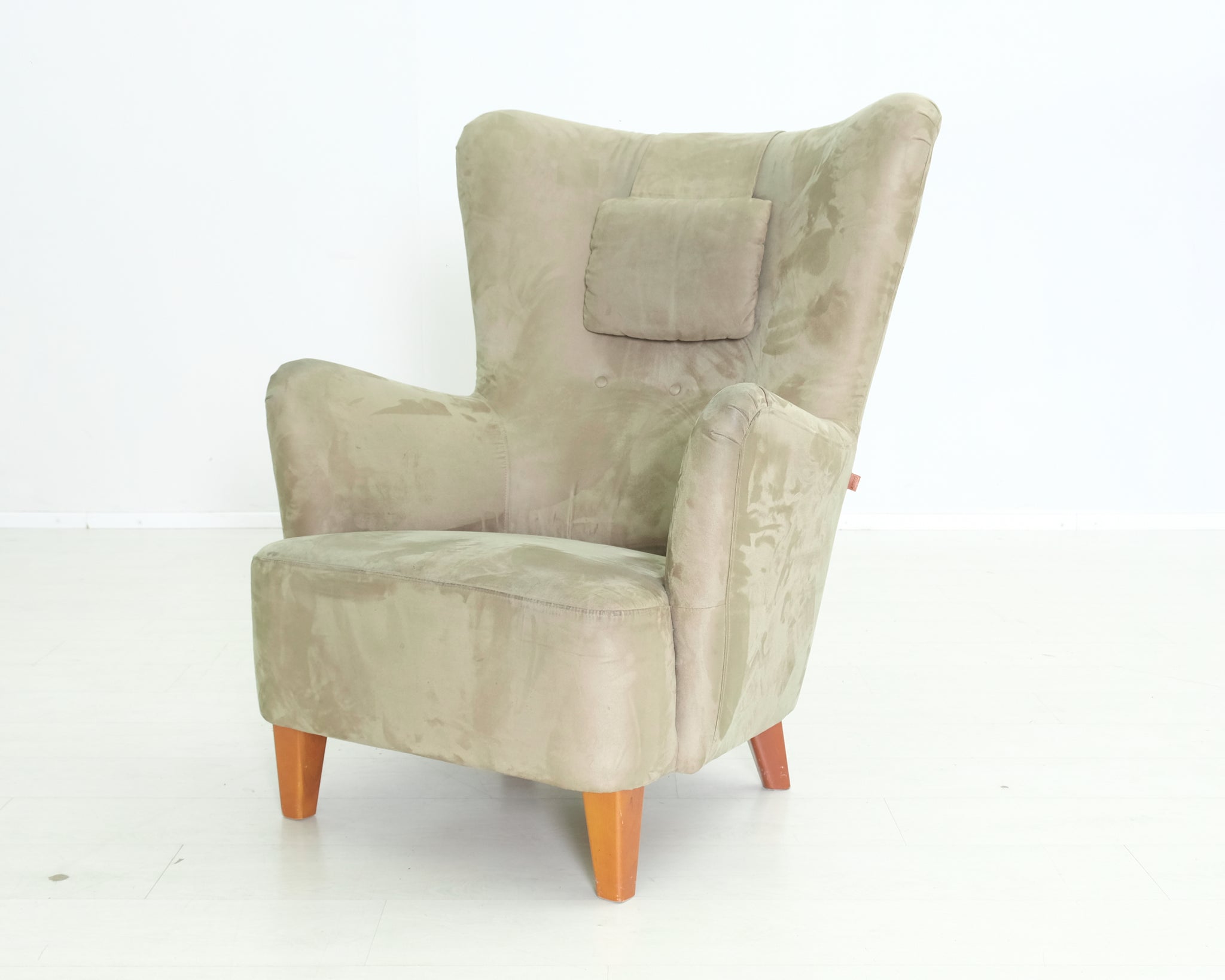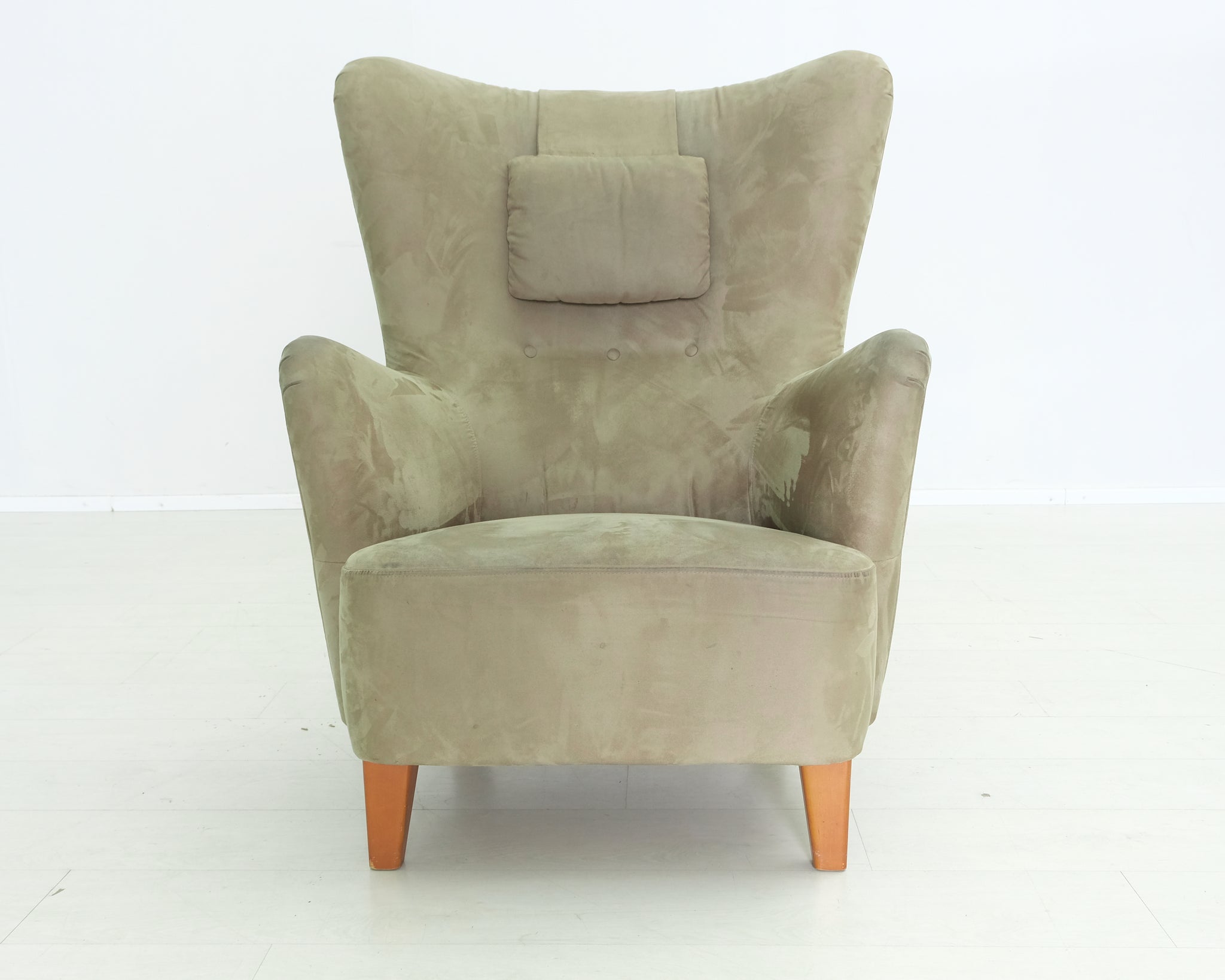 Tämän klassikkonojatuolin malli on peräisin 40-luvulta. Irrallinen niskatyyny tuo lisämukavuutta. Alcantara-verhoilu.
