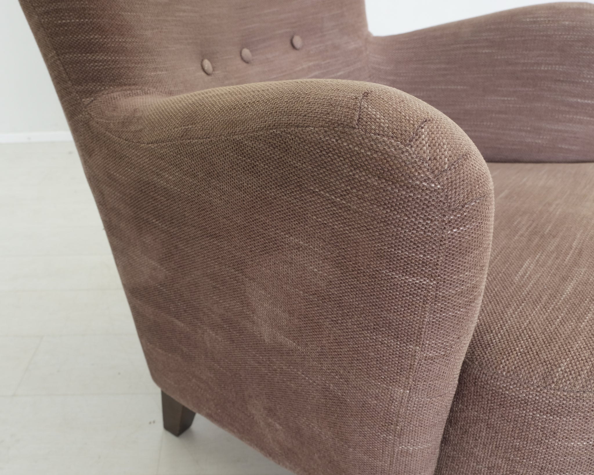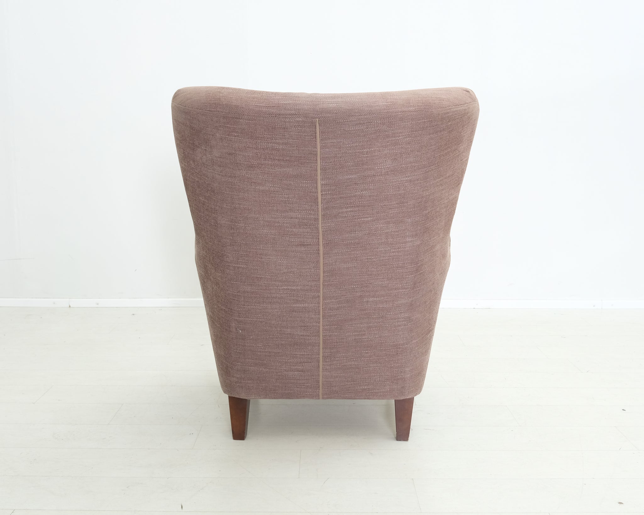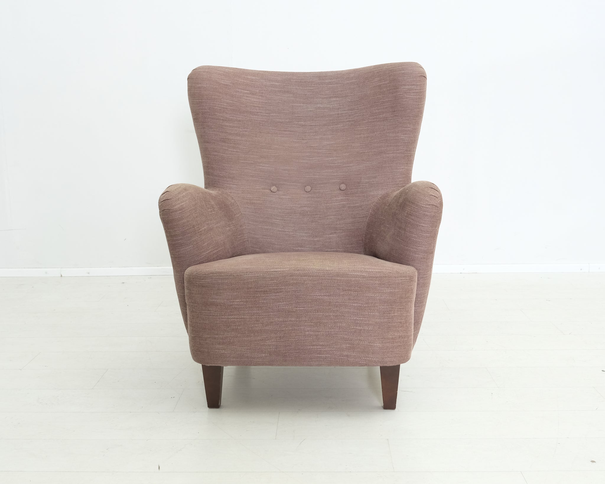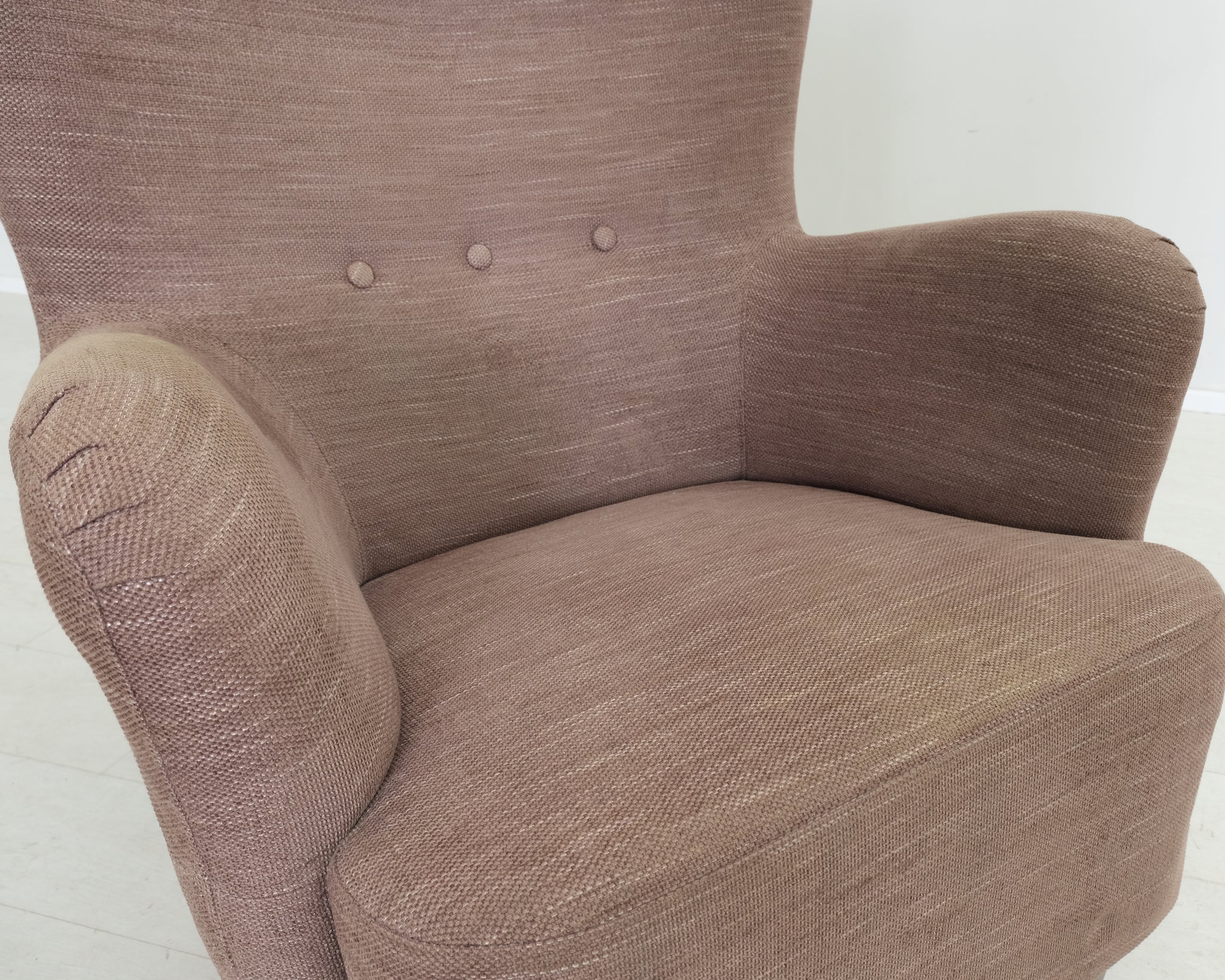 Tämän klassikkonojatuolin malli on peräisin 40-luvulta. Ruskea verhoilu on helposti yhdisteltävissä.