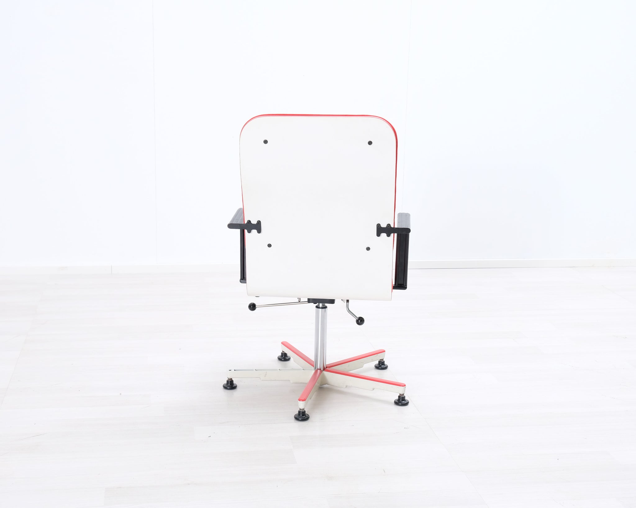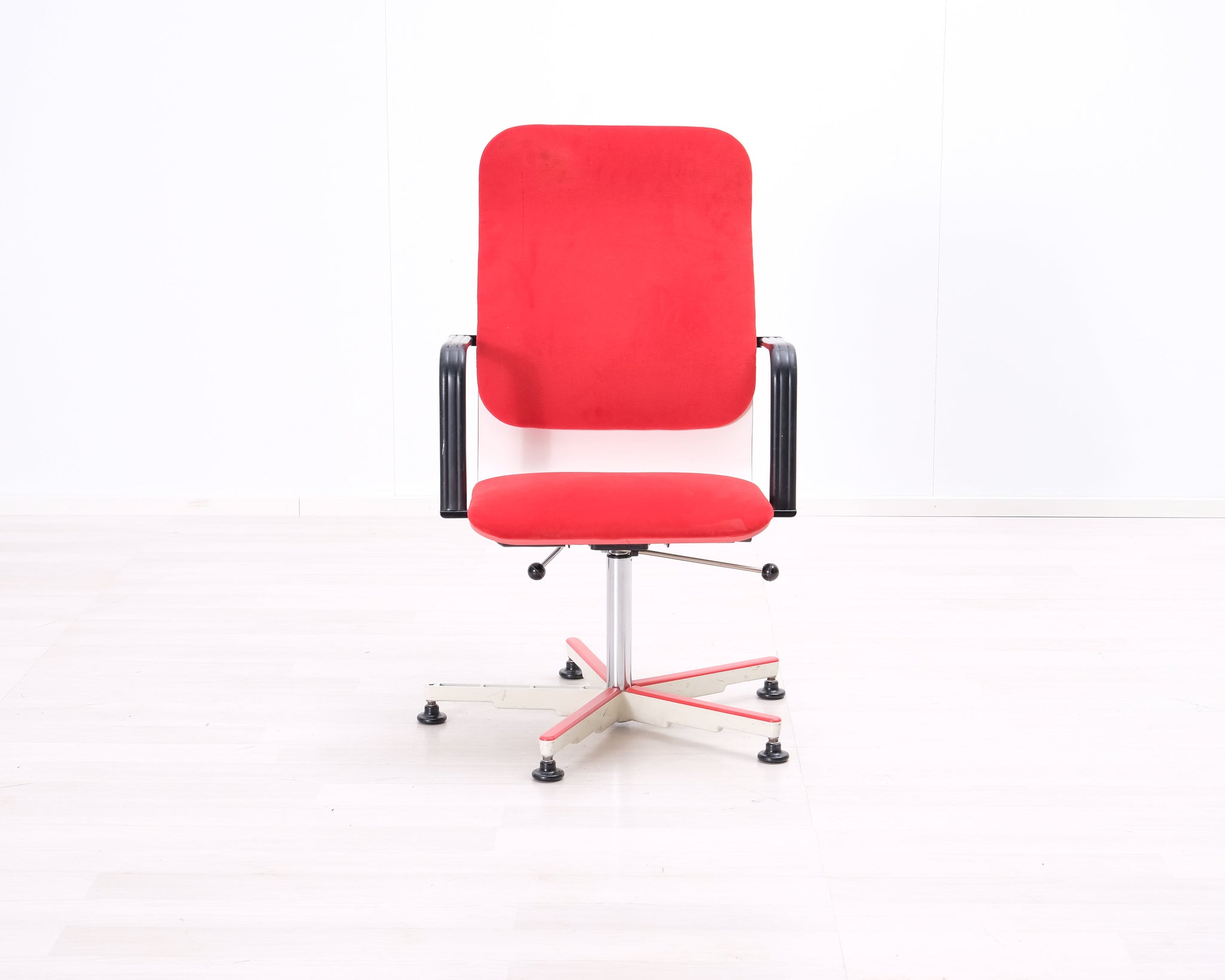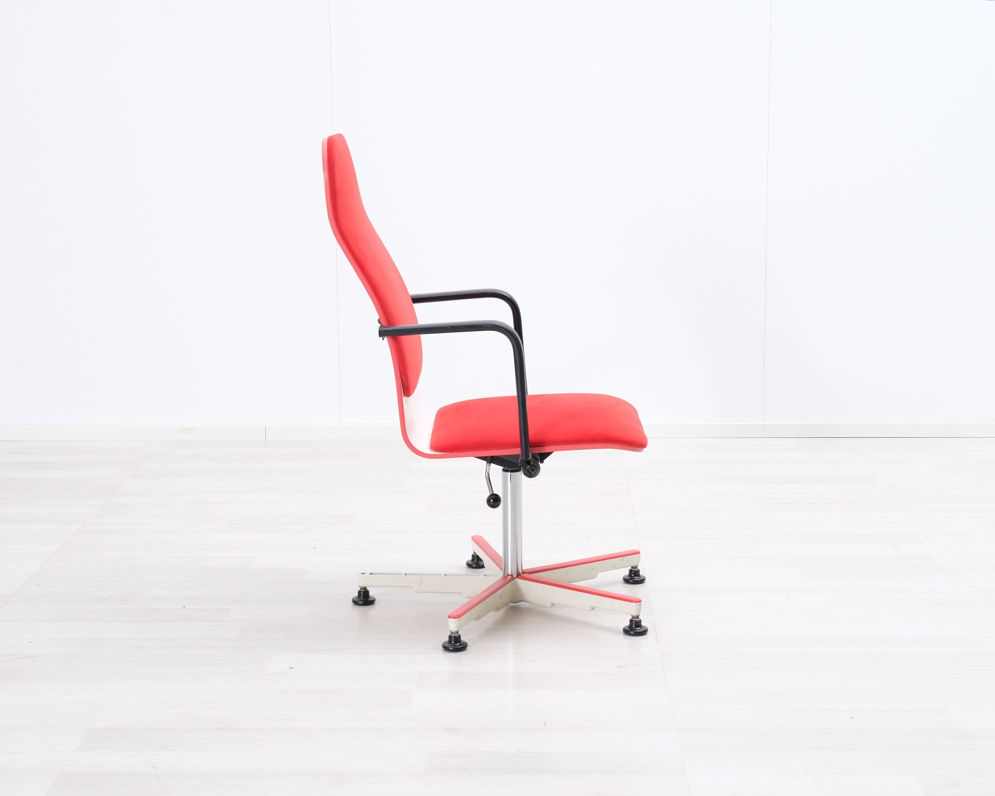 Avarten valmistama punainen toimistotuoli. Säädettävä korkeus. Sunnittelijana Yrjö Kukkapuro.