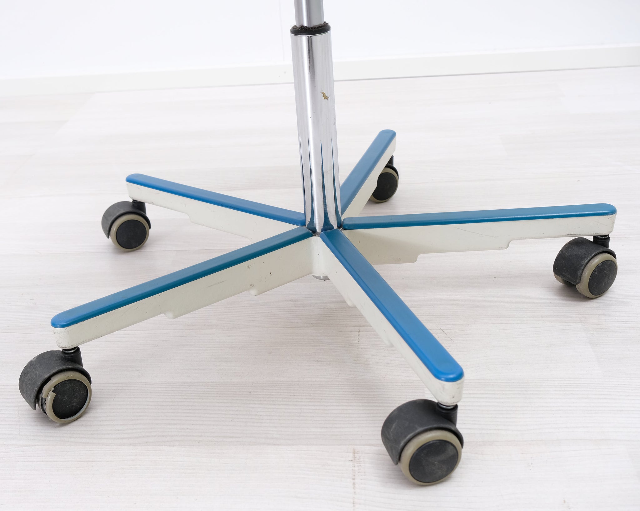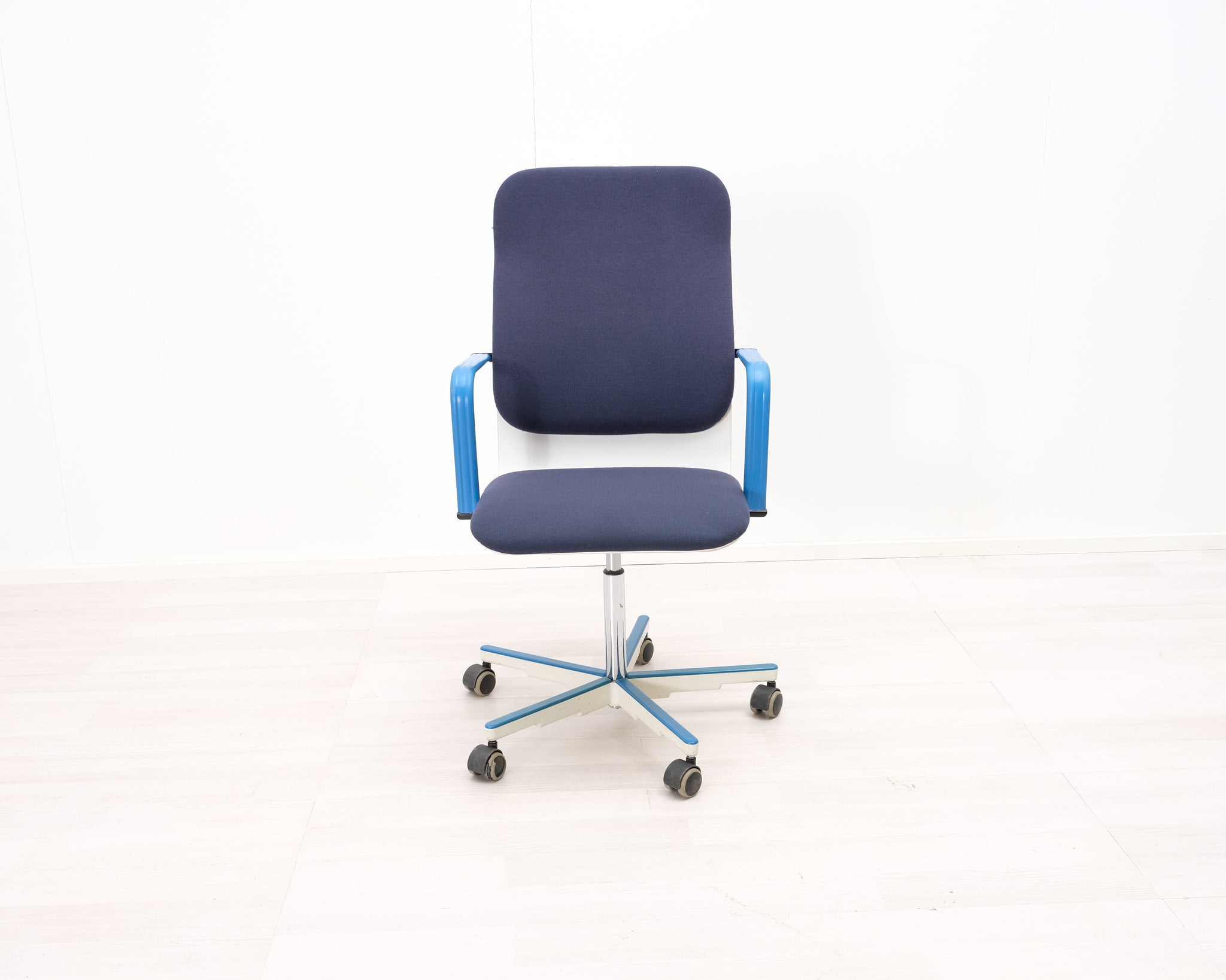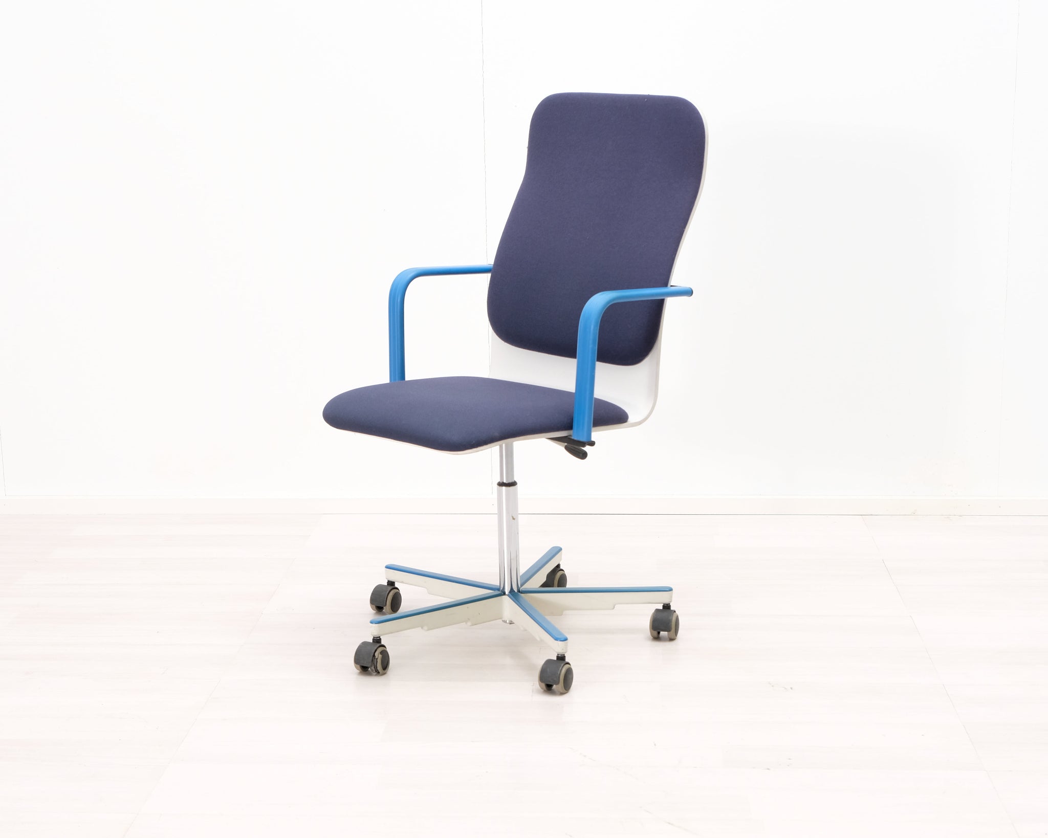Yrjö Kukkapuron suunnittelema toimistotuoli. Valkoisessa istuimessa sinisellä kankaalla verhoiltu istuin ja selkänoja. Säädettävä korkeus ja renkaat.