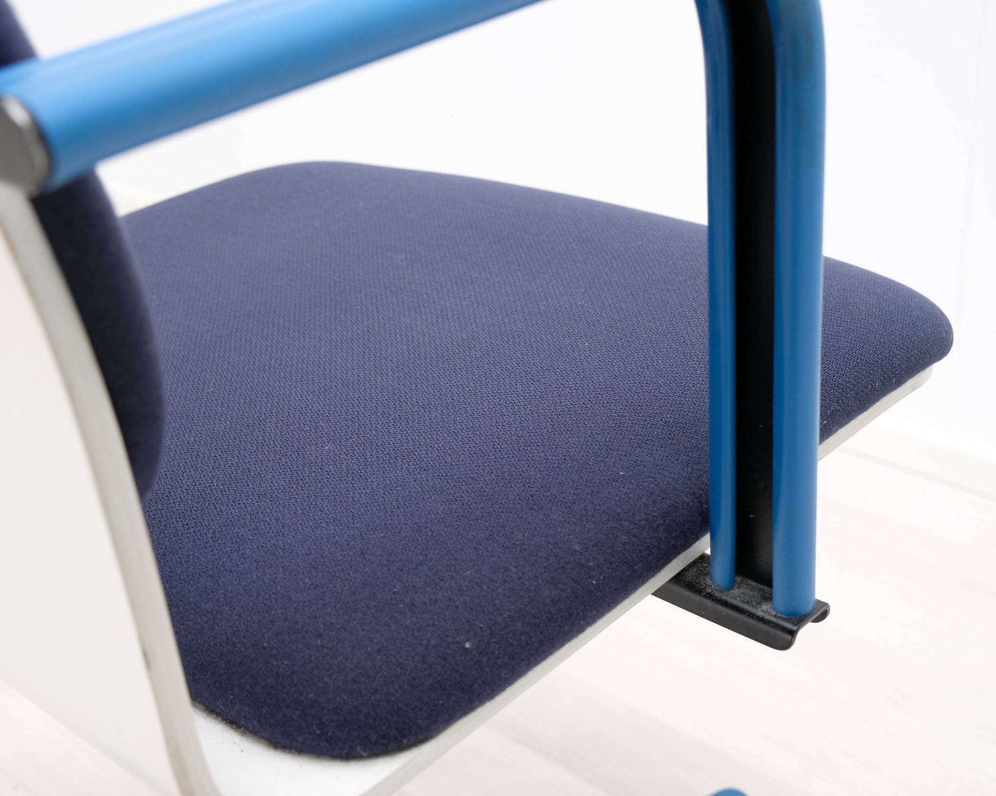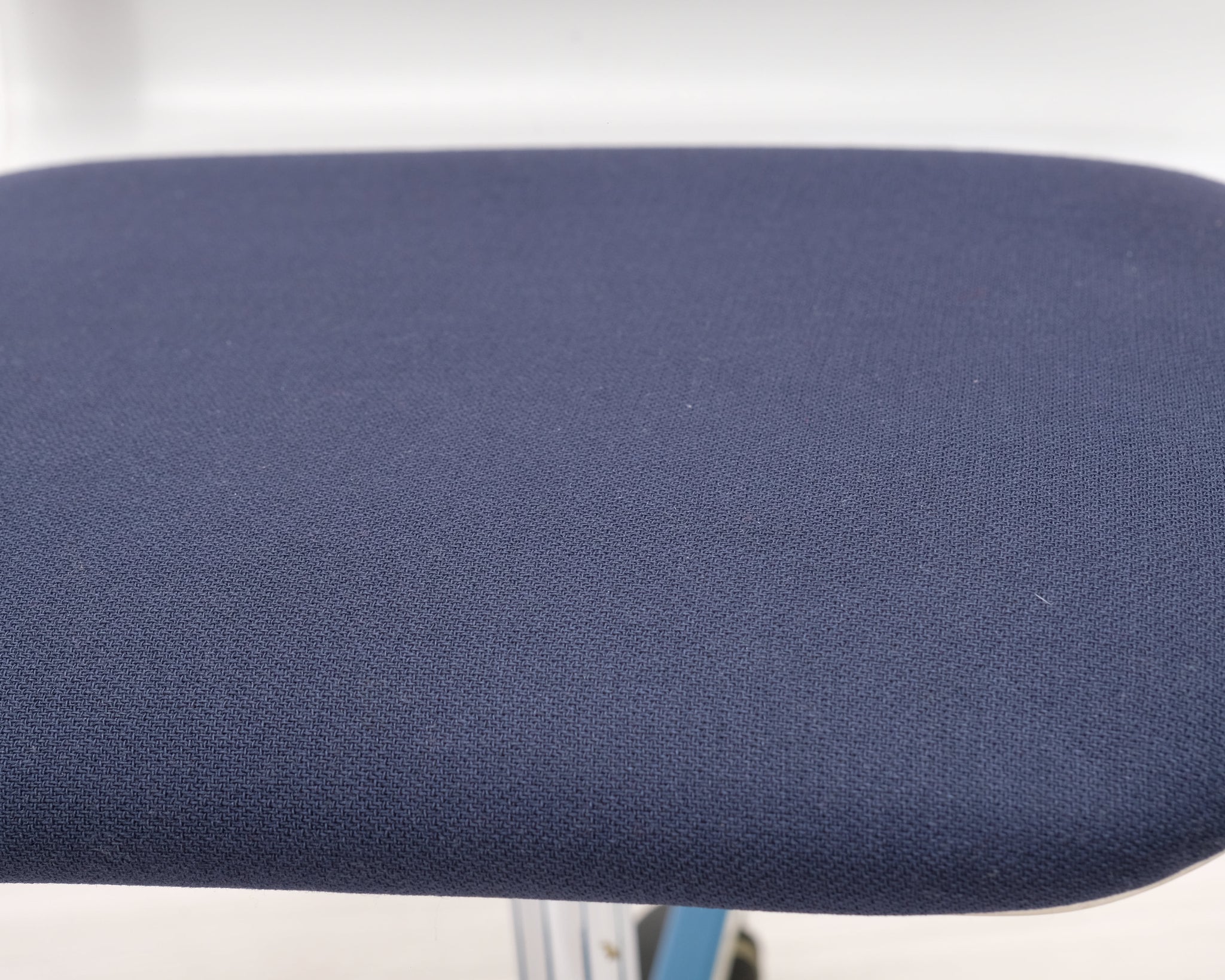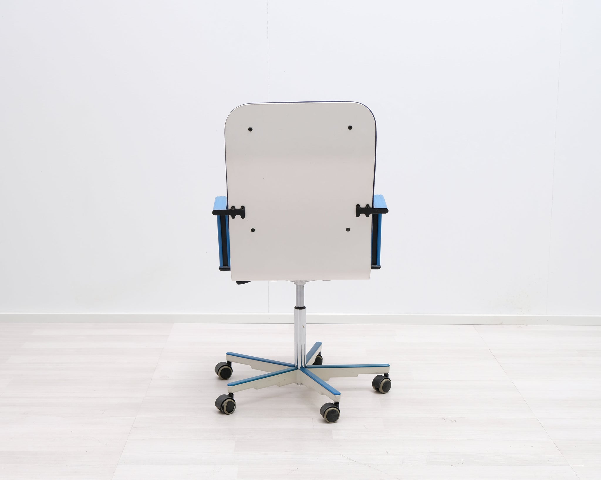 Yrjö Kukkapuron suunnittelema toimistotuoli. Valkoisessa istuimessa sinisellä kankaalla verhoiltu istuin ja selkänoja. Säädettävä korkeus ja renkaat.