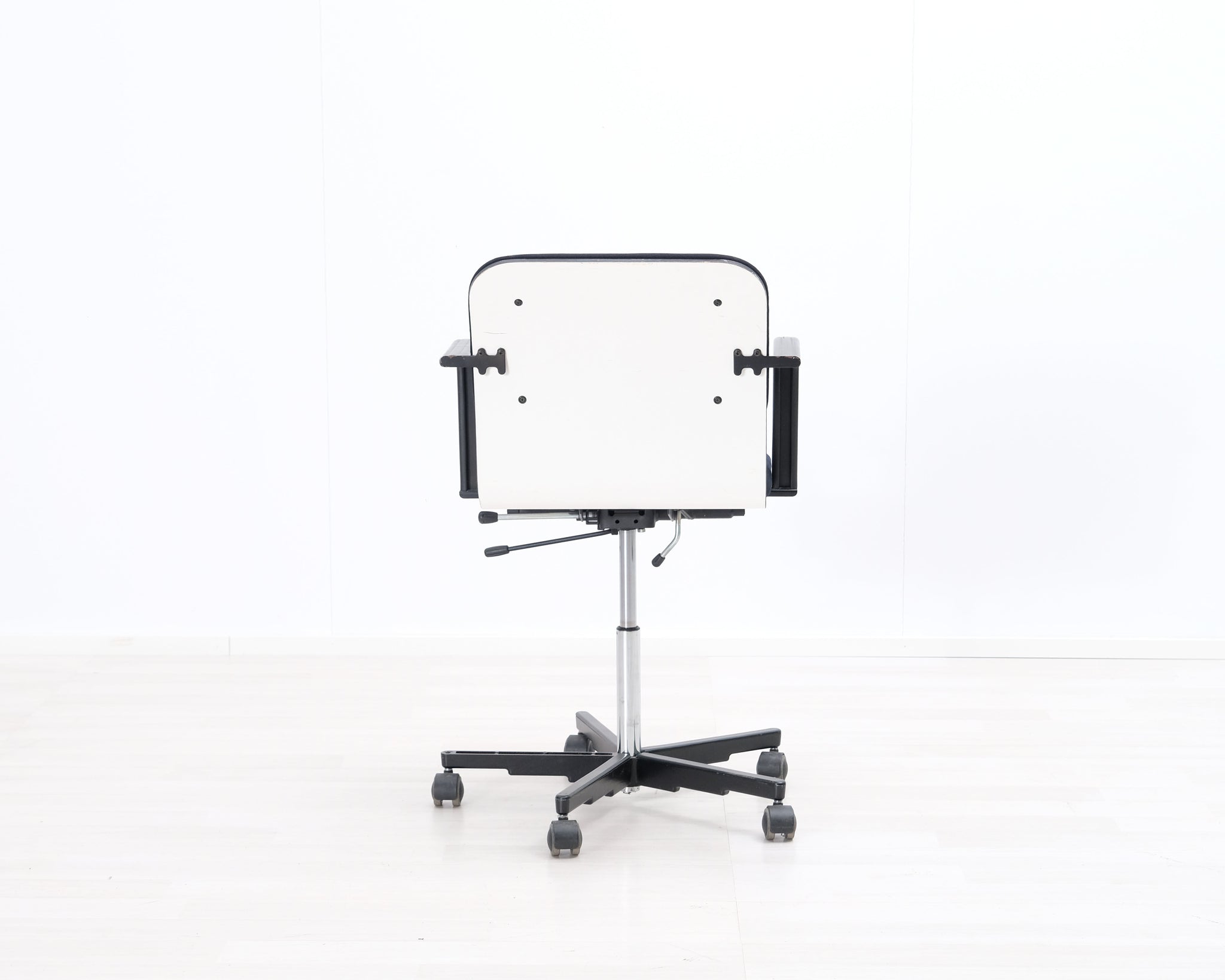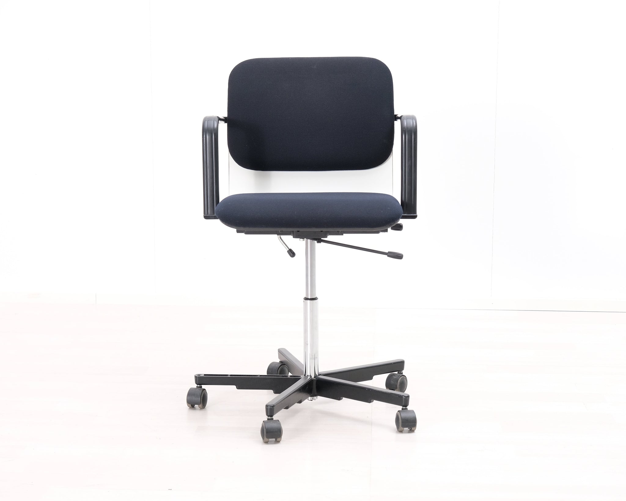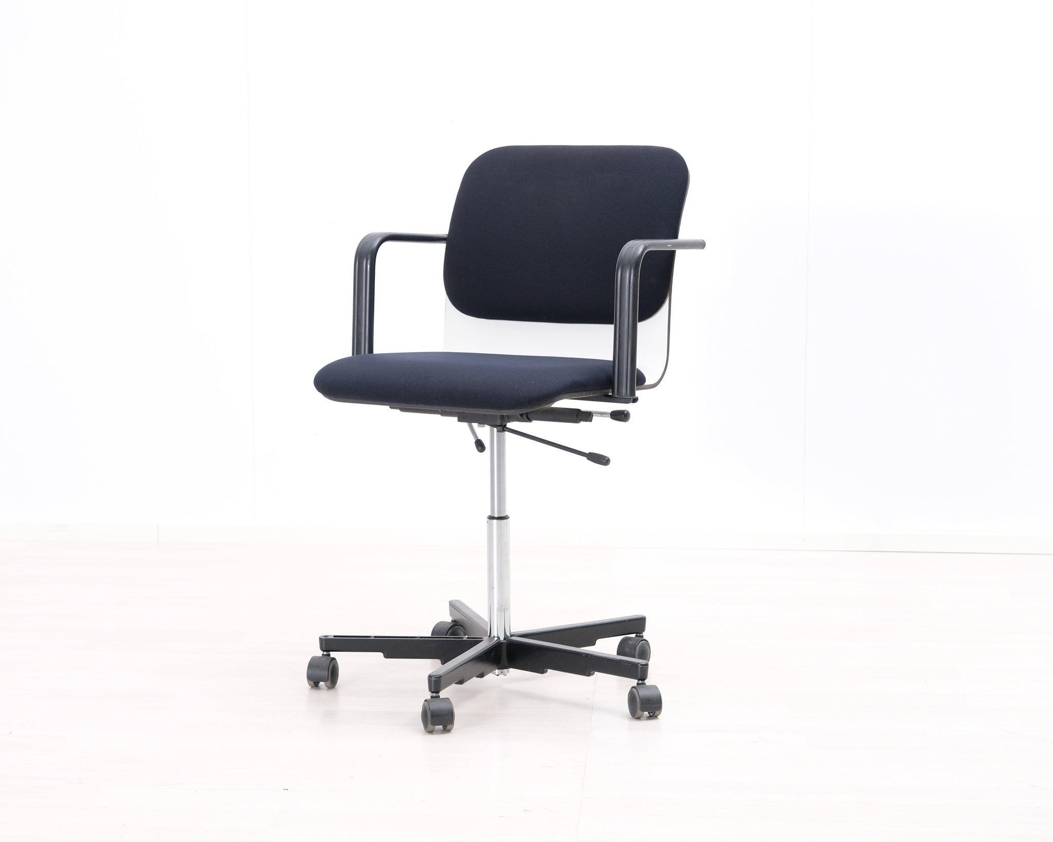 Yrjö Kukkapuron suunnittelema mustavalkoinen toimistotuoli. Pyörät ja säädettävä korkeus.