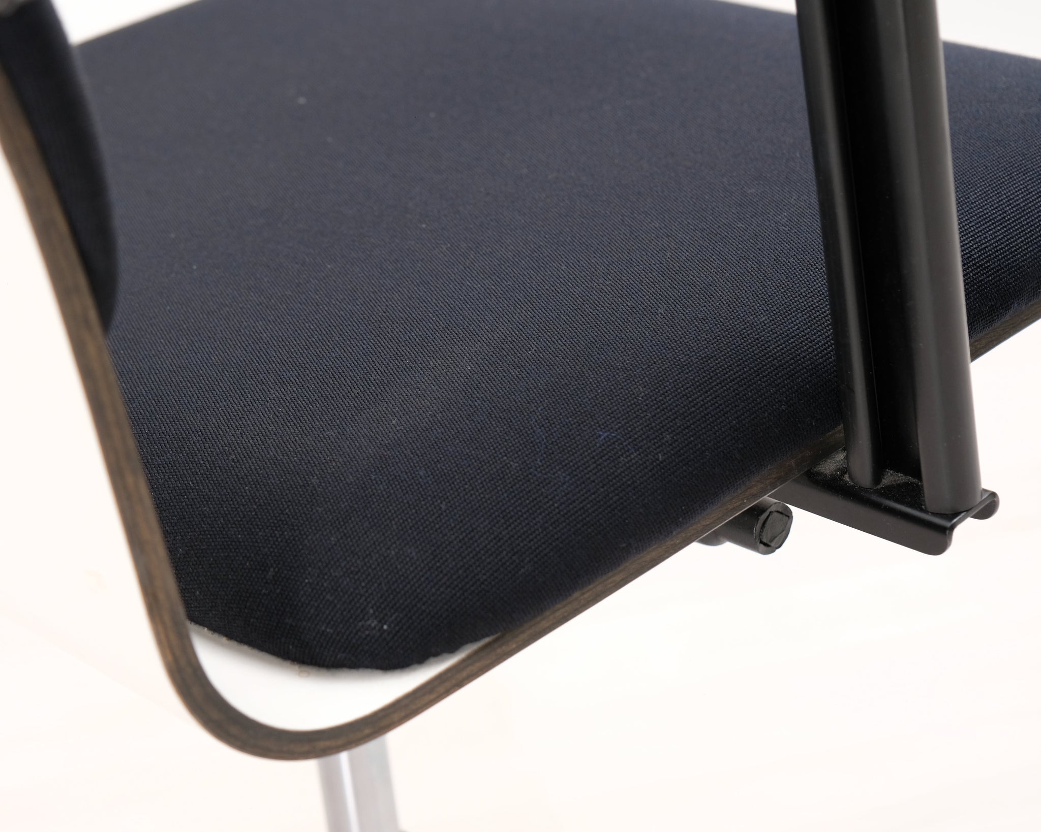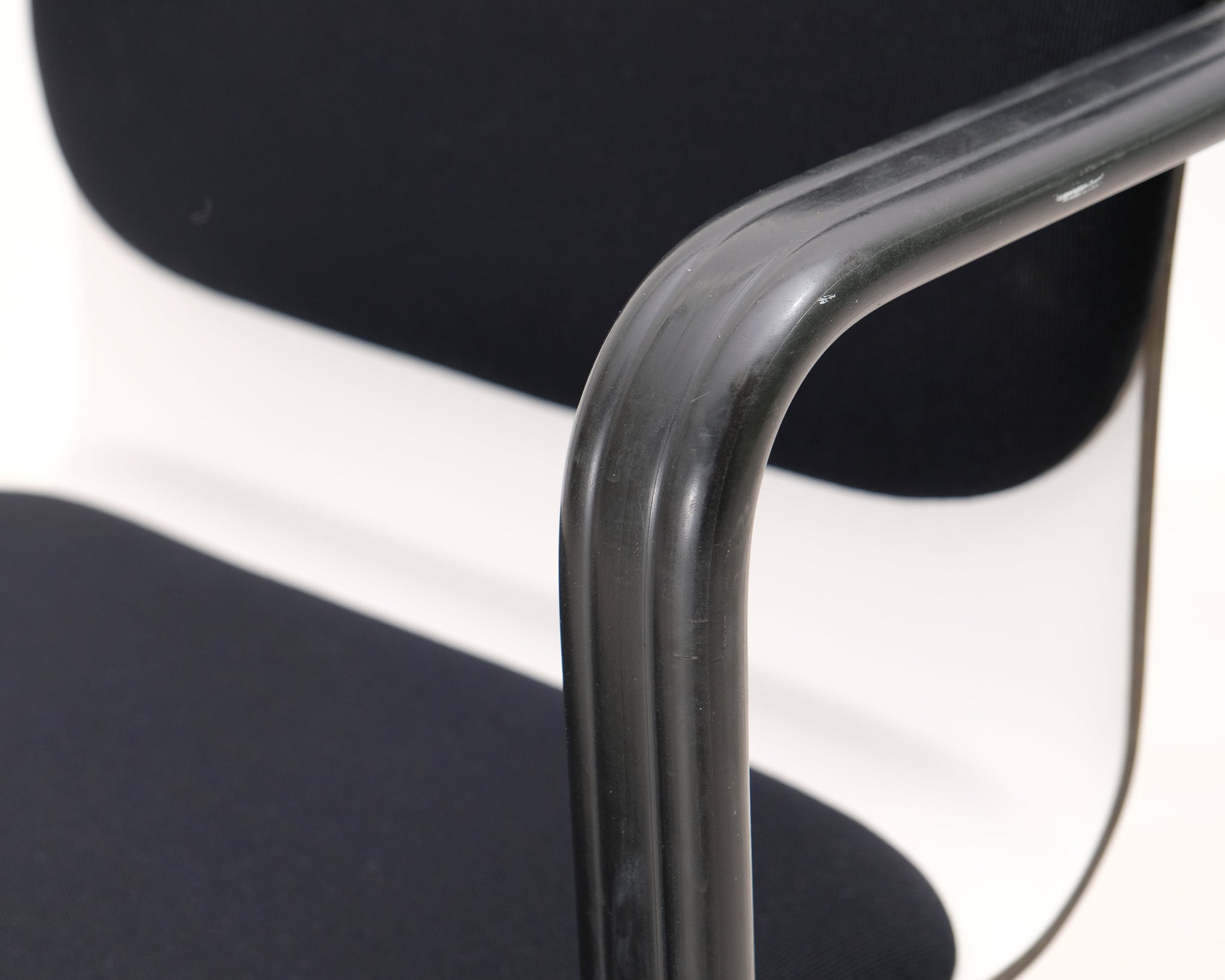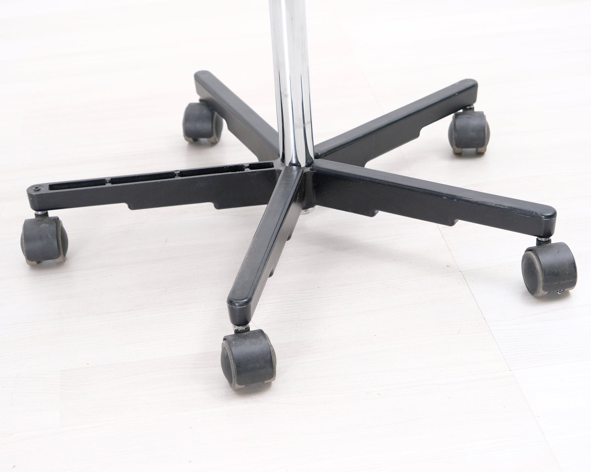 Yrjö Kukkapuron suunnittelema mustavalkoinen toimistotuoli. Pyörät ja säädettävä korkeus.