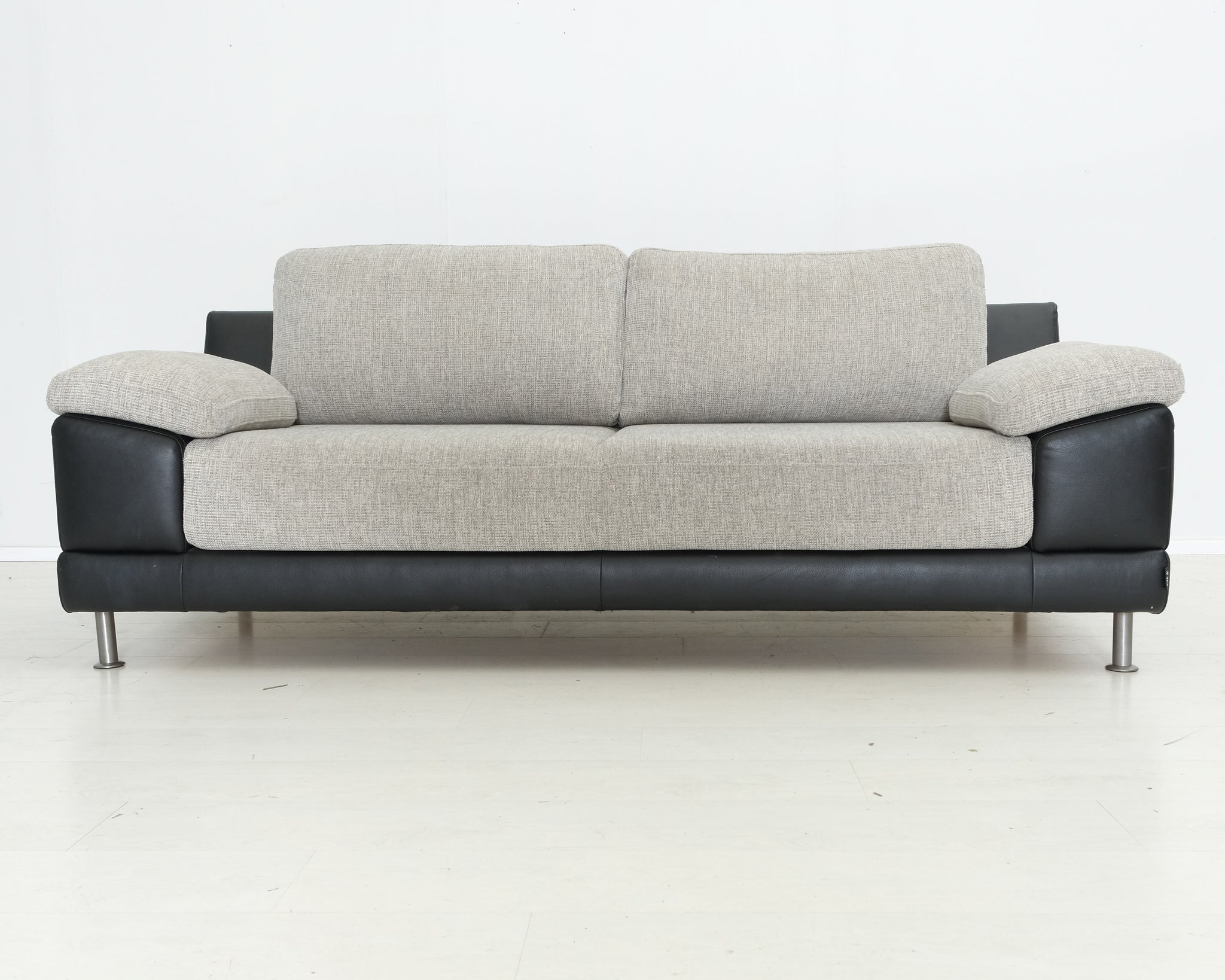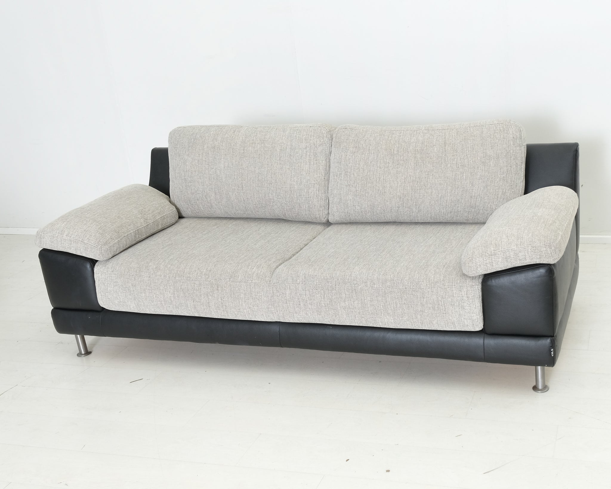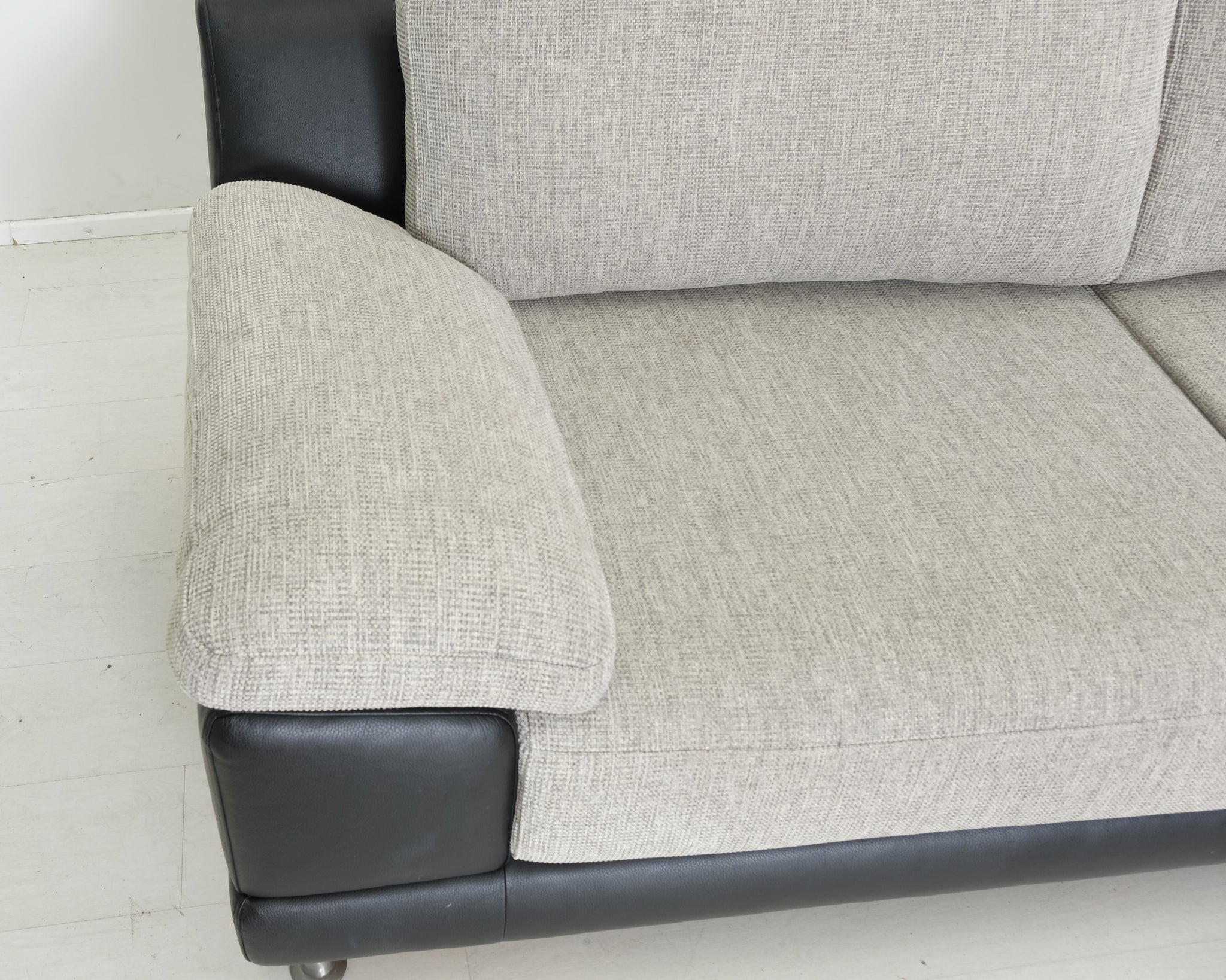 Mukava sohva minkä verhoilussa on yhdistetty mustaa nahkaa sekä beigenharmaata kangasta. Irrotettavat selkänojantyynyt.