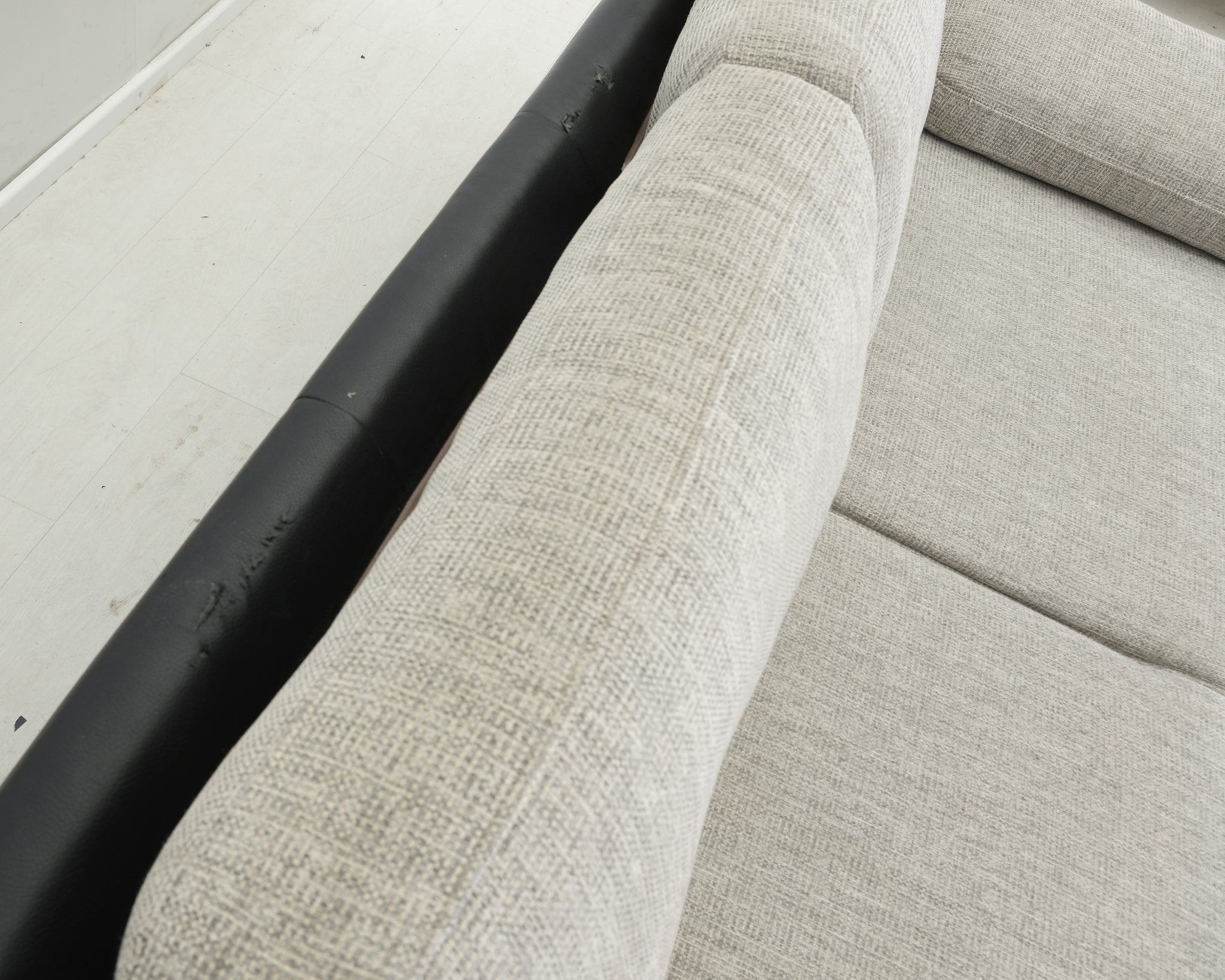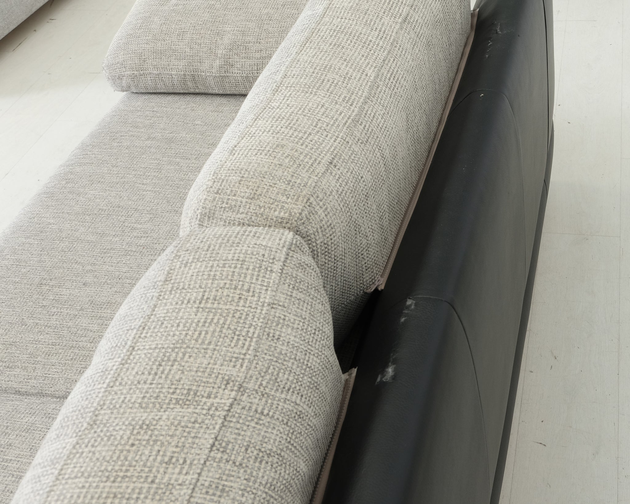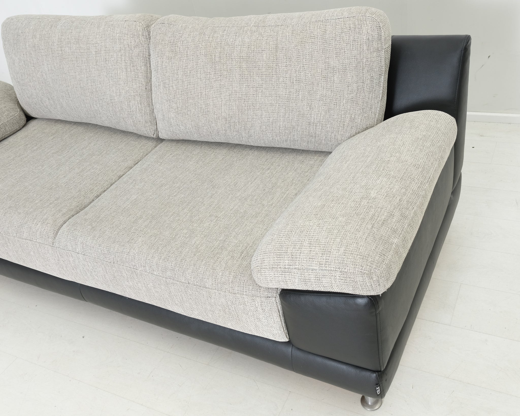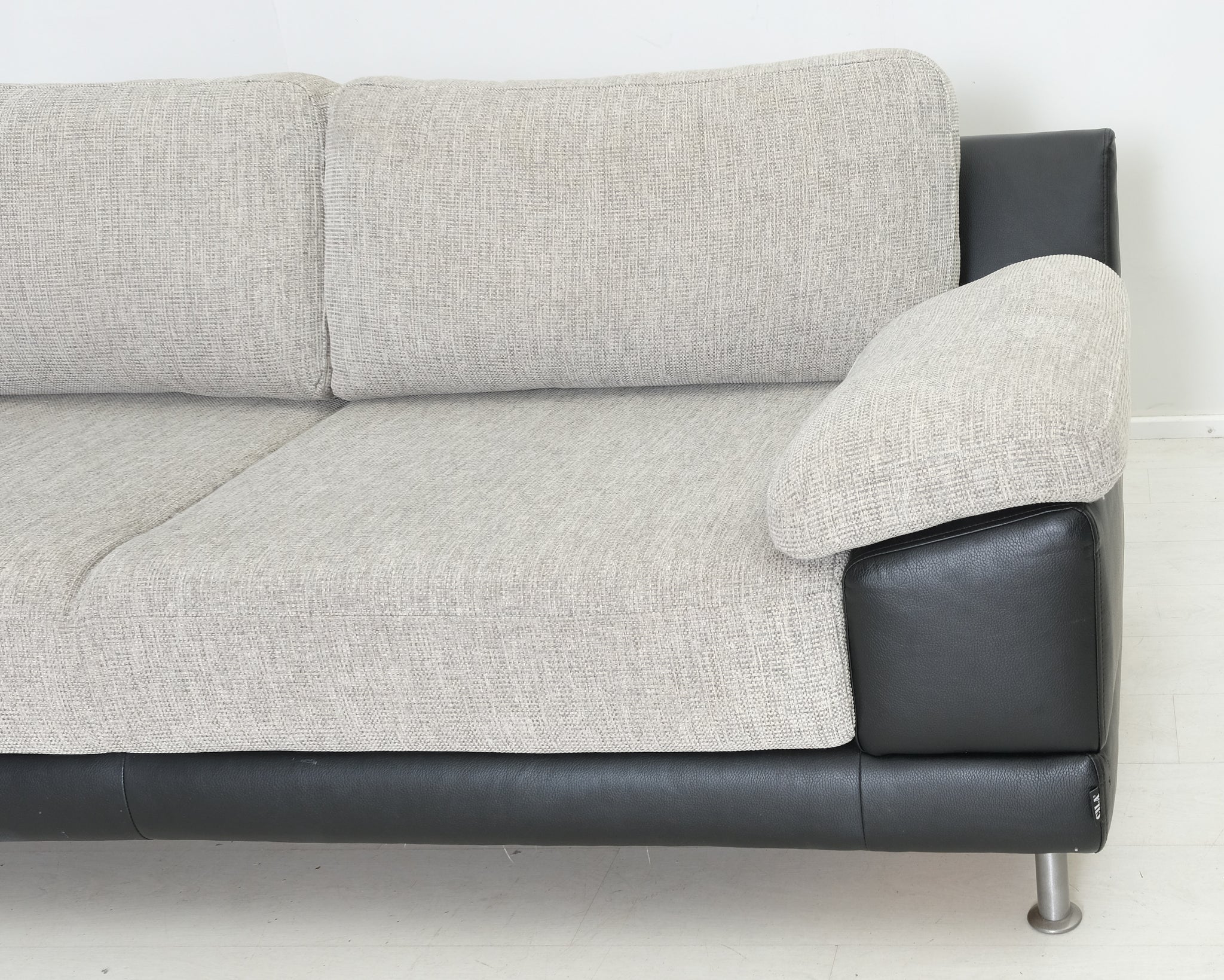 Mukava sohva minkä verhoilussa on yhdistetty mustaa nahkaa sekä beigenharmaata kangasta. Irrotettavat selkänojantyynyt.