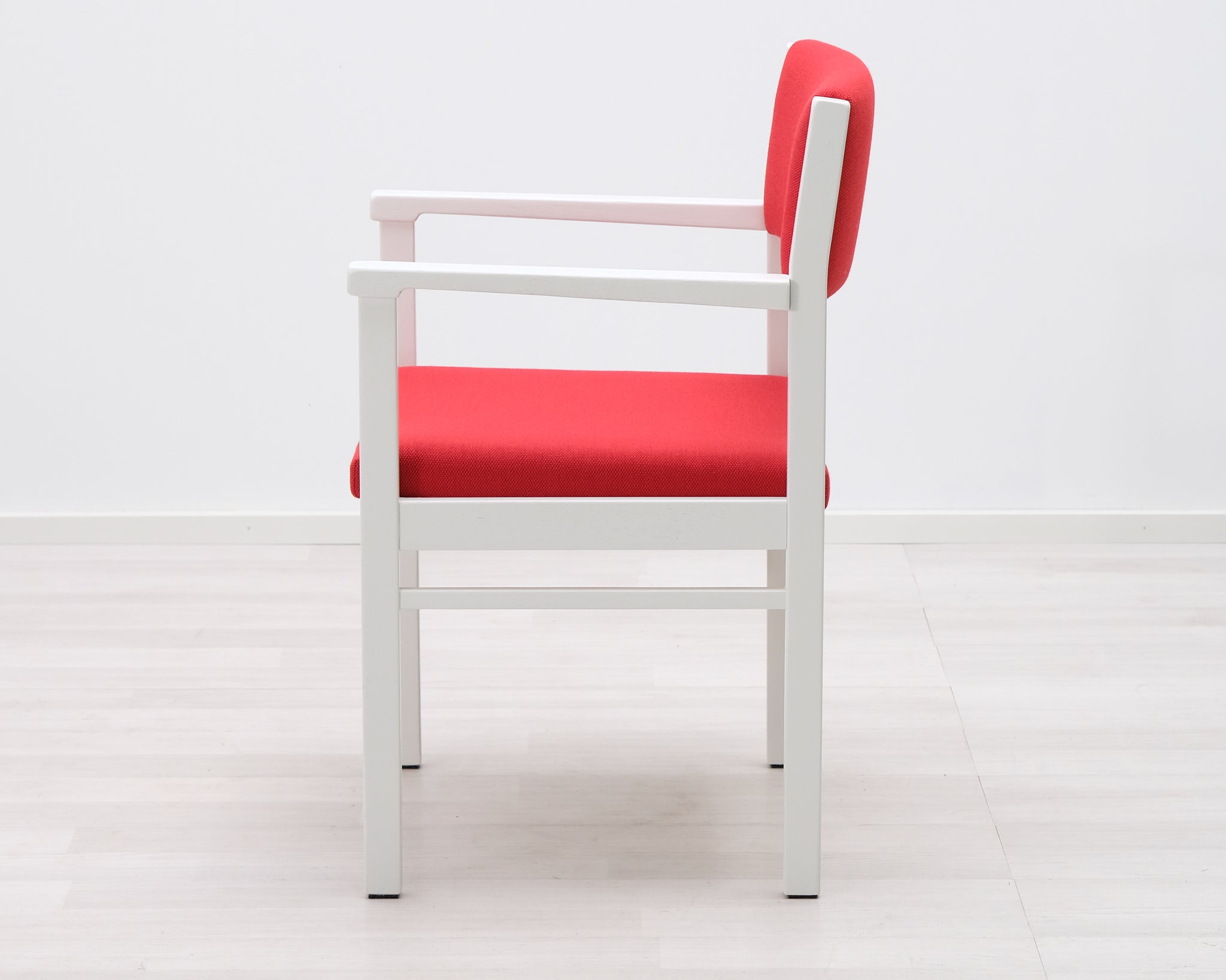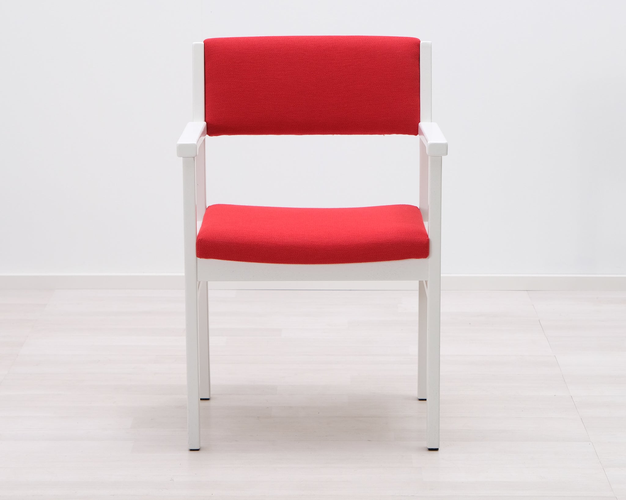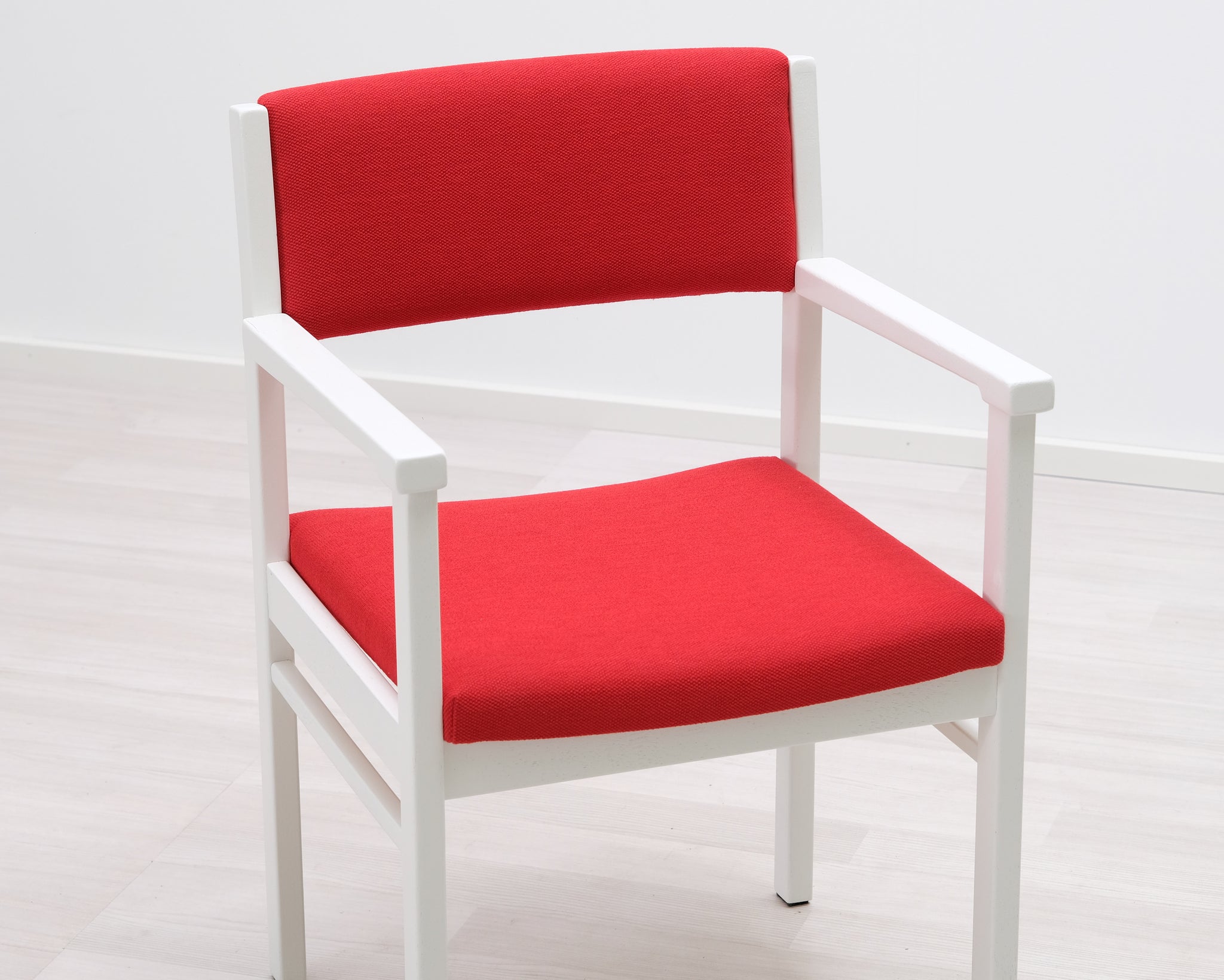 Askon valmistama punavalkoinen tuoli. Leikkisän, mutta selkeän ilmeen omaavassa tuolissa on kangasverhoiltu istuin ja selkänoja.