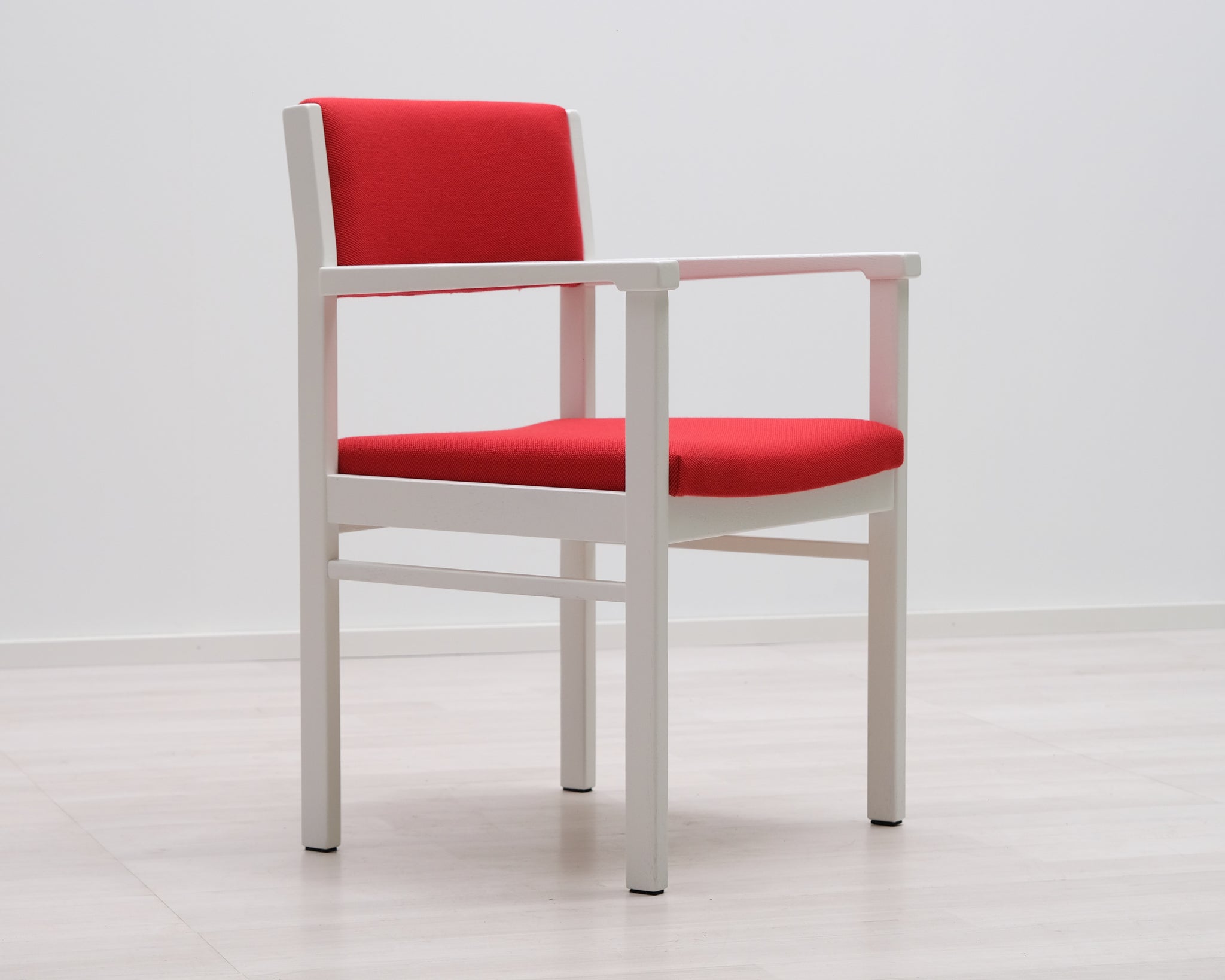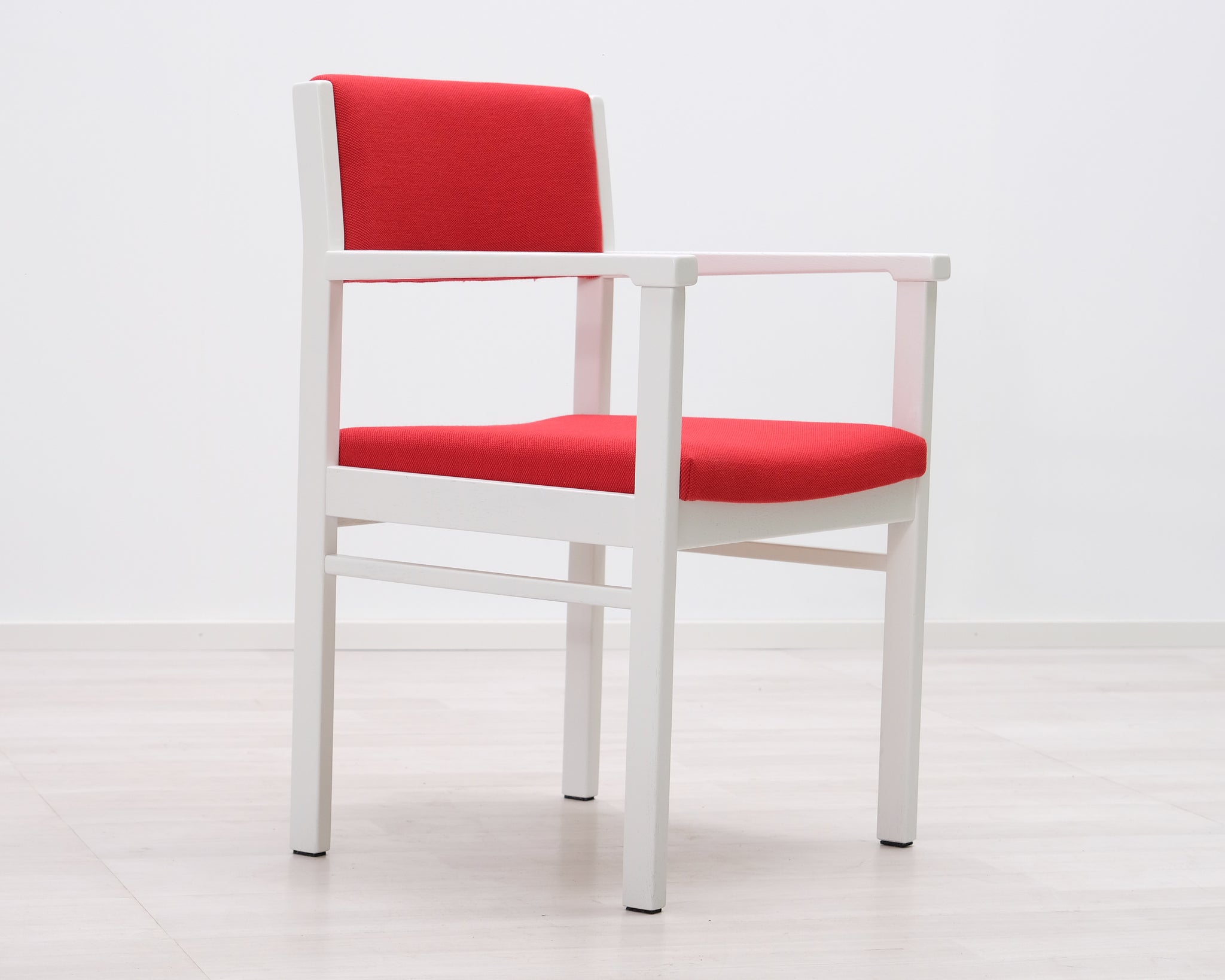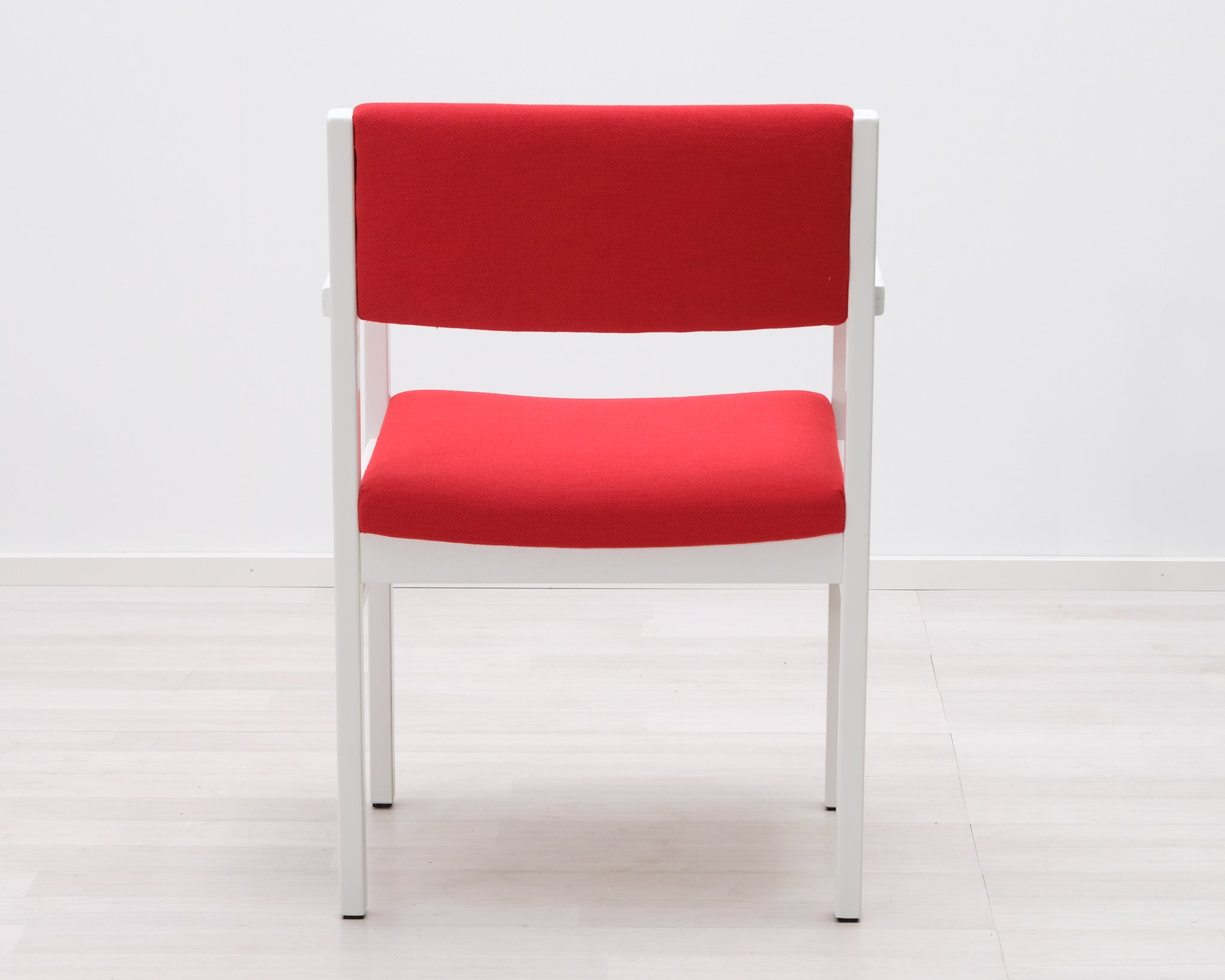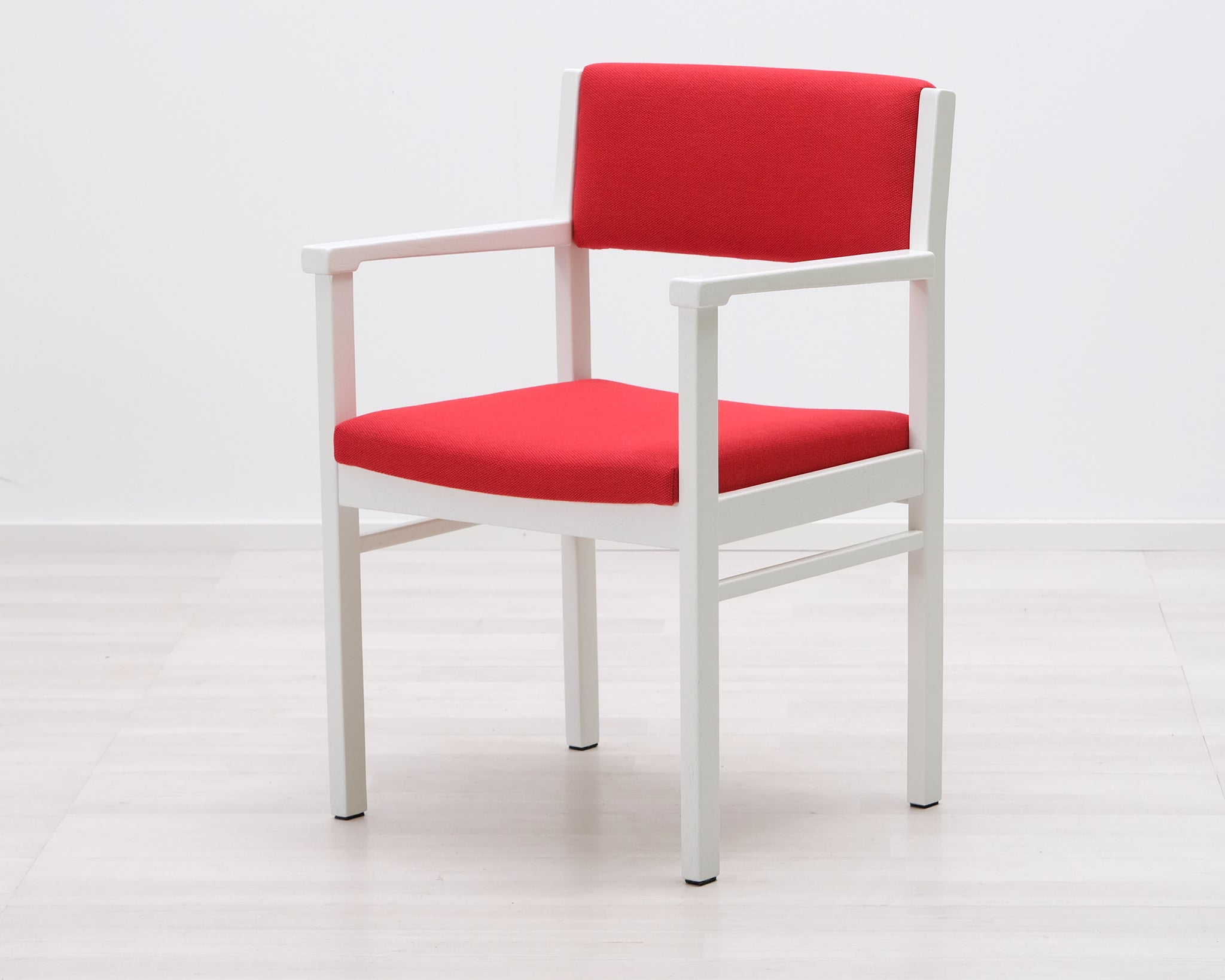 Askon valmistama punavalkoinen tuoli. Leikkisän, mutta selkeän ilmeen omaavassa tuolissa on kangasverhoiltu istuin ja selkänoja.