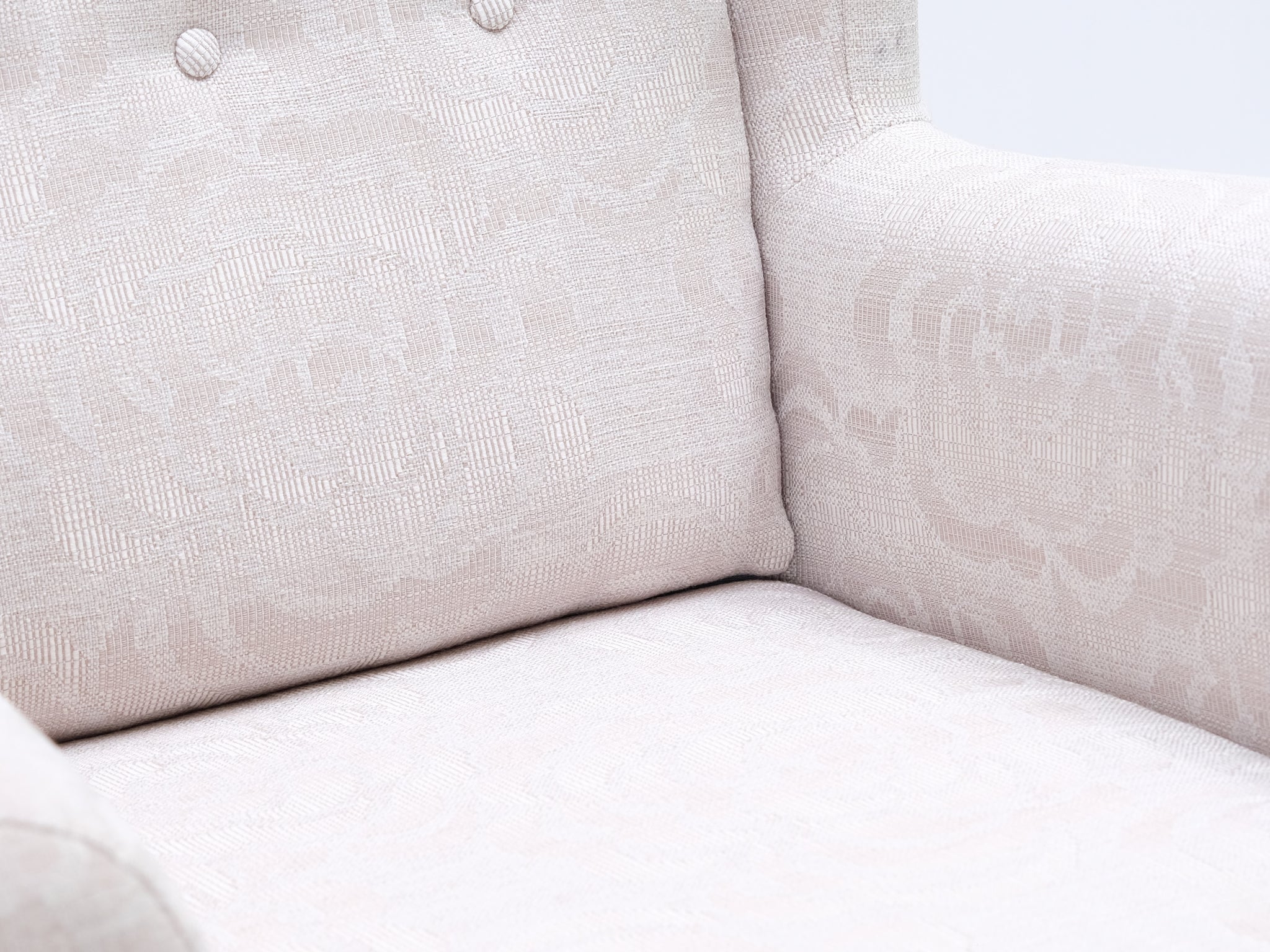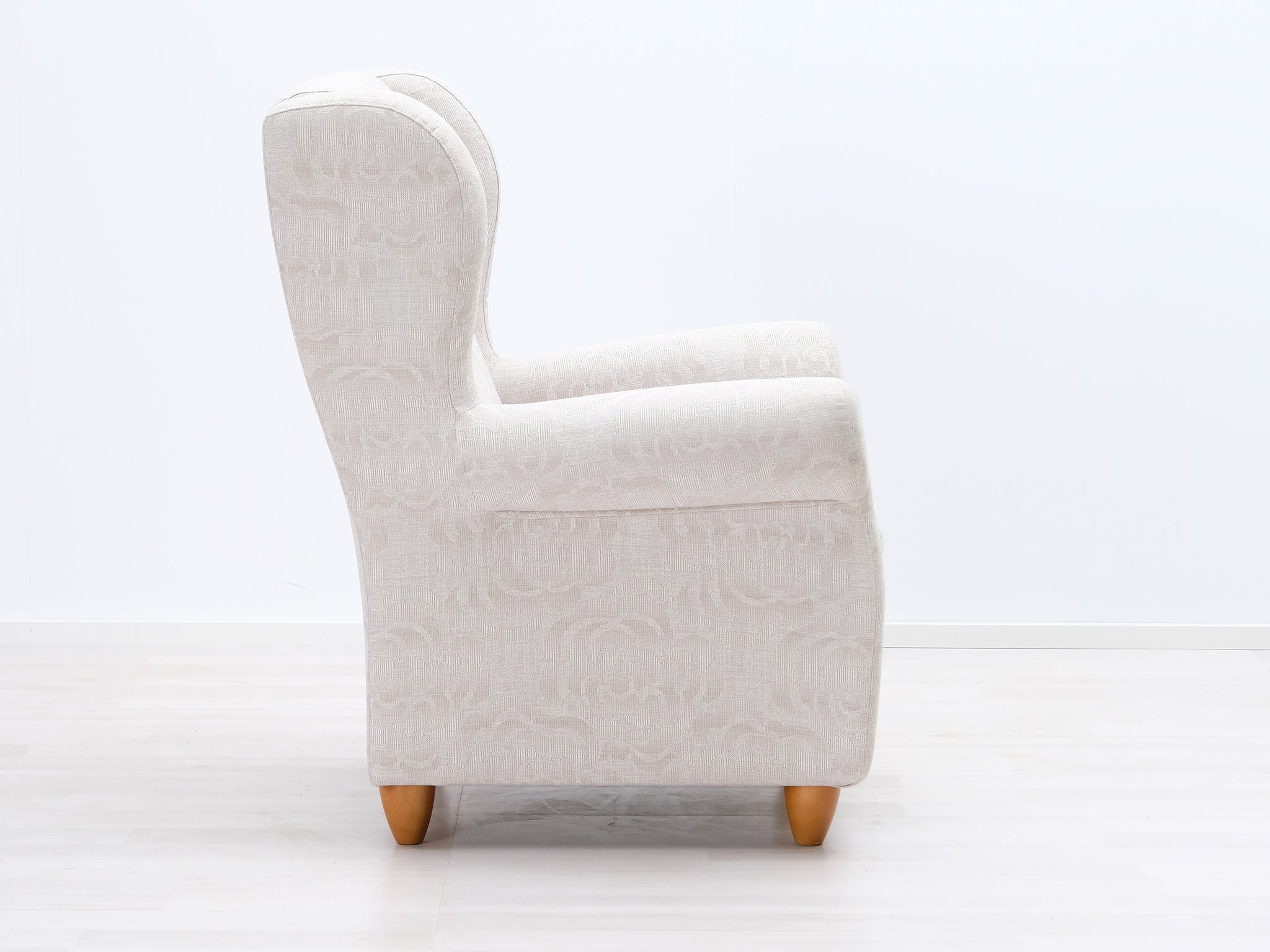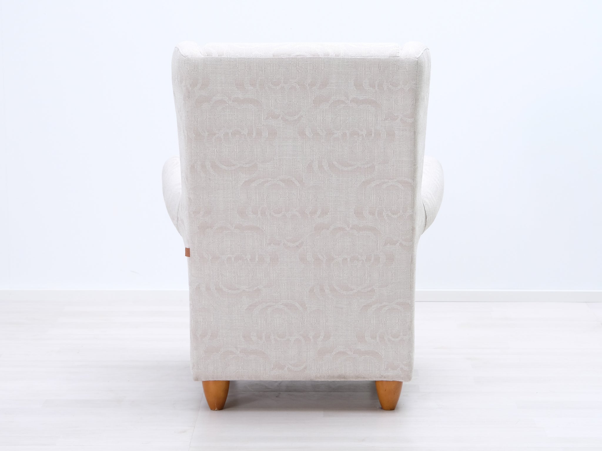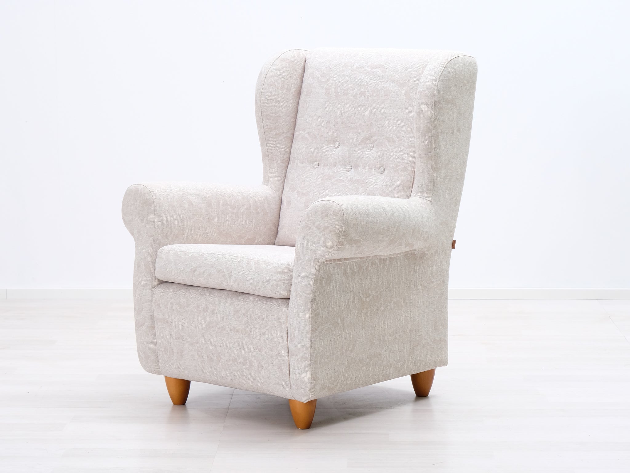 Askon klassinen nojatuoli. Nojatuolissa on kaunis kuviollinen verhoilu sekä mukavat pyöristetyt käsinojat. Selkänojan napit viimeistelevät ilmeen.
