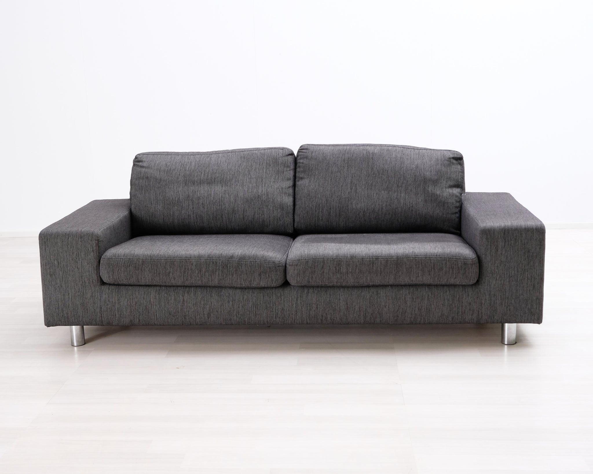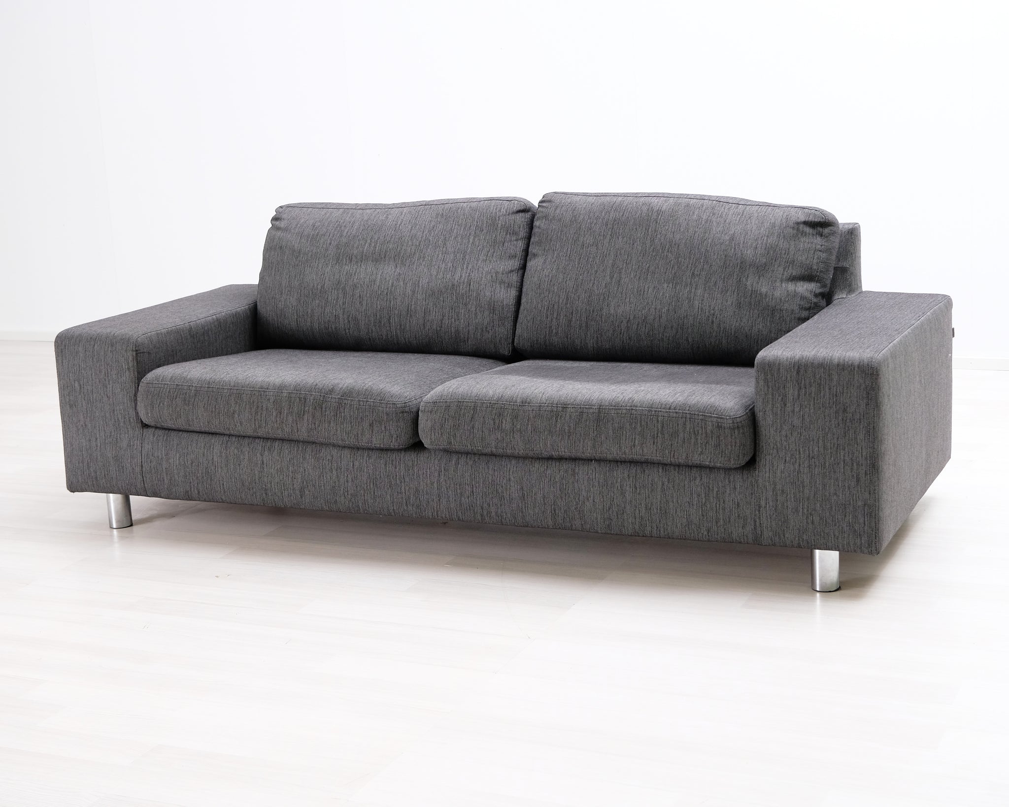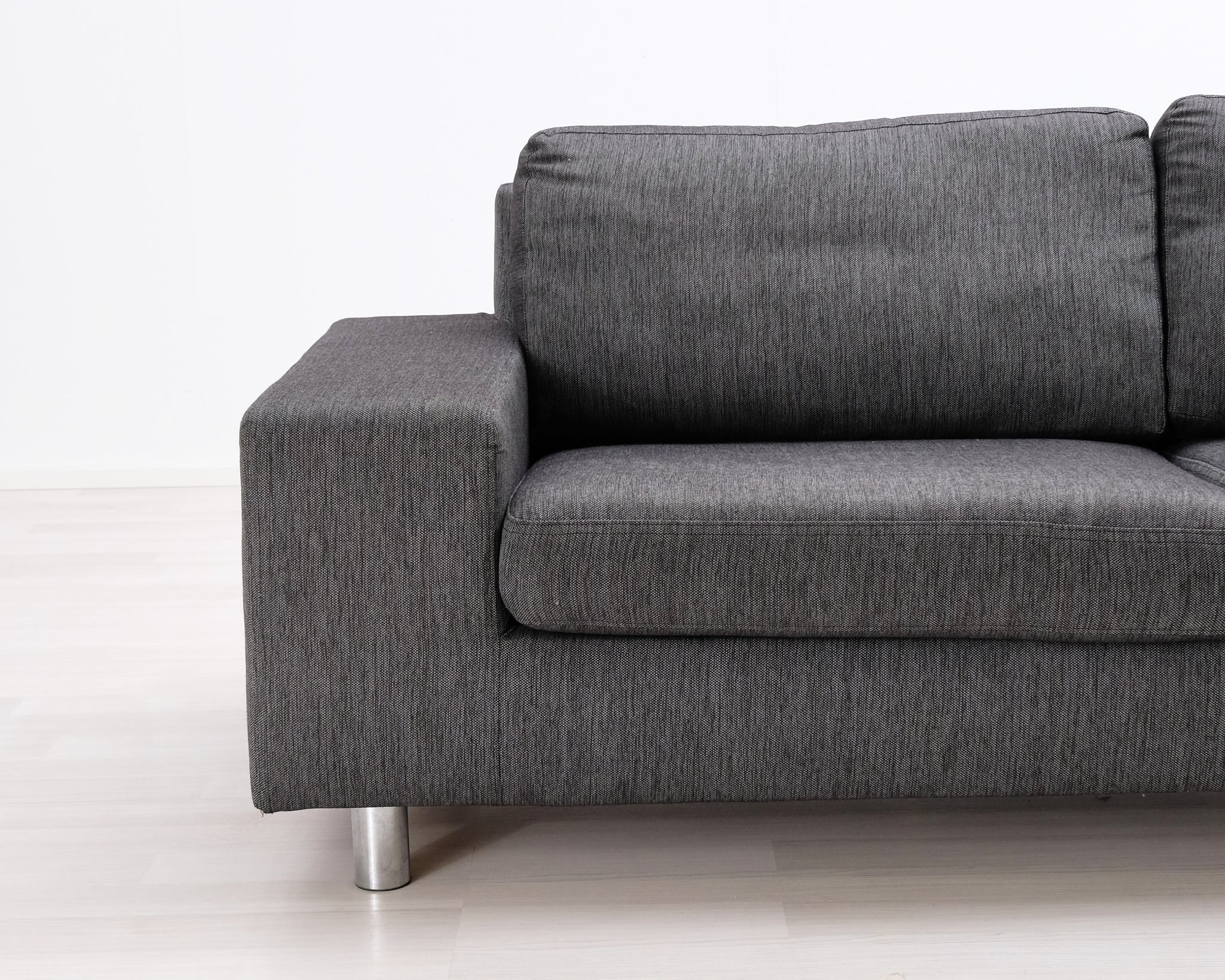 Harmaa sohva sopii mainiosti useimpiin sisustustyyleihin ja tiloihin. Pyöreät metalliset jalat.