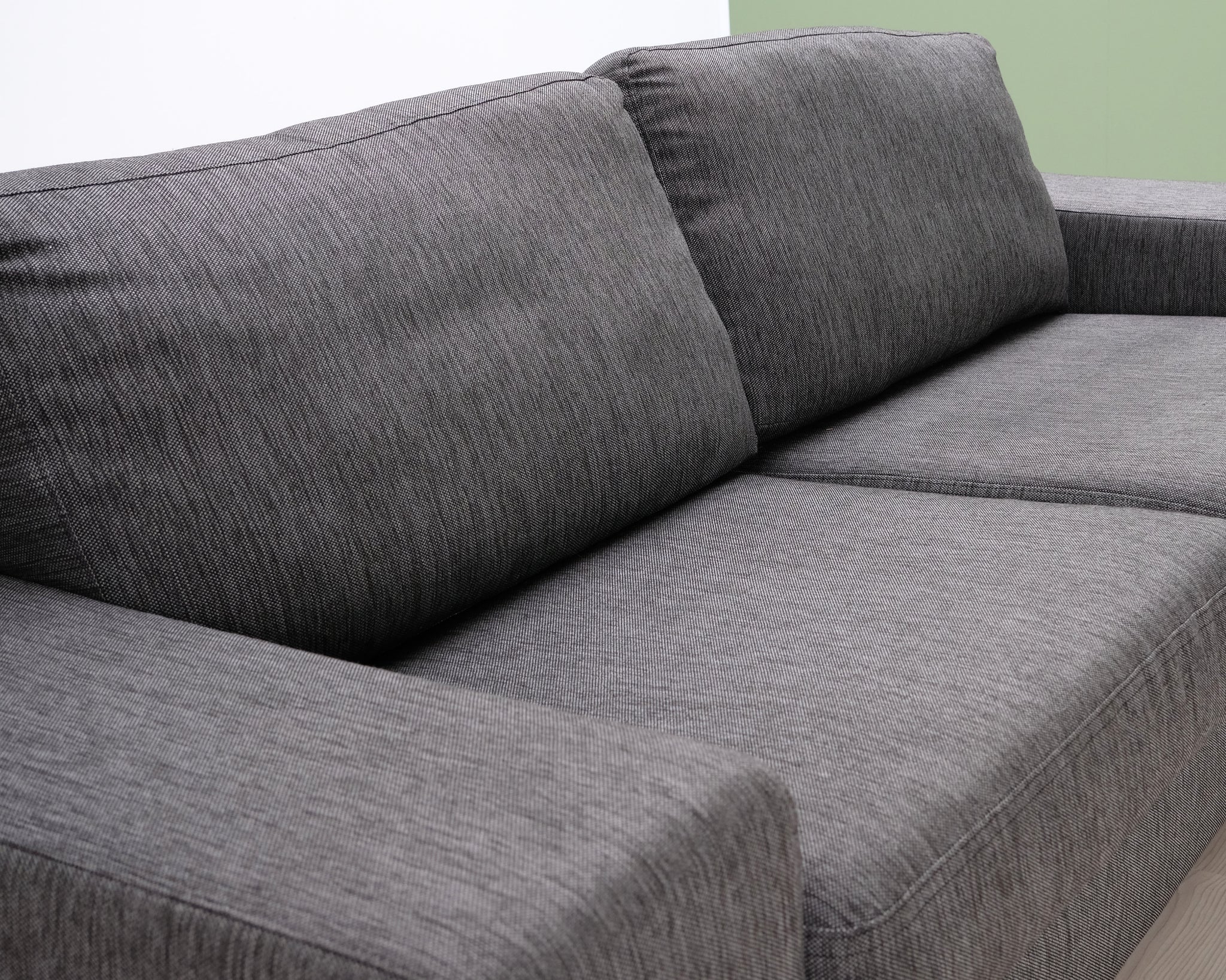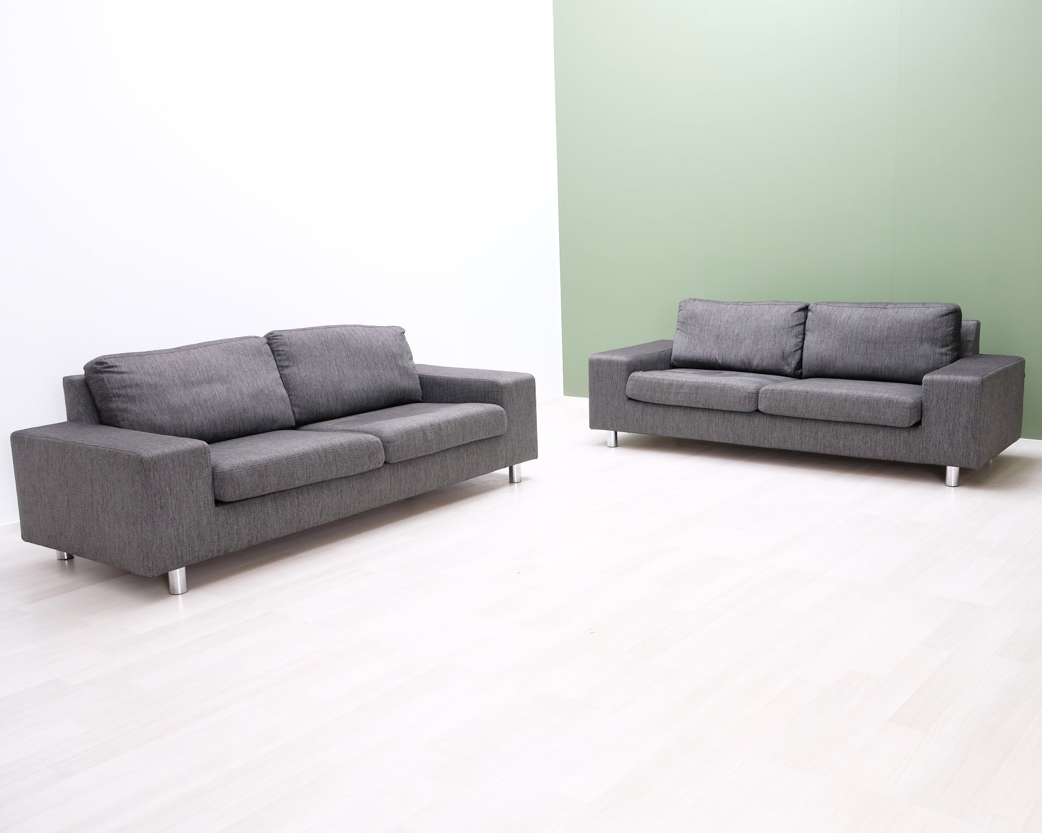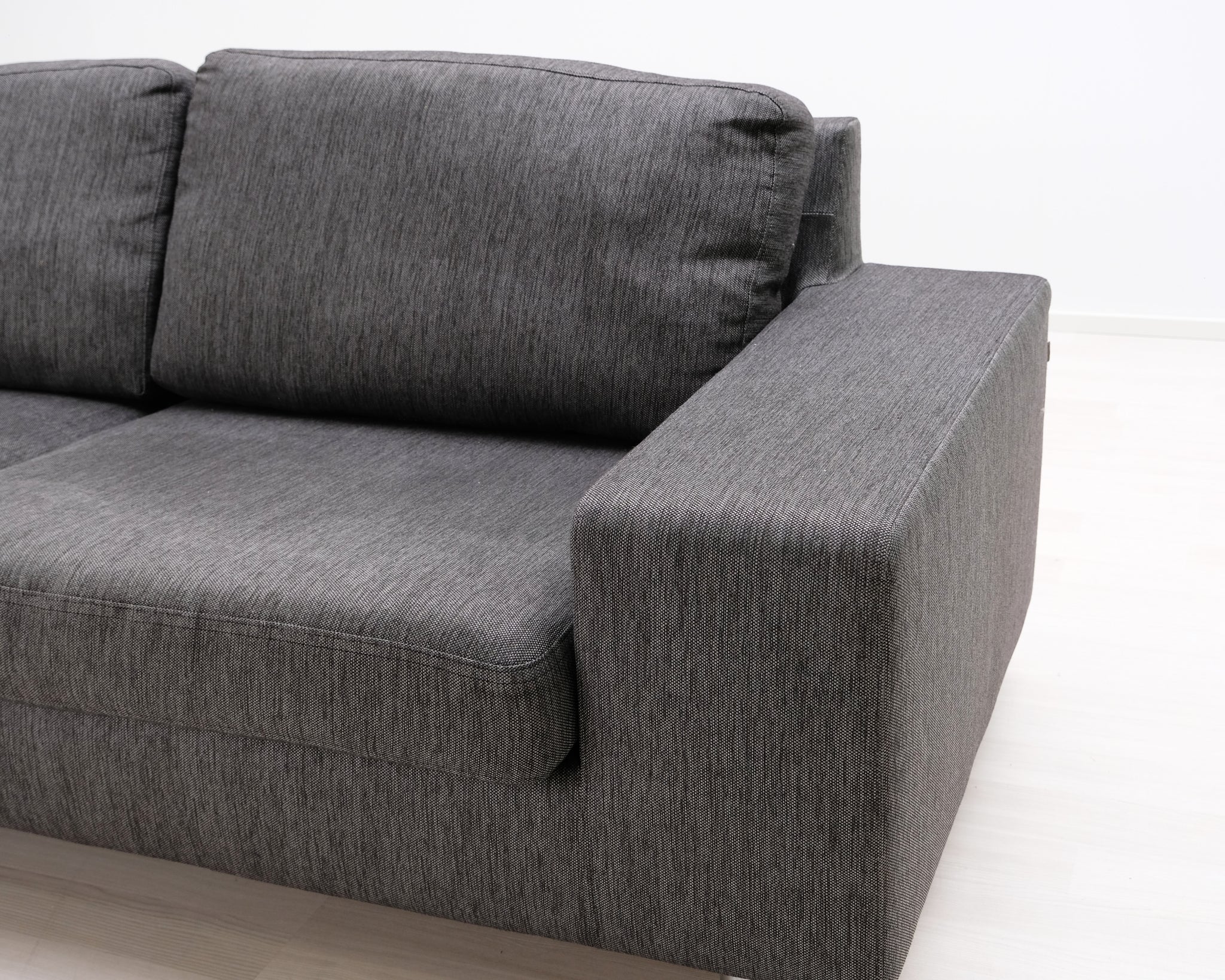 Harmaa sohva sopii mainiosti useimpiin sisustustyyleihin ja tiloihin. Pyöreät metalliset jalat.