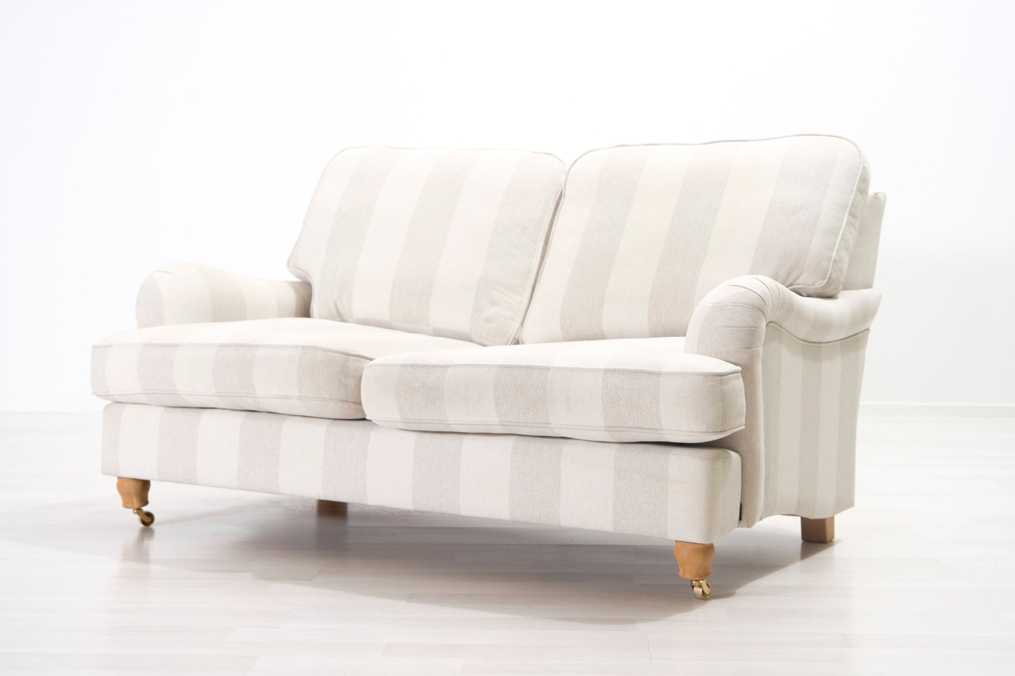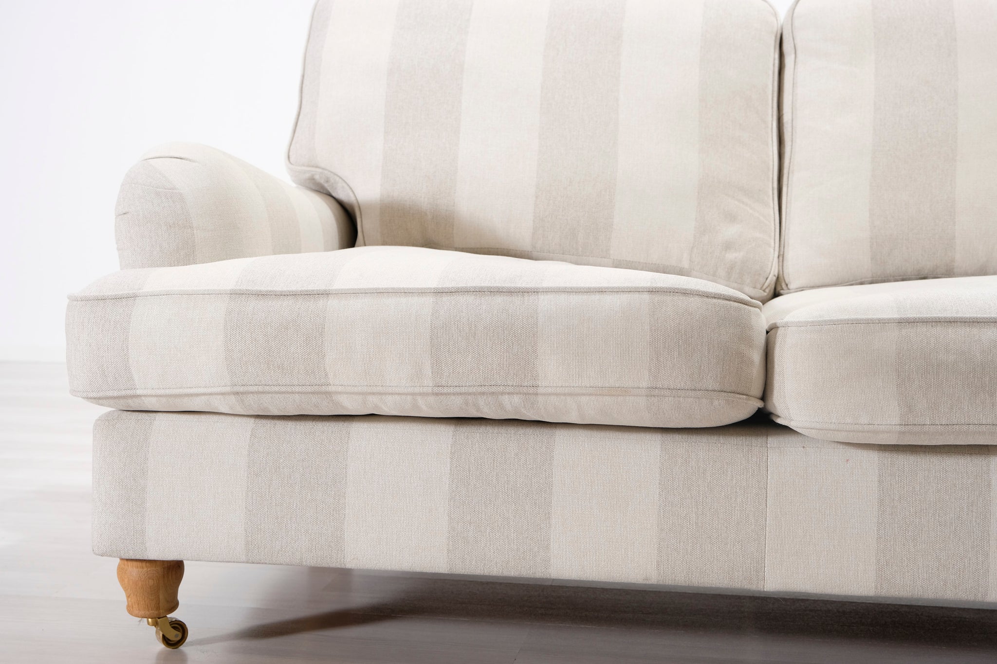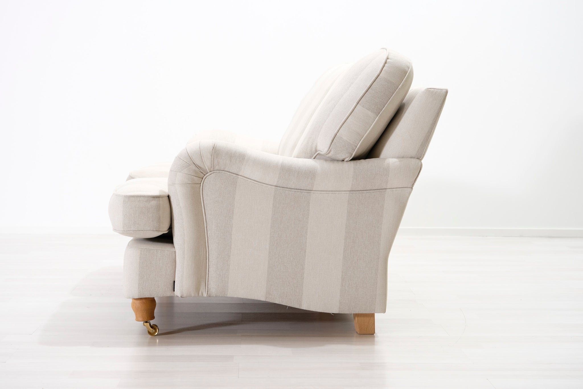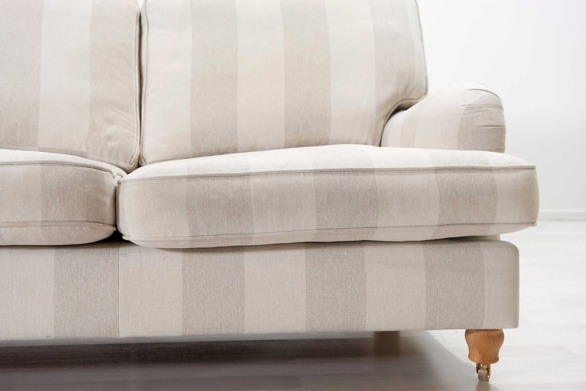 Klassinen Oxford-tyylinen sohva. Kaunis raidallinen kangasverhoilu vaalean beigen ja harmaan sävyissä.
