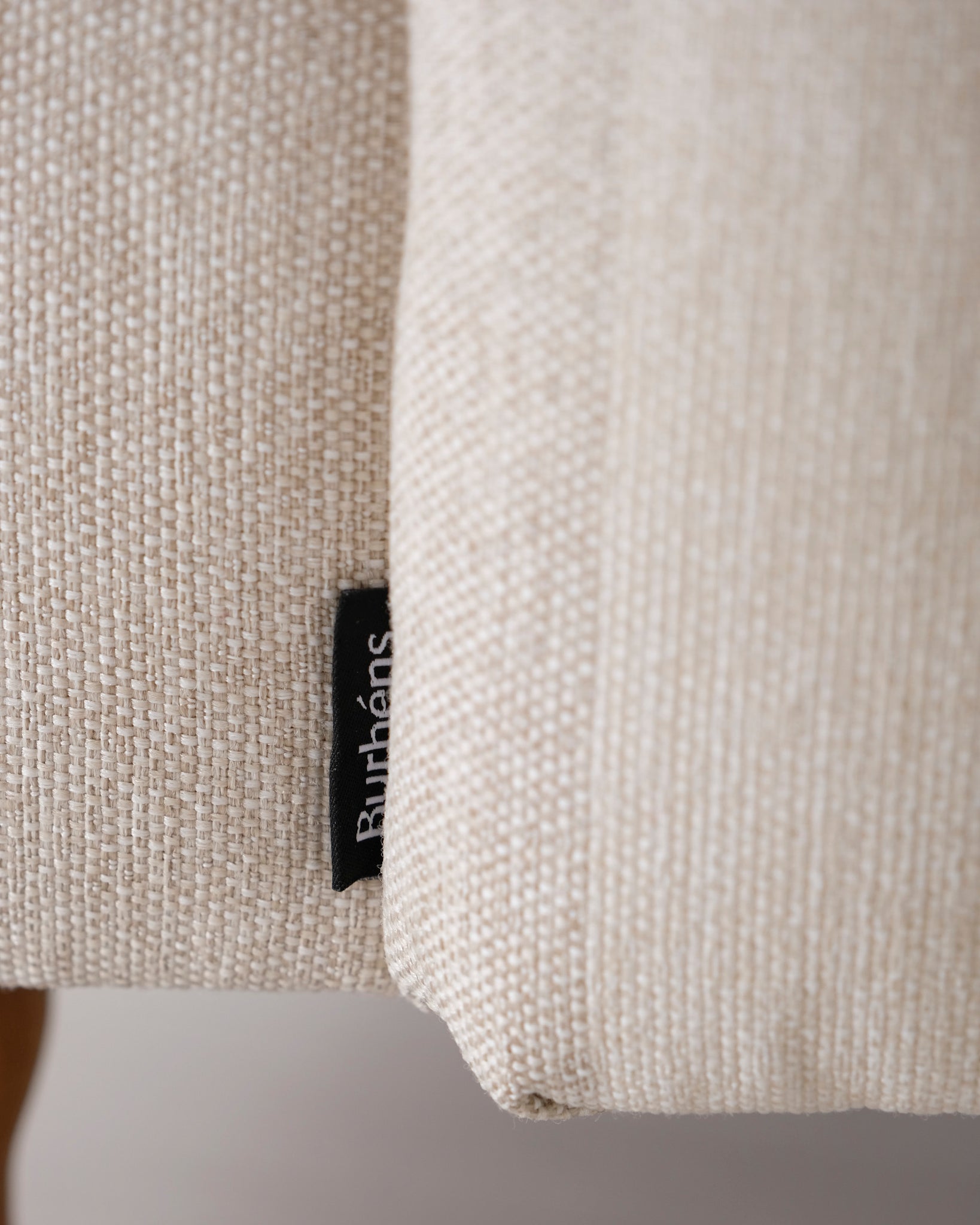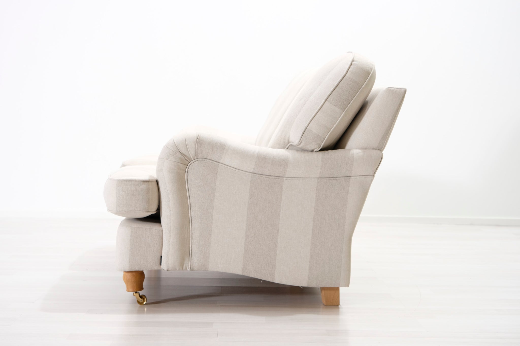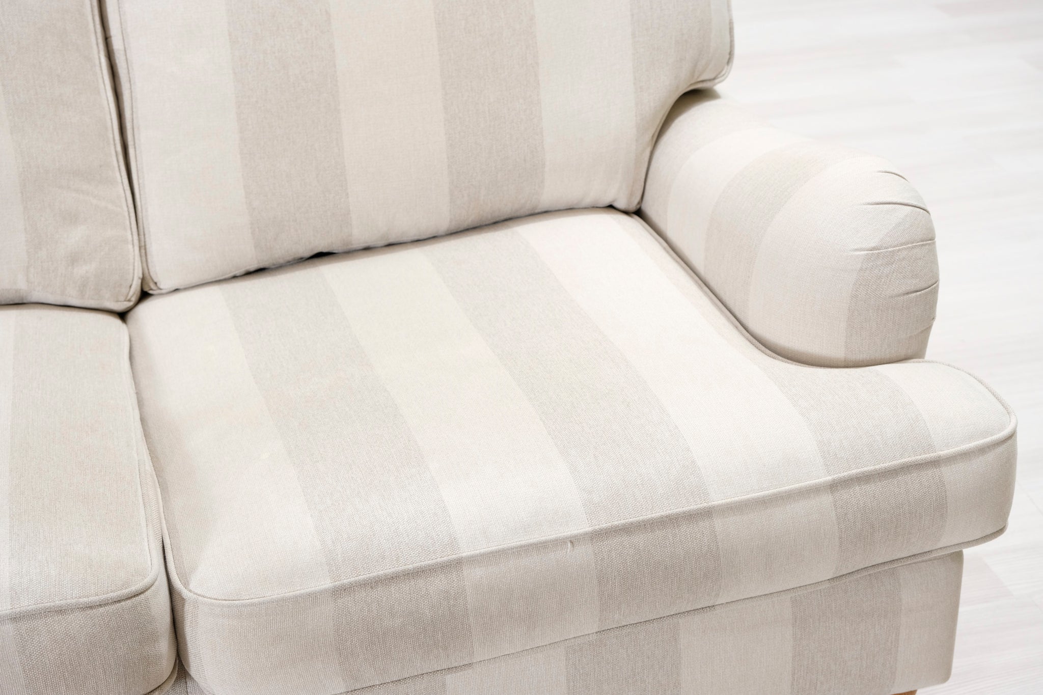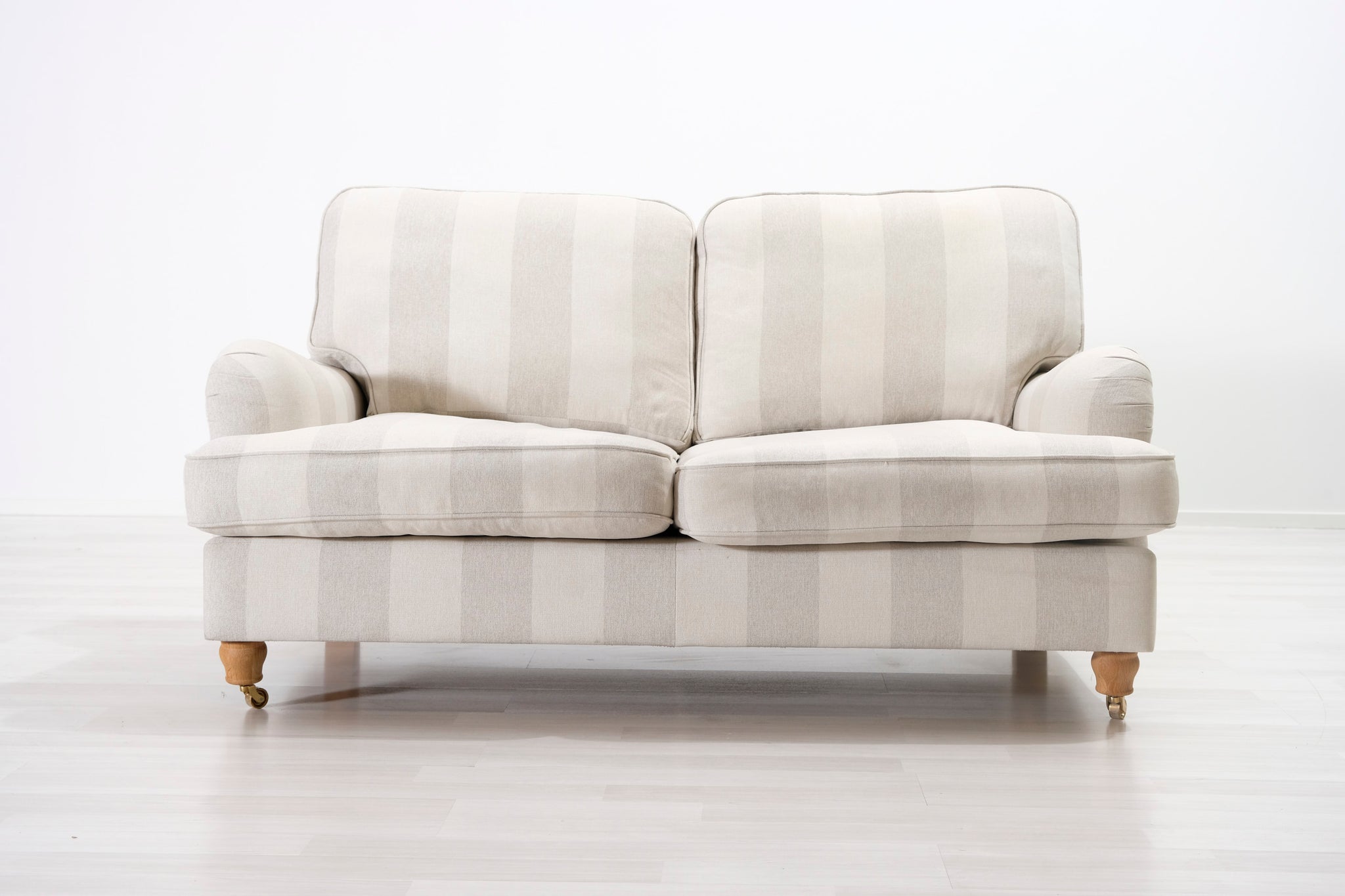 Klassinen Oxford-tyylinen sohva. Kaunis raidallinen kangasverhoilu vaalean beigen ja harmaan sävyissä.