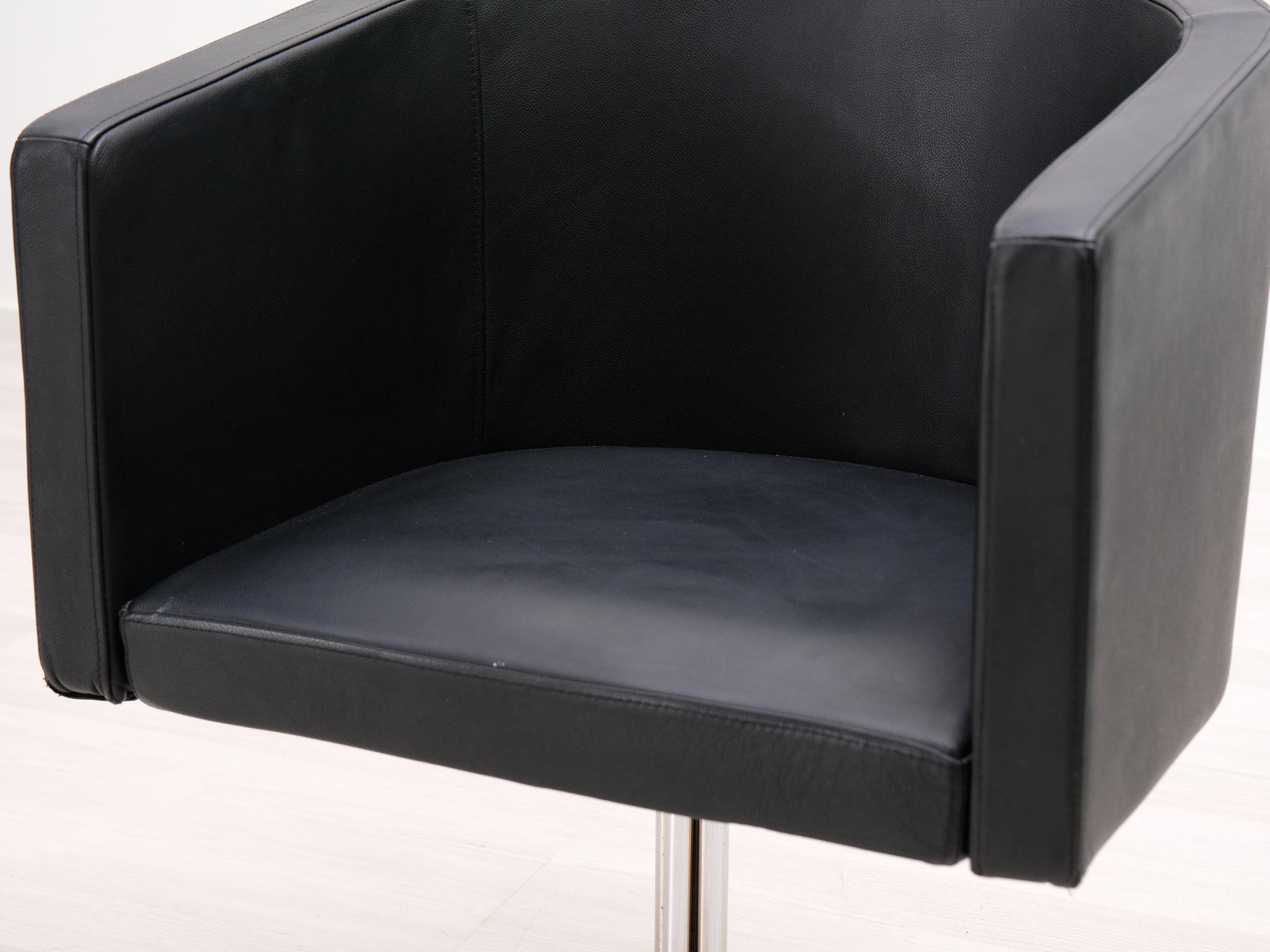 Moderni nahkainen nojatuoli. Tyylikäs design, joka tuo ripauksen luksusta sisustukseen. Tuolissa metallinen pyörivä jalka.