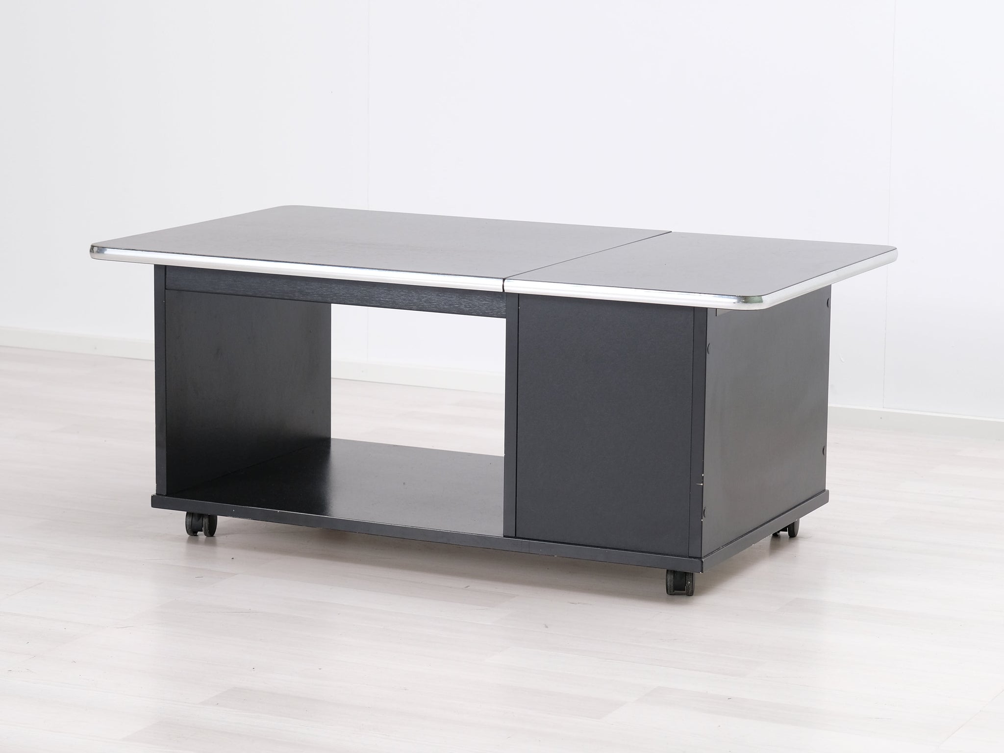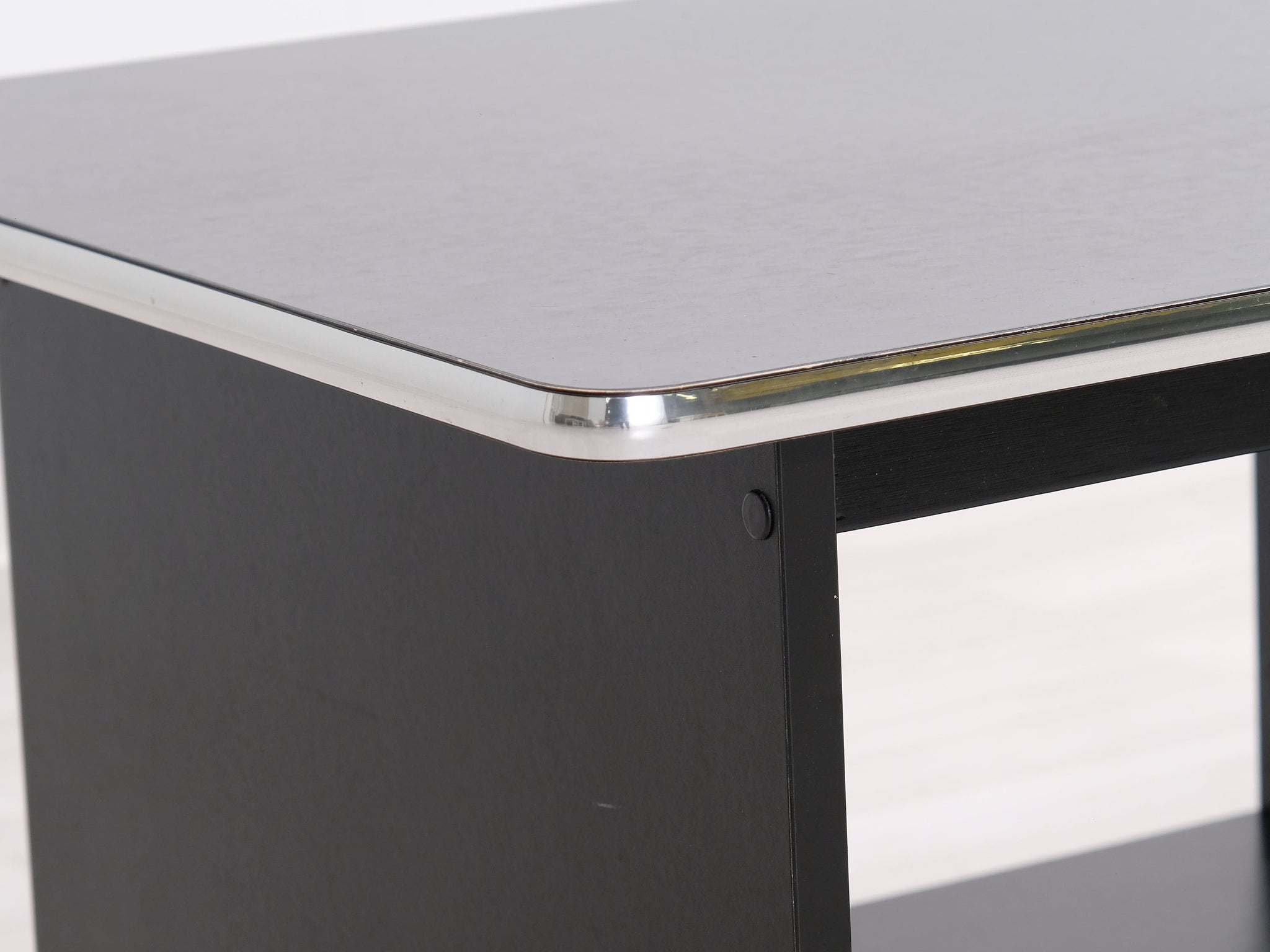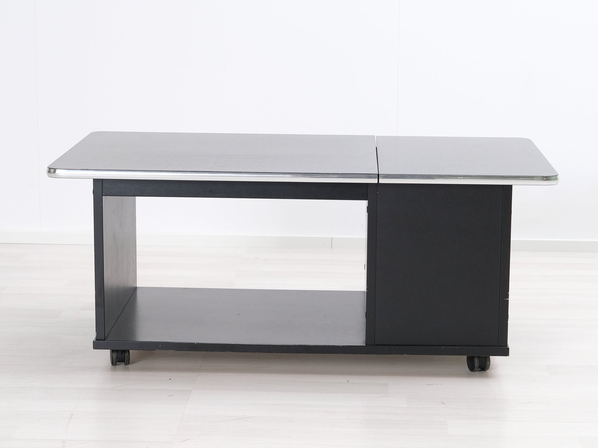 Kotimaisen Askon valmistama musta sohvapöytä. Pöytälevyä reunustaa metallikehys.