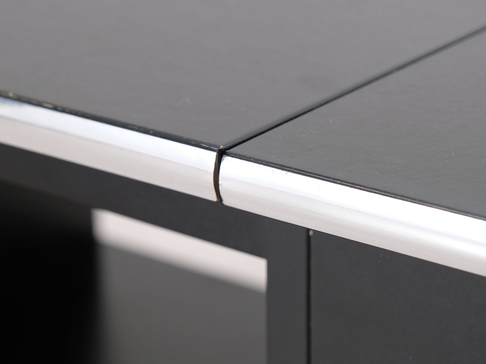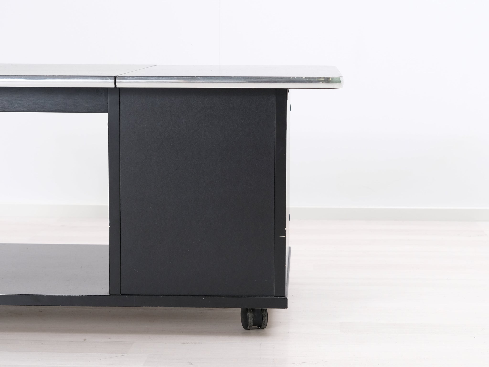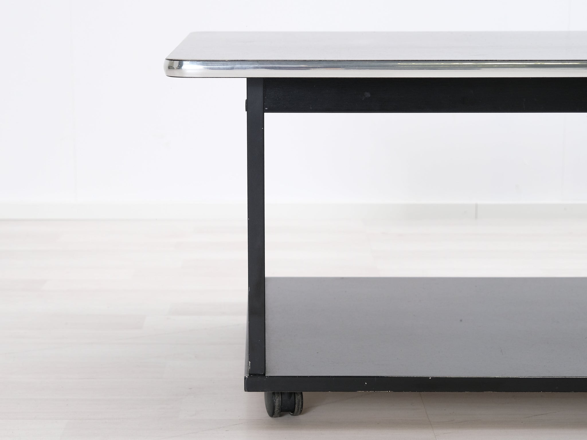 Kotimaisen Askon valmistama musta sohvapöytä. Pöytälevyä reunustaa metallikehys.
