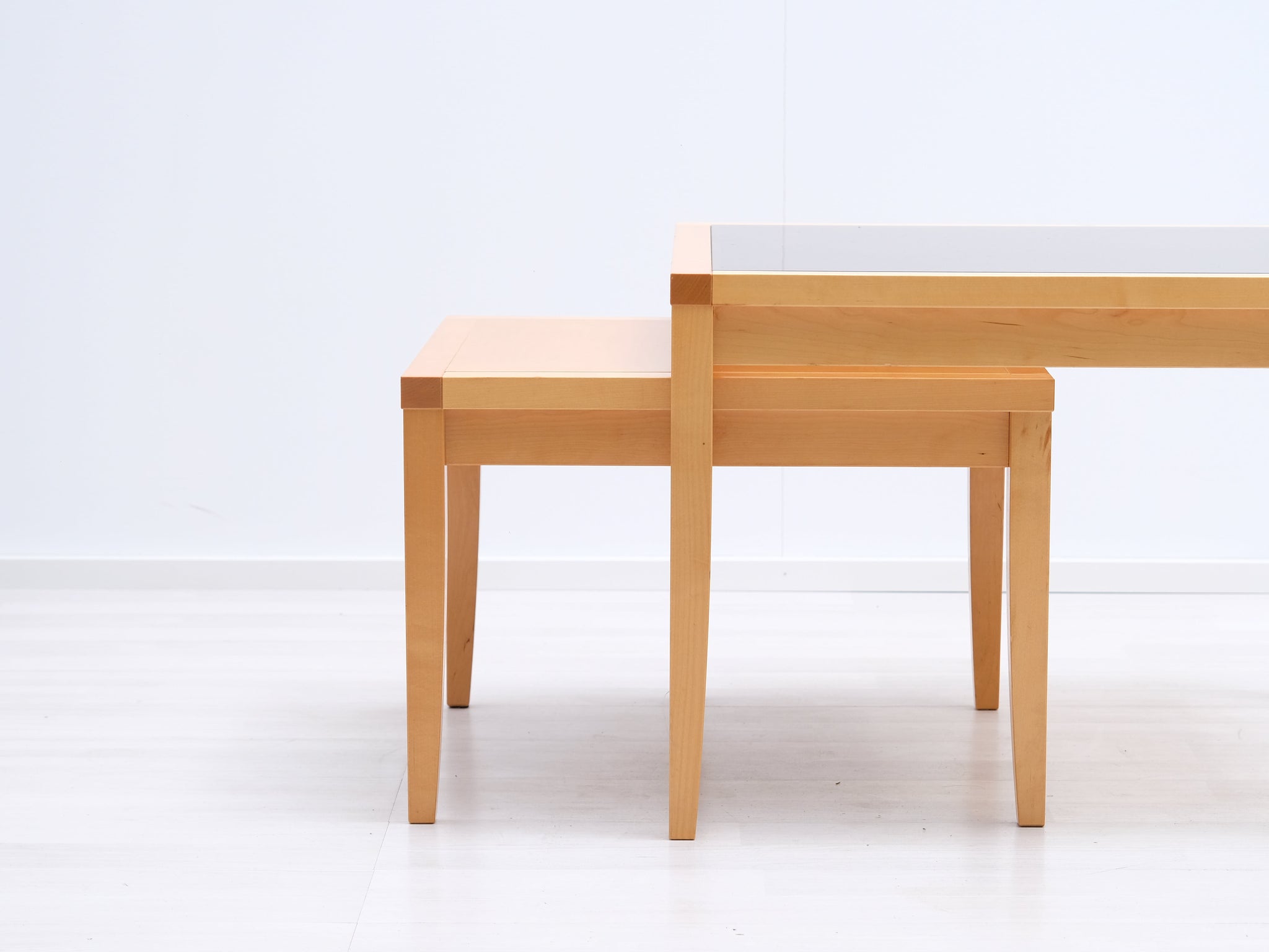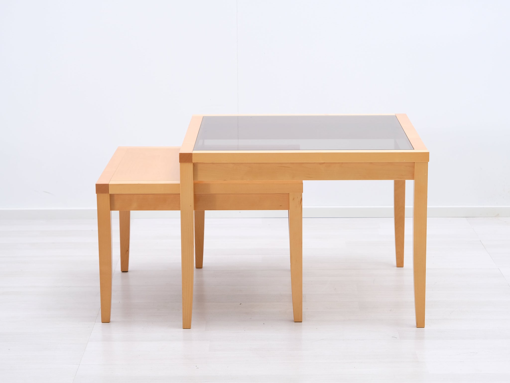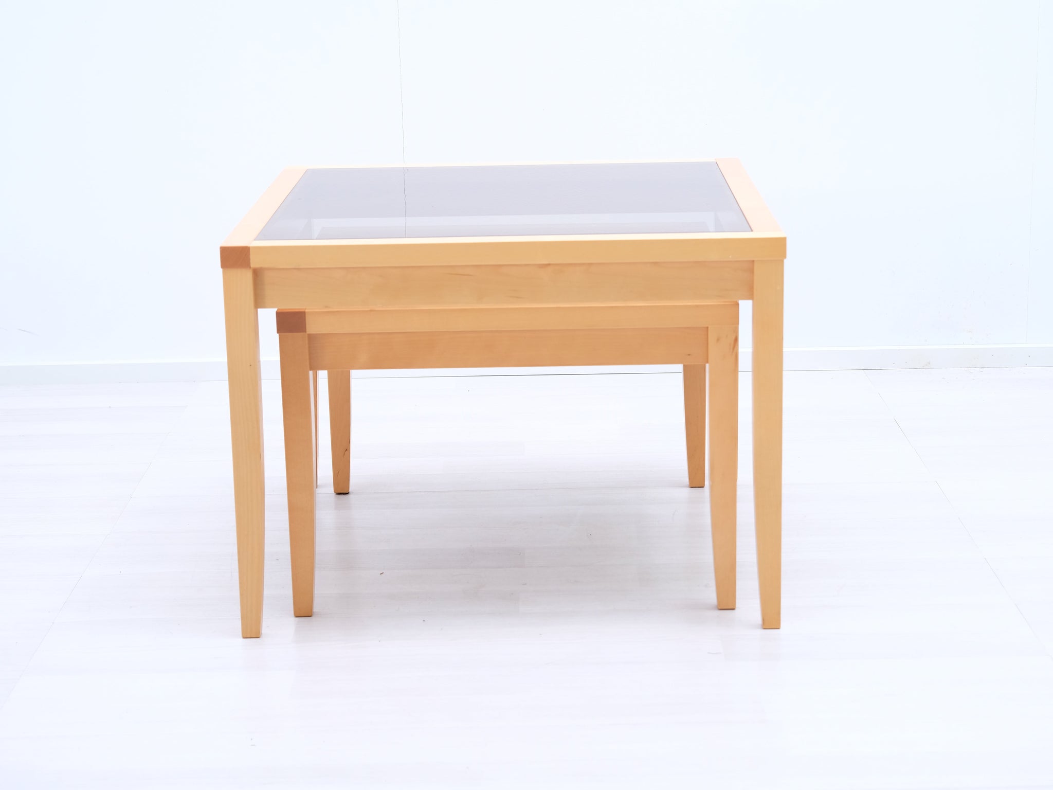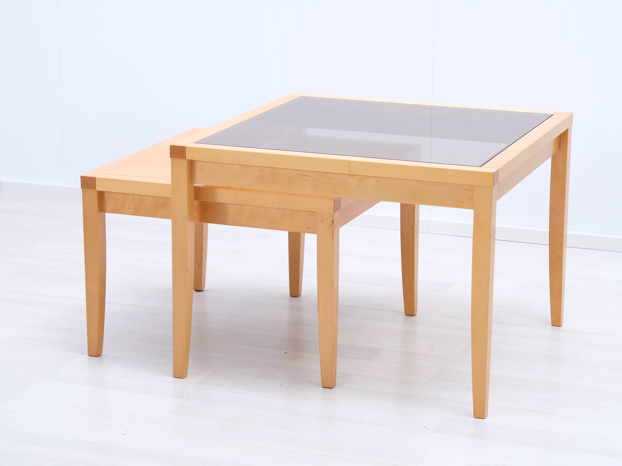 Kaksi erikokoista pyötää sisältävä sarjapöytä. Isomman pöydän pintaa koristaa lasilevy.