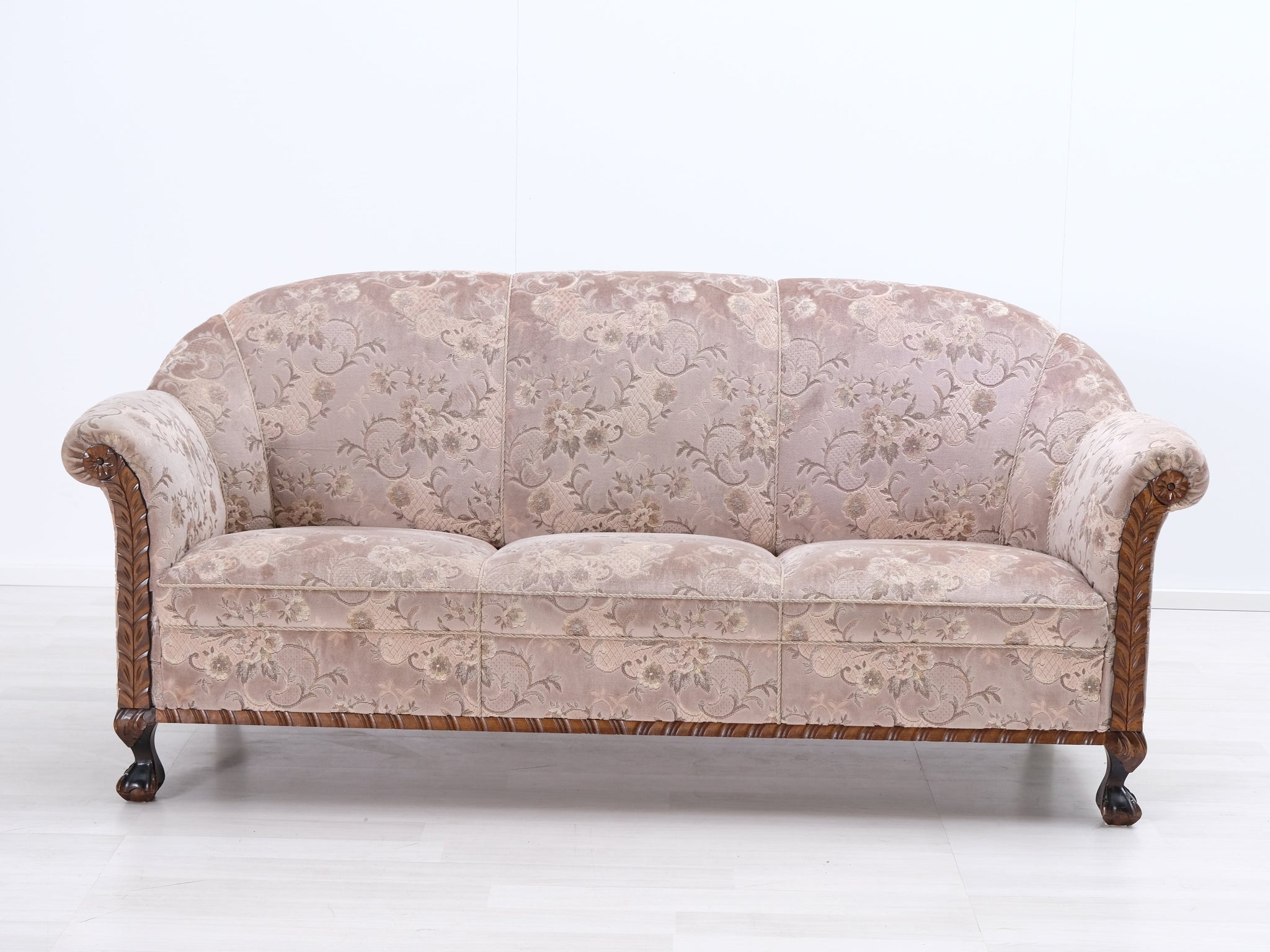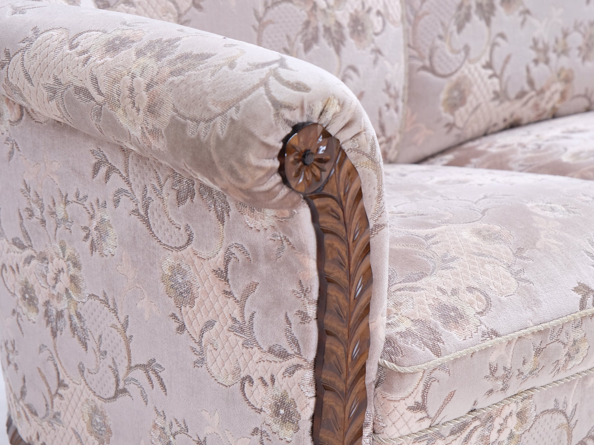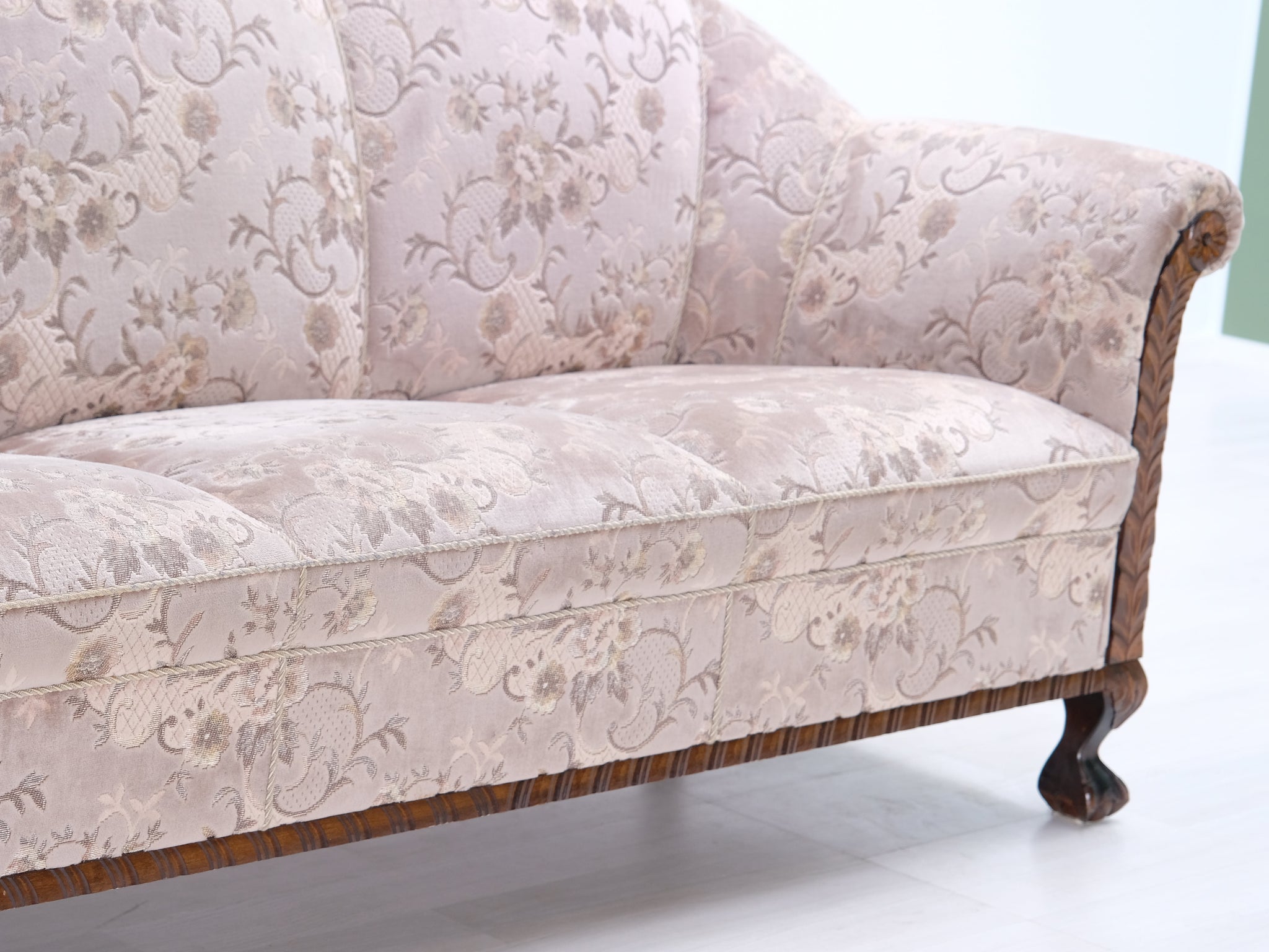 Chippendale-tyylinen sohva. Kukallinen verhoilu ja koristeellisia yksityiskohtia puuosissa.