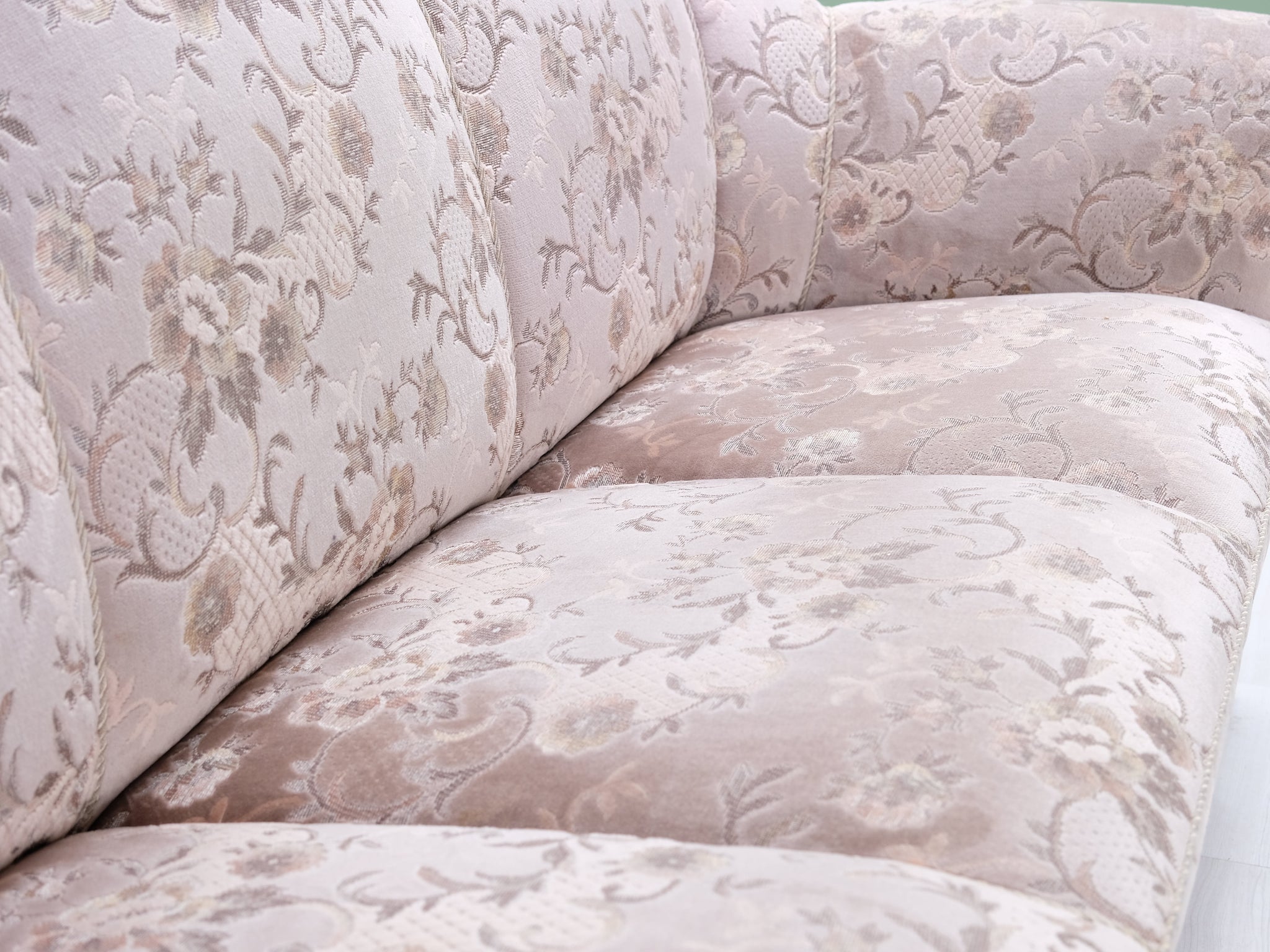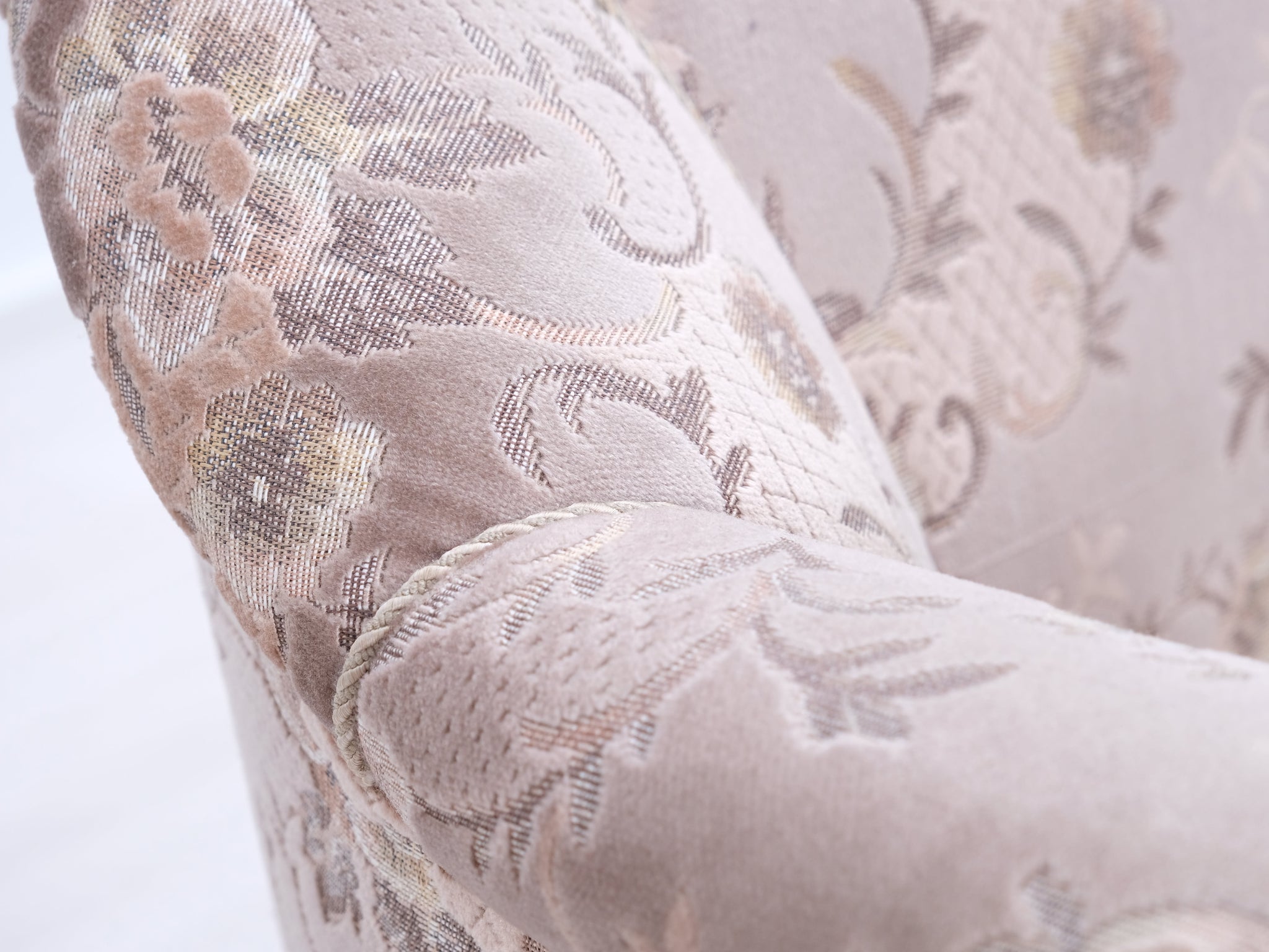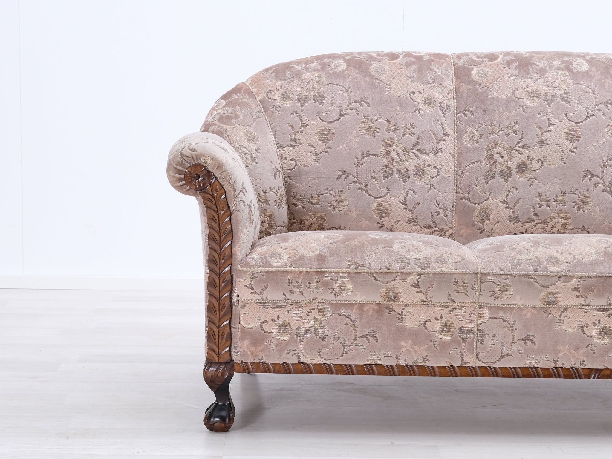 Chippendale-tyylinen sohva. Kukallinen verhoilu ja koristeellisia yksityiskohtia puuosissa.