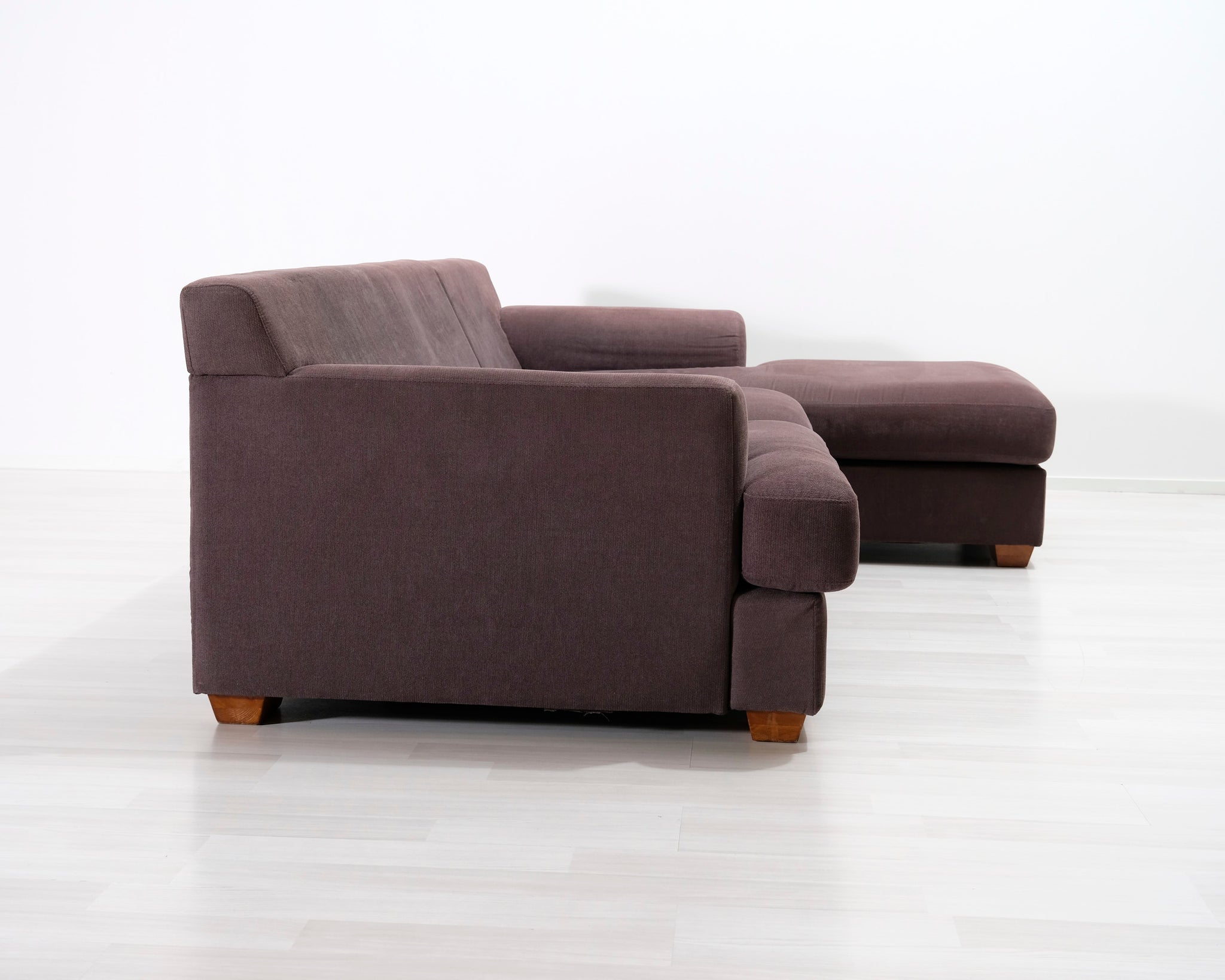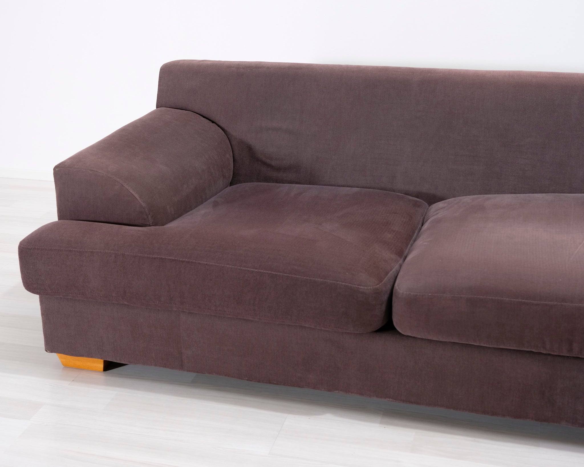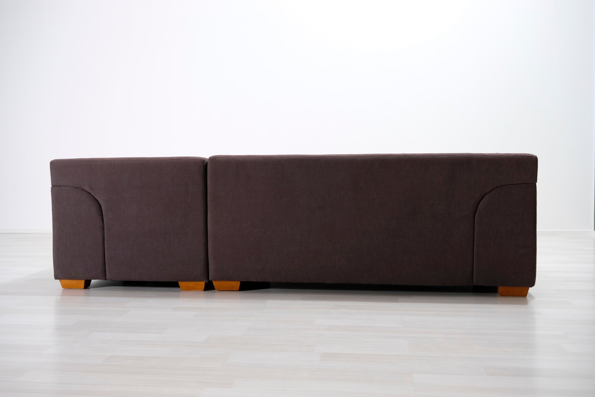 Ruskea divaanisohva, joka koostuu kahdesta osasta. Reilu istuinsyvyys ja matala selkänoja. Kangasverhoilu.