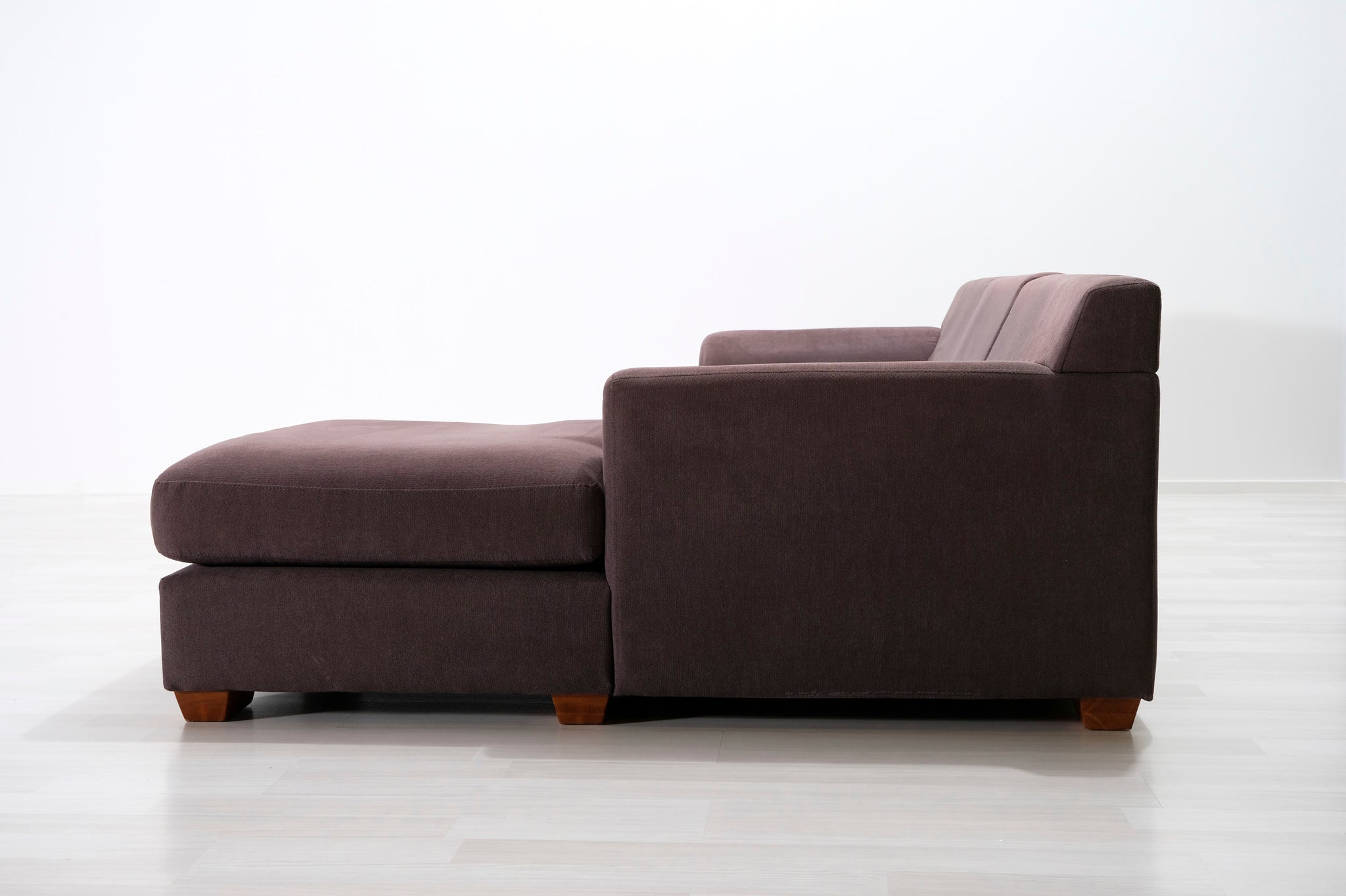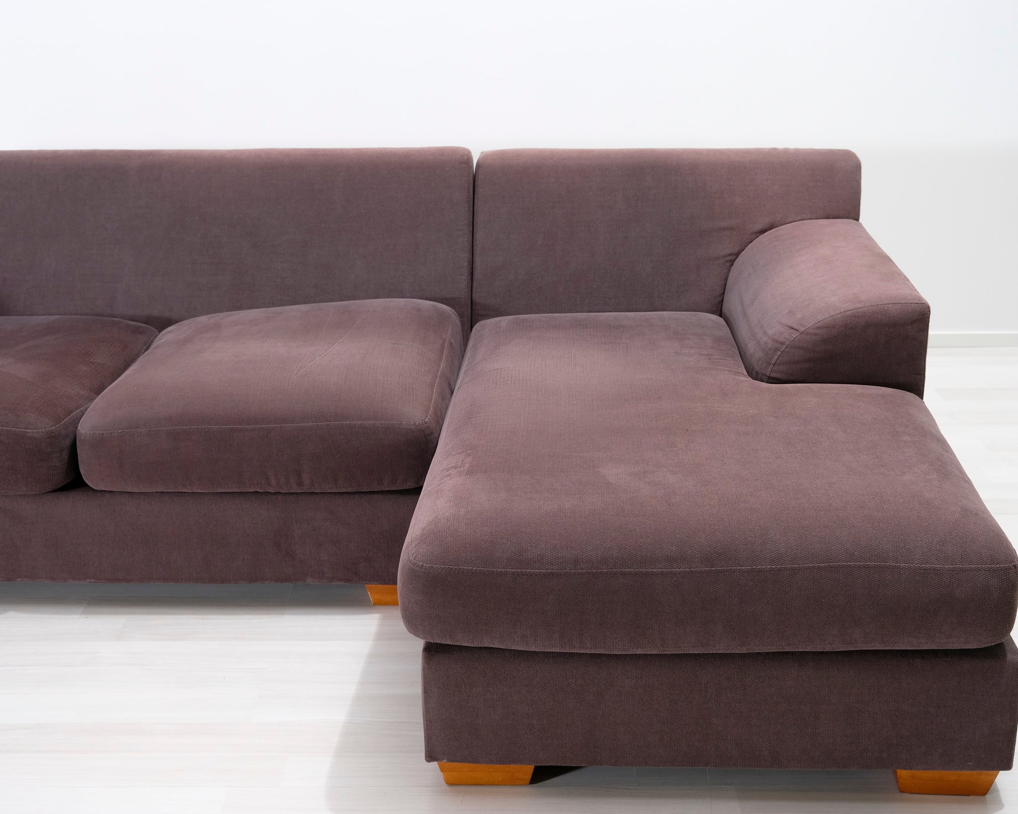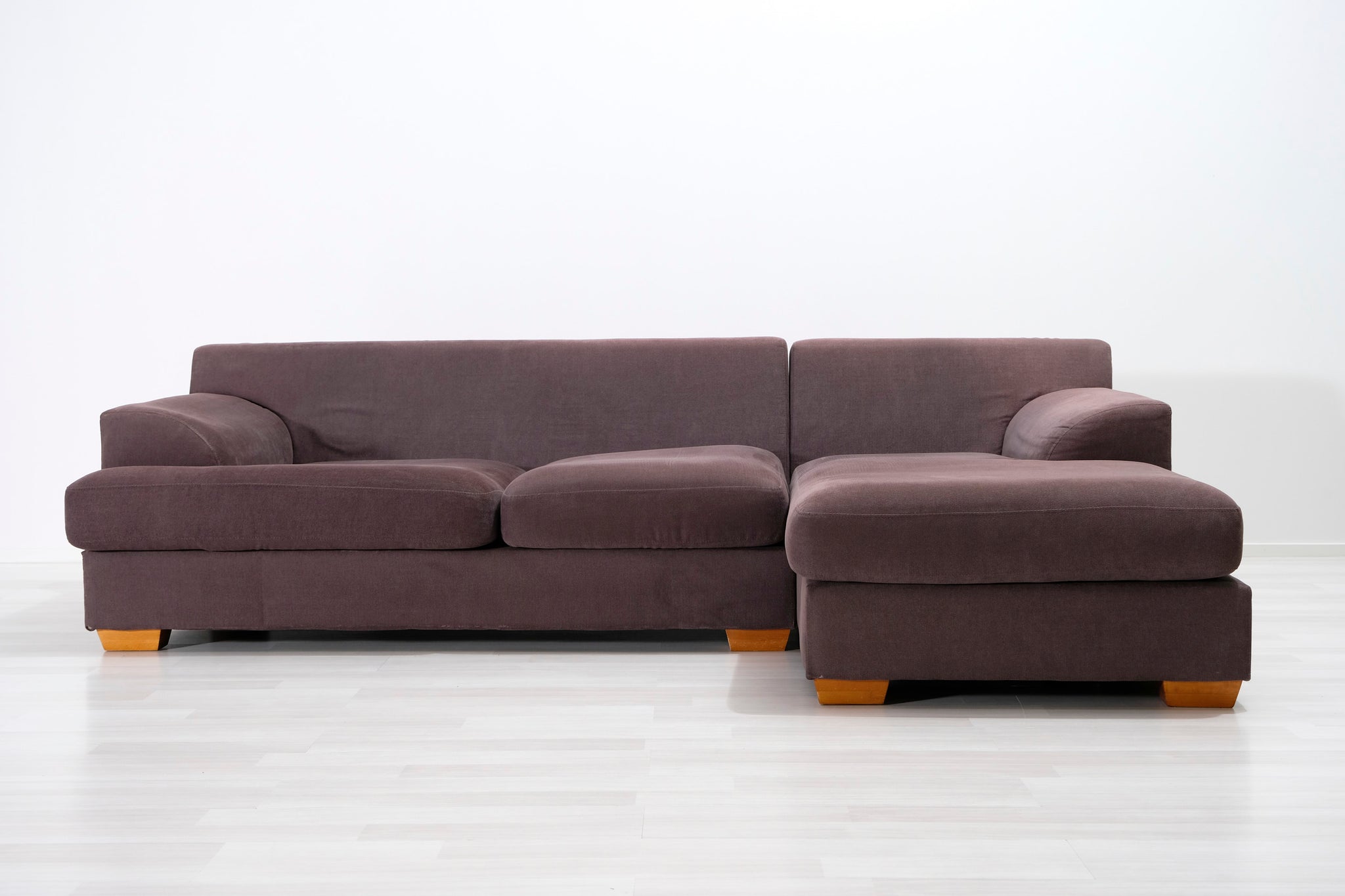 Ruskea divaanisohva, joka koostuu kahdesta osasta. Reilu istuinsyvyys ja matala selkänoja. Kangasverhoilu.