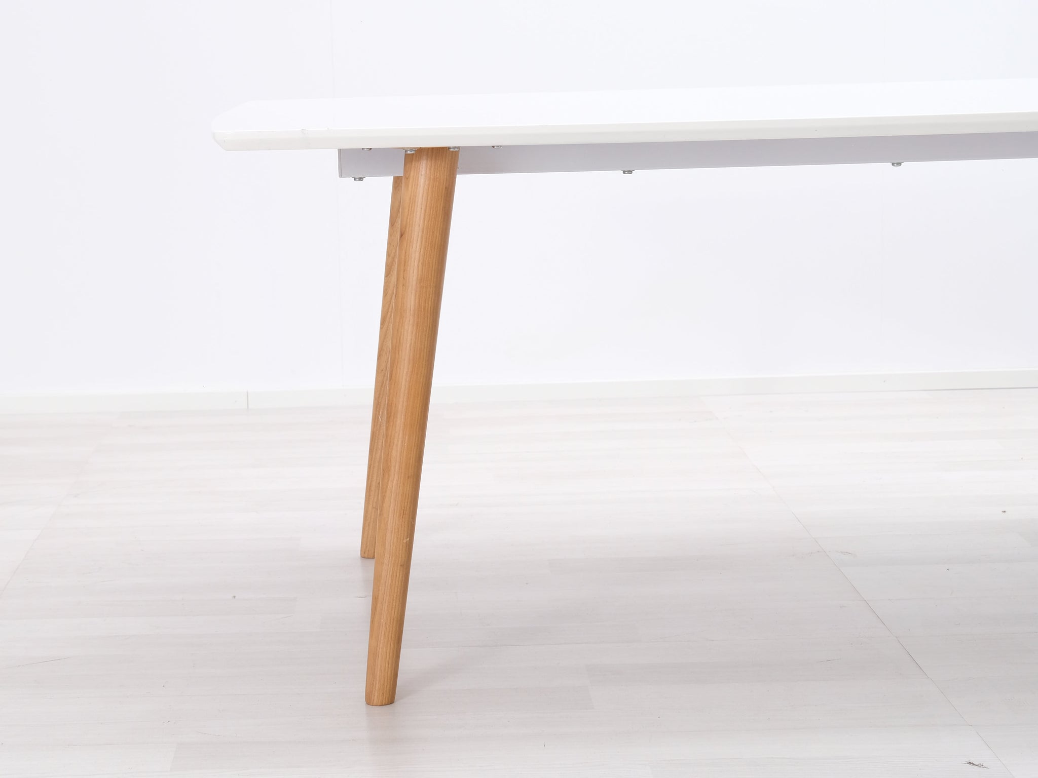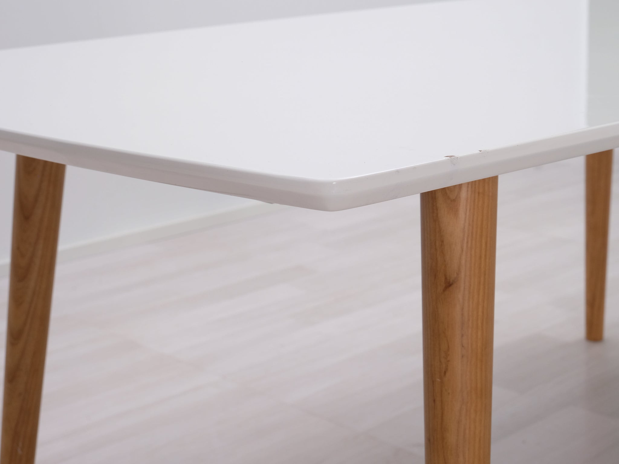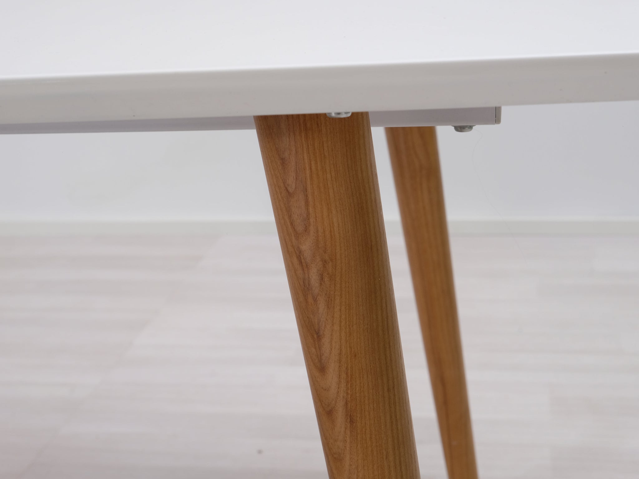 Askon valmistama ruokapöytä. Pöytälevy on korkeakiiltoa ja jalat valmistettu tammesta.