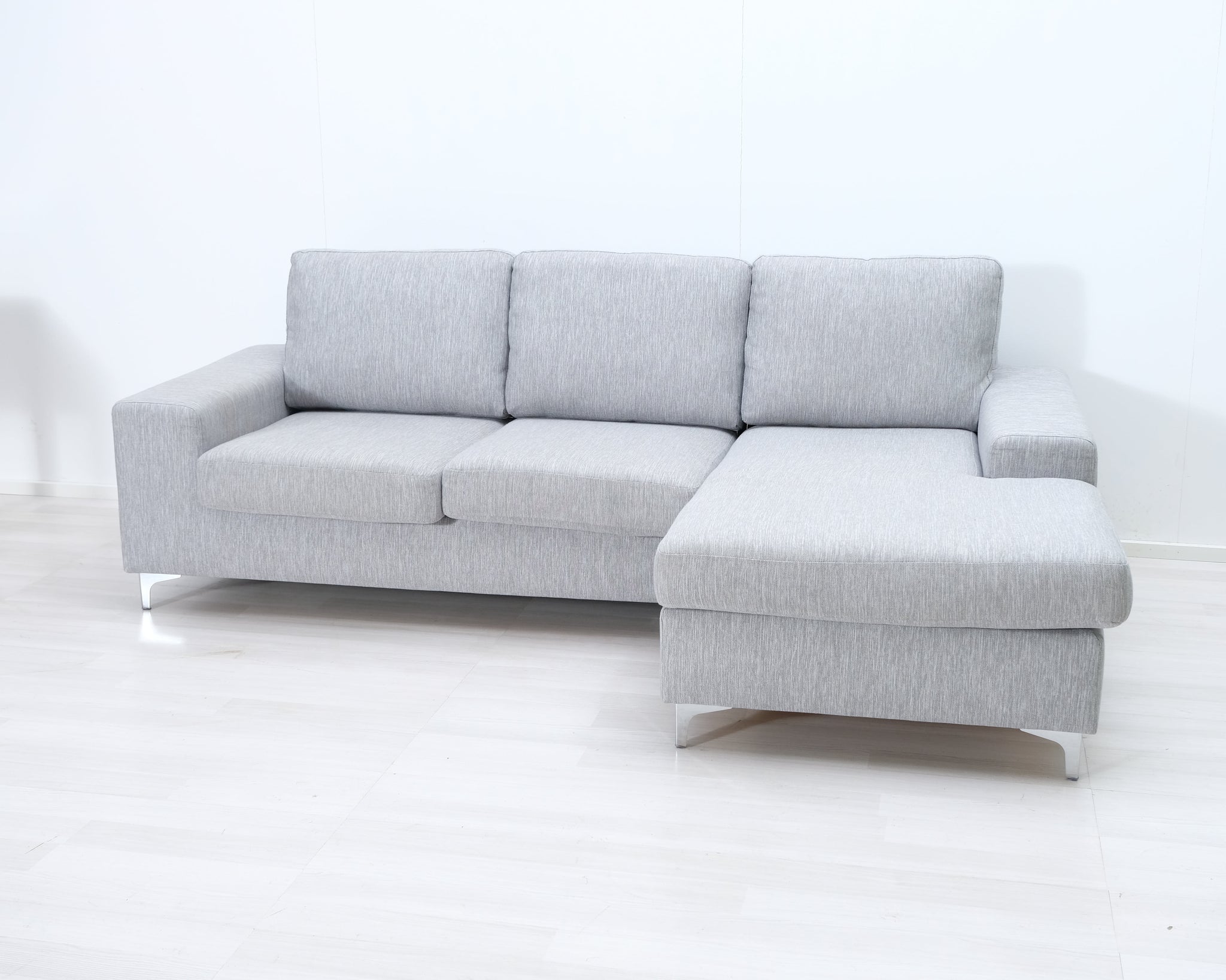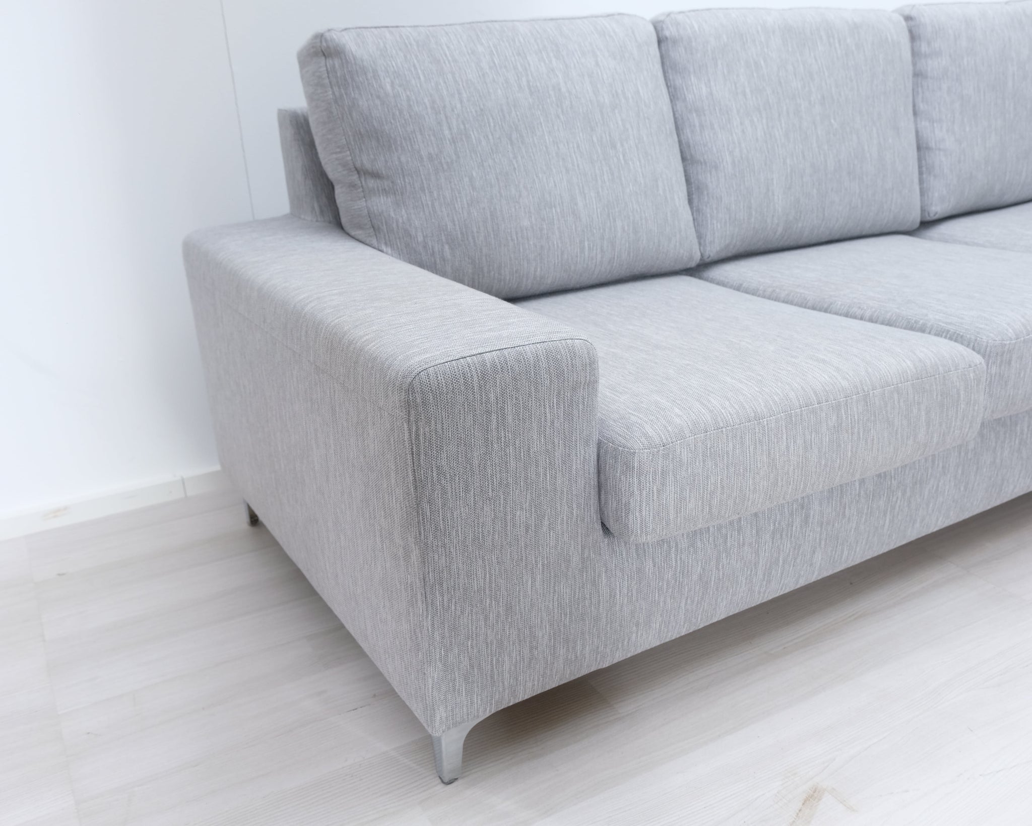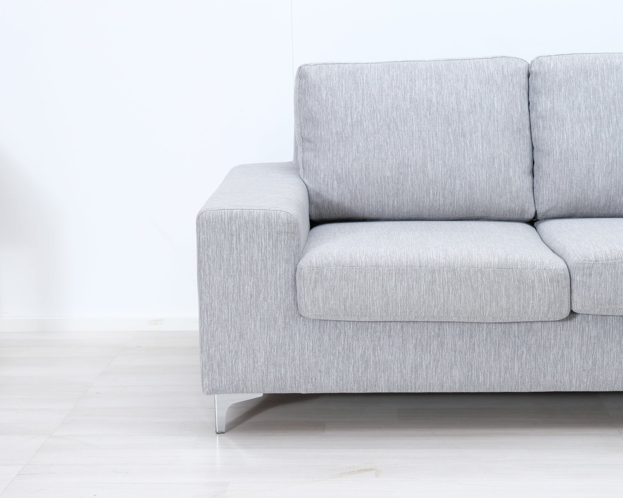 Askon kolmen istuttava divaanisohva. Harmaa kangasverhoilu ja metalliset jalat.