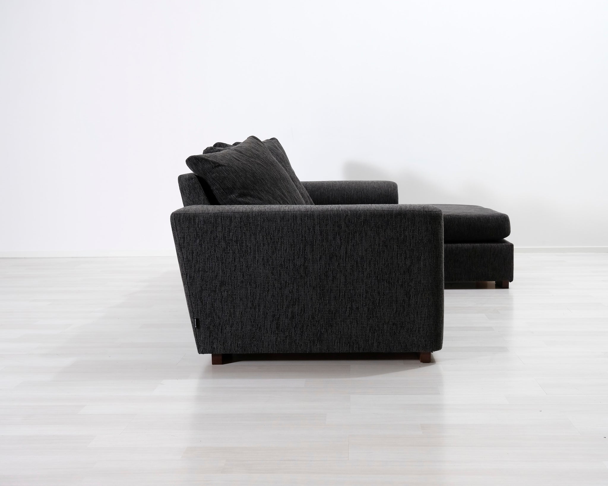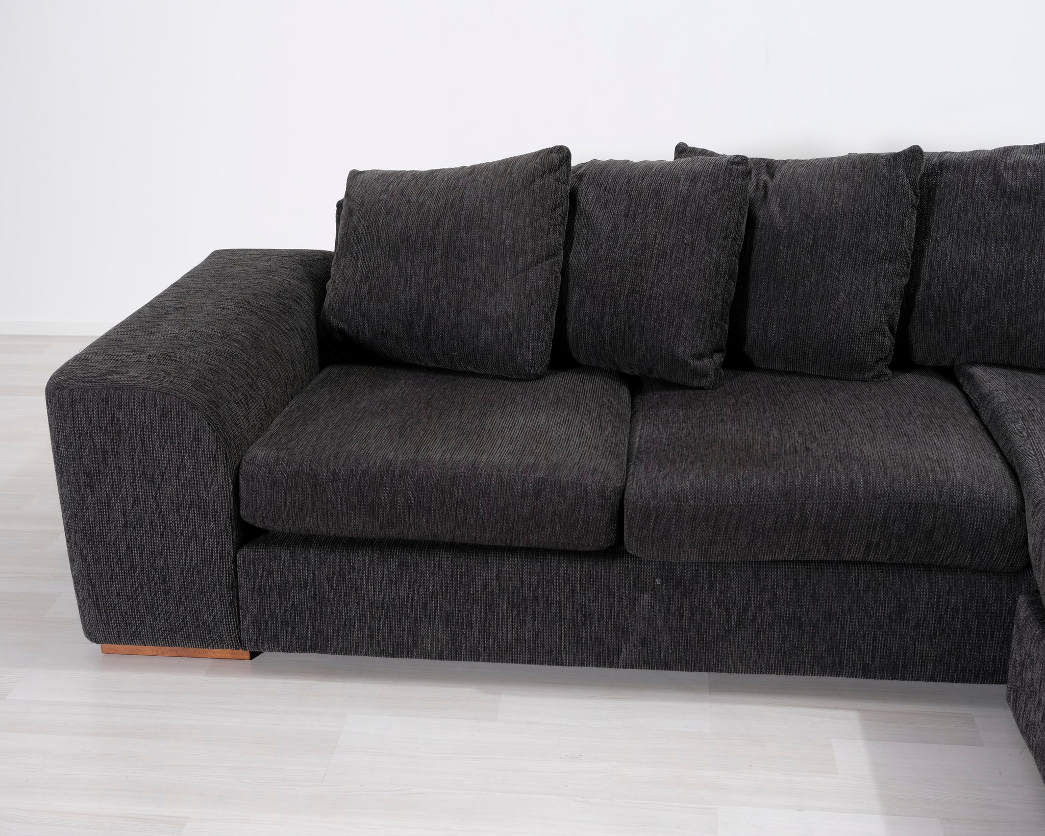 Kolmen istuttava divaanisohva. Heittotyynyt ja leveät käsinojat antavat sohvalle rennon ilmeen. Tummanharmaa kangasverhoilu.
