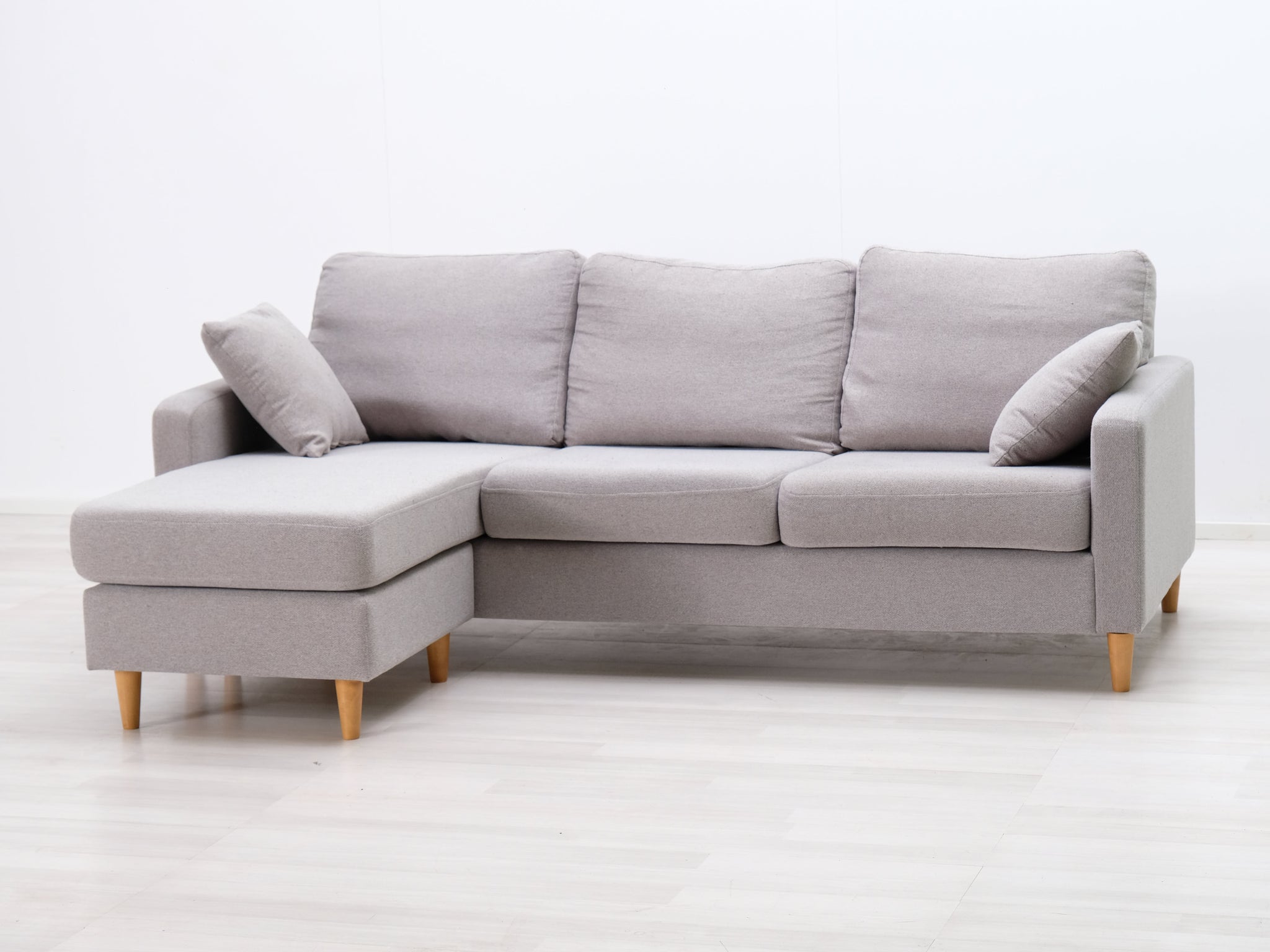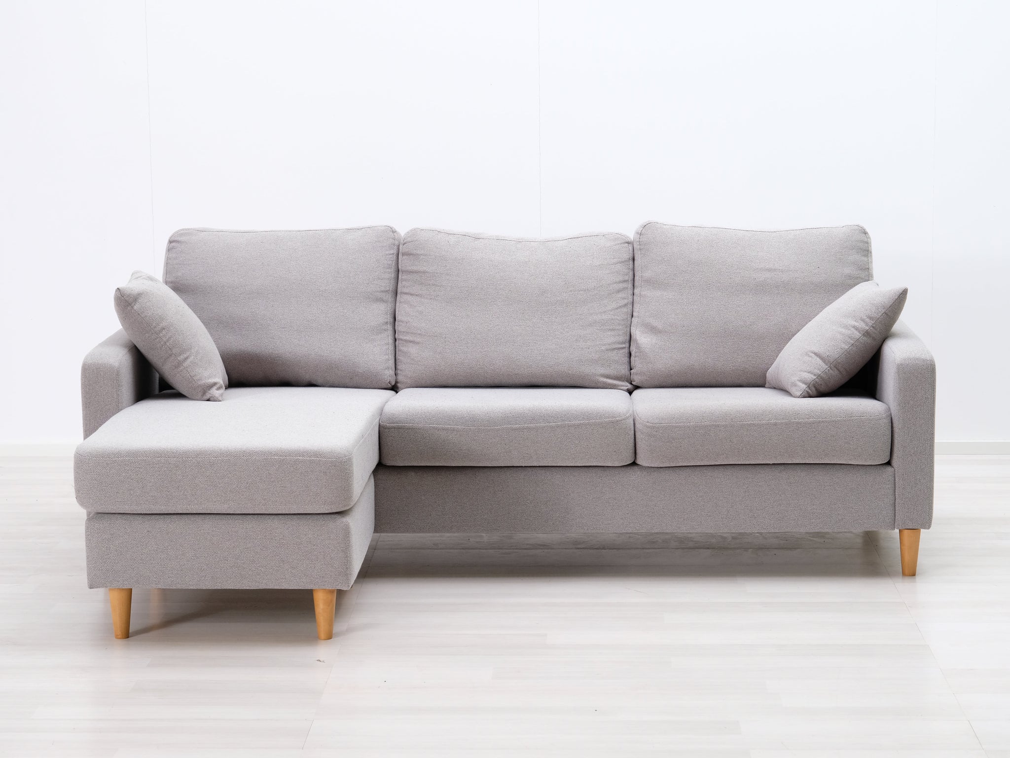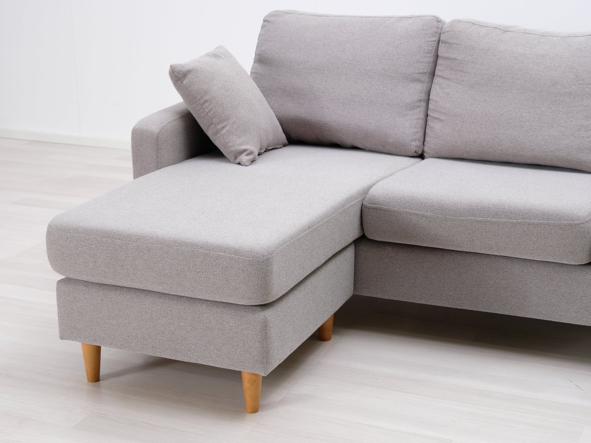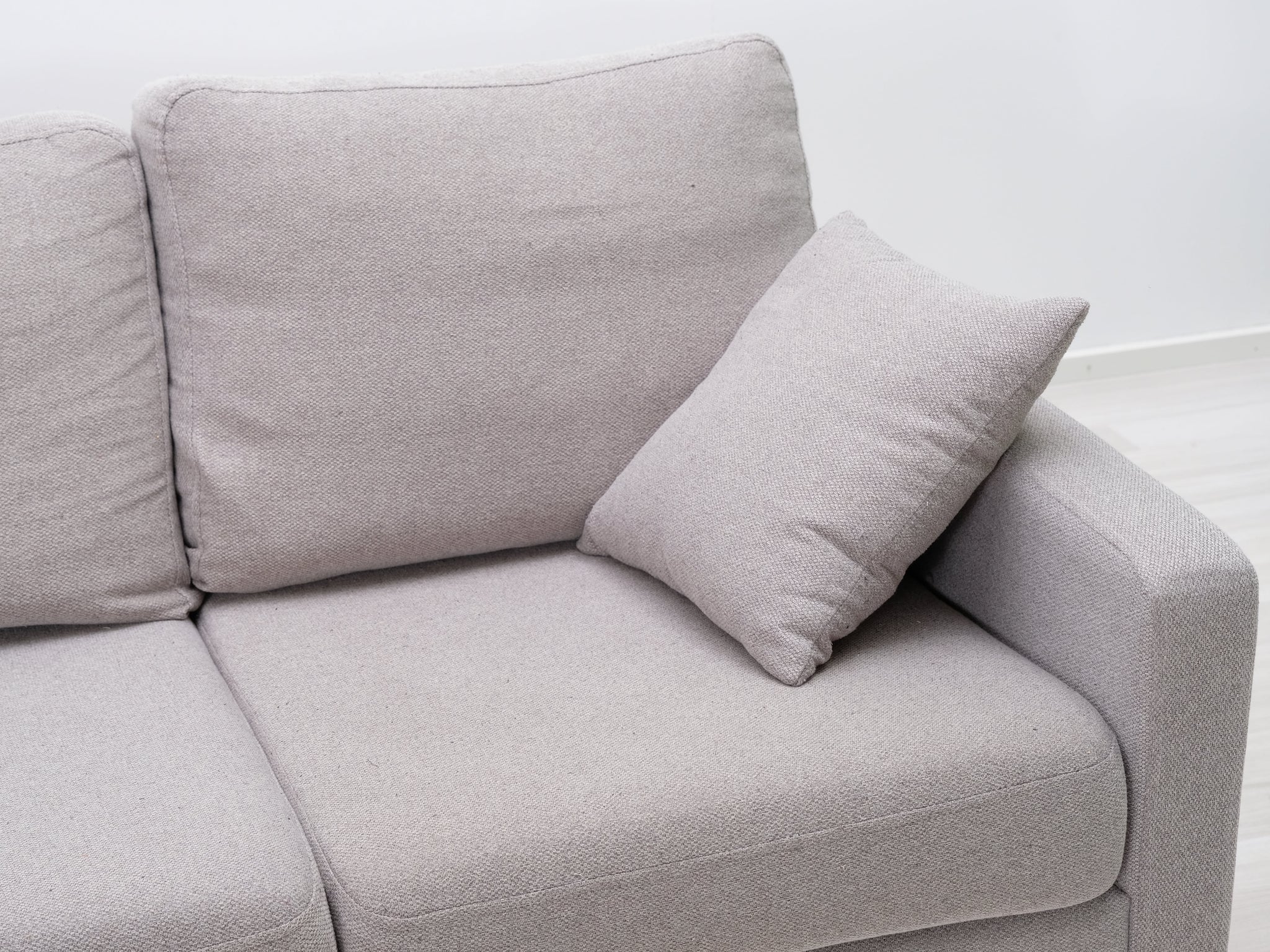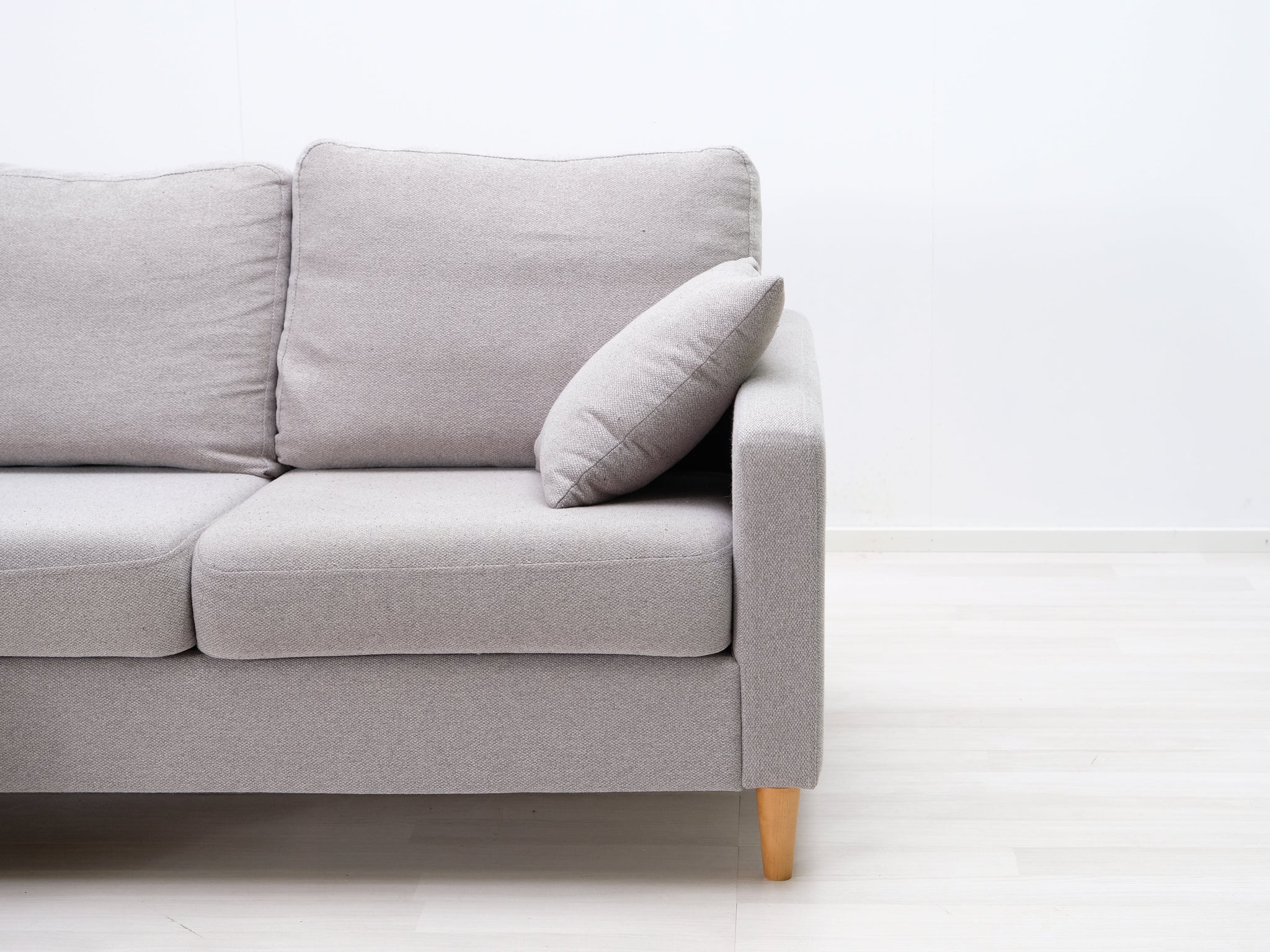 Harmaalla kankaalla verhoiltu divaanisohva. Sirot jalat ja kaksi heittotyynyä.