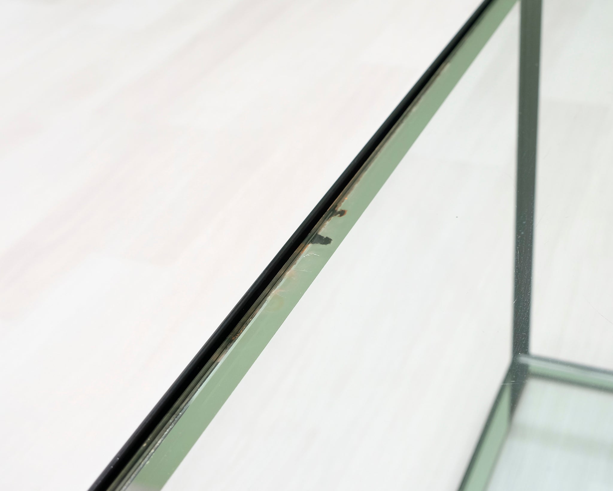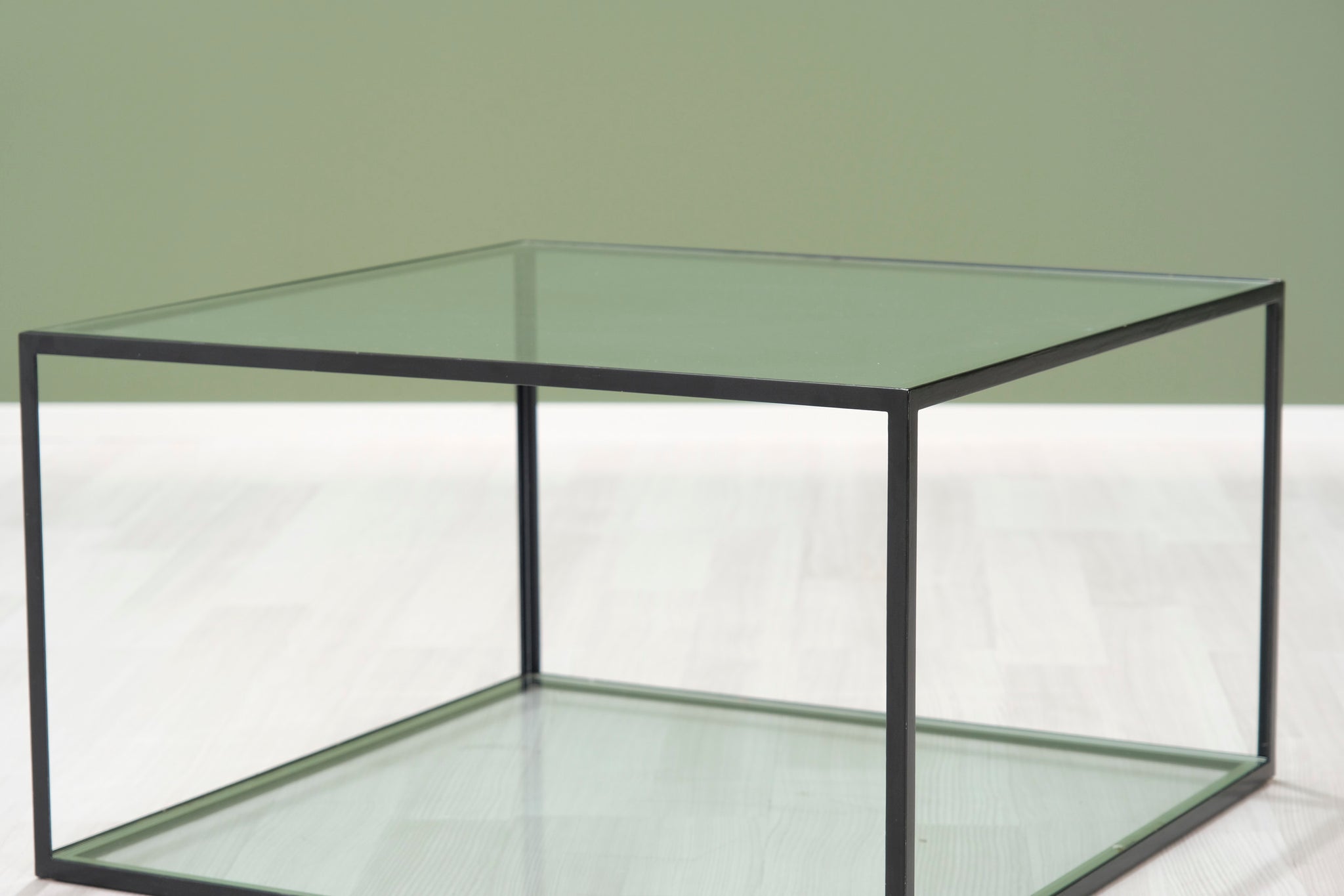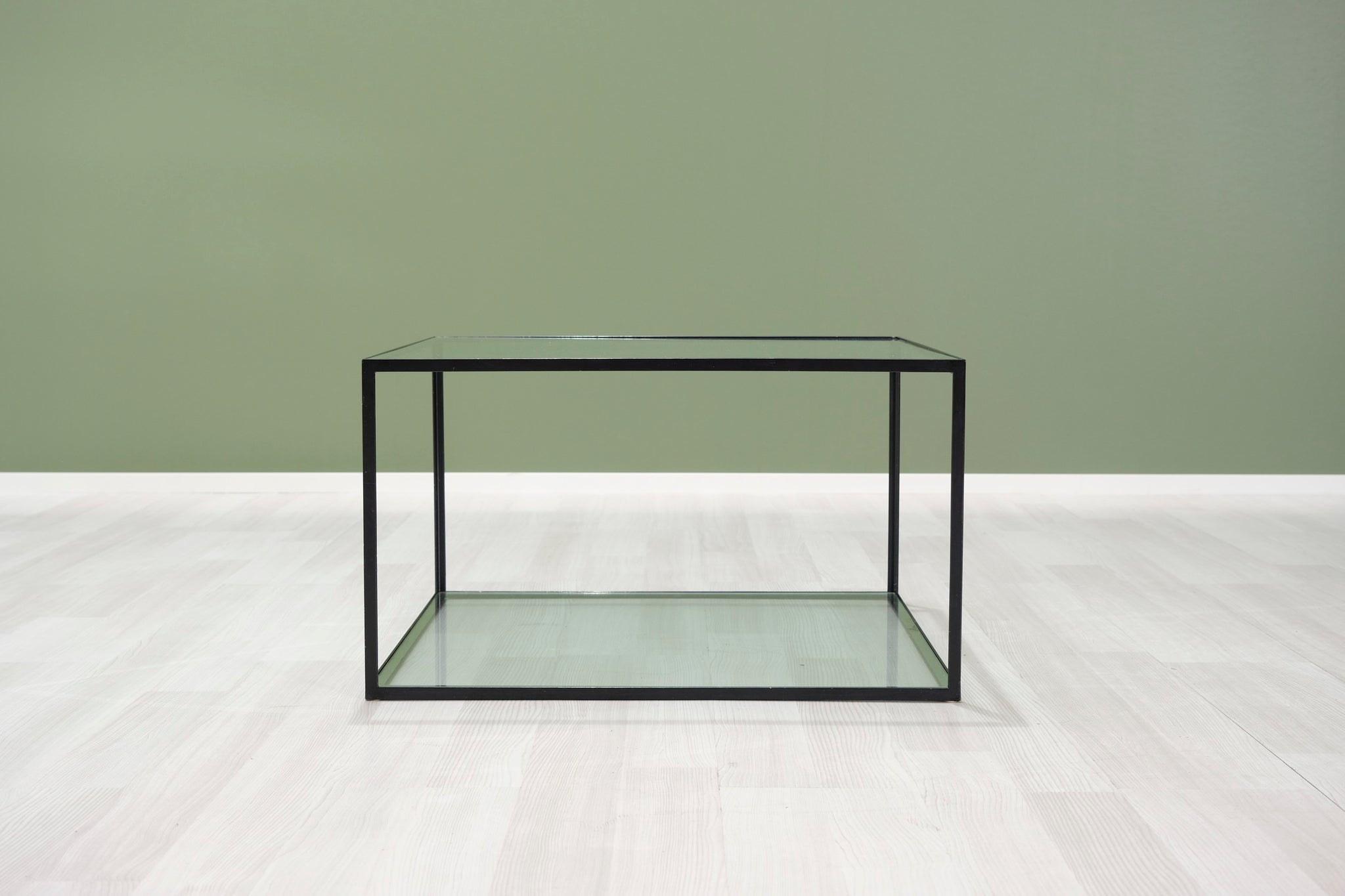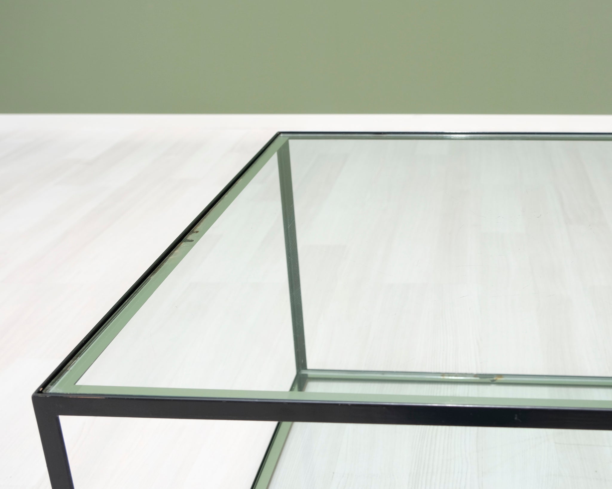 B&B Italian sohvapöytä. Metallista valmistettu runko ja kaksi lasilevyä. B&B Italia -brändin huonekalut edustavat italialaista huippumuotoilua. Huonekalut valmistetaan käsin yrityksen omalla tehtaalla Novedratessa, Milanon pohjoispuolella.