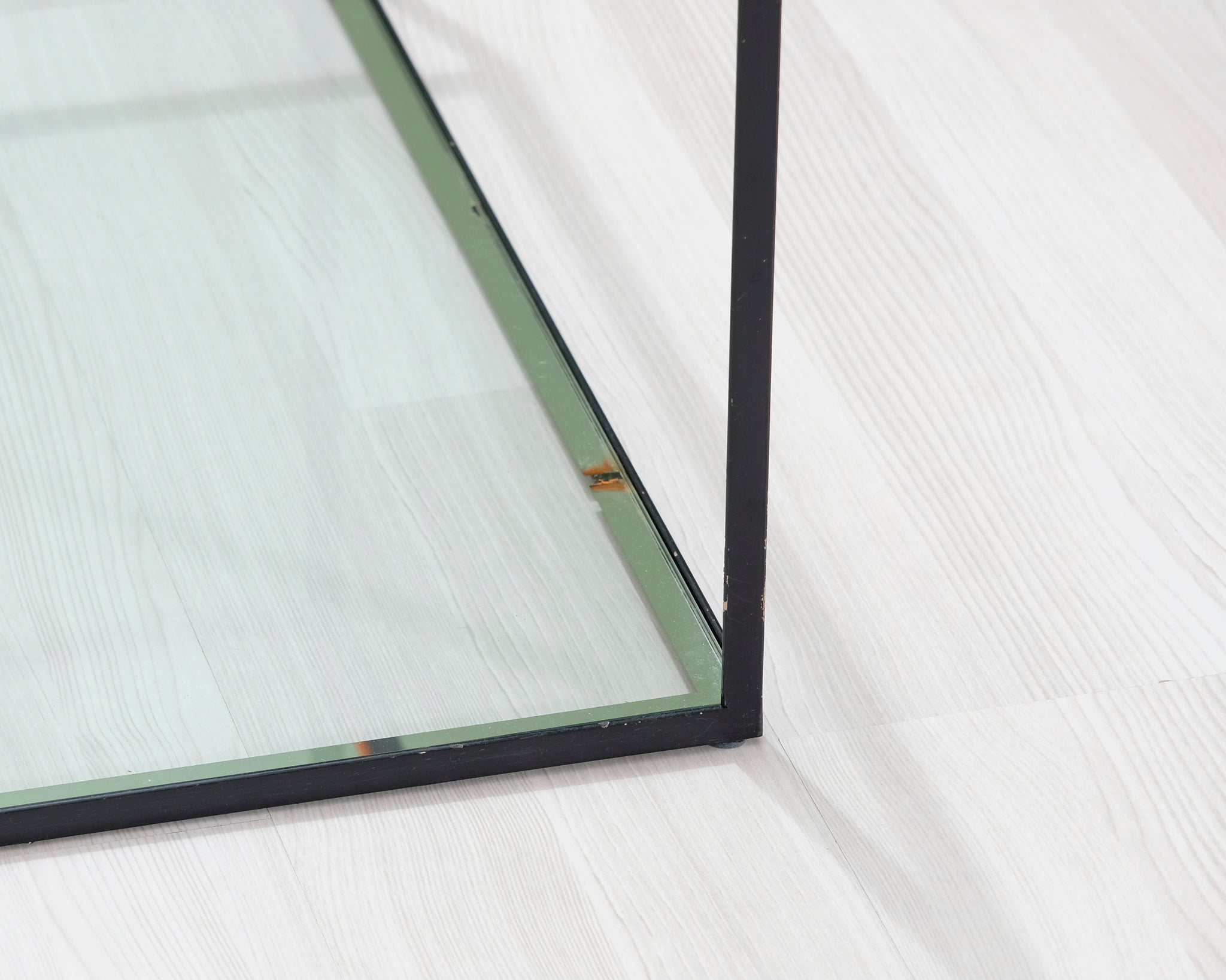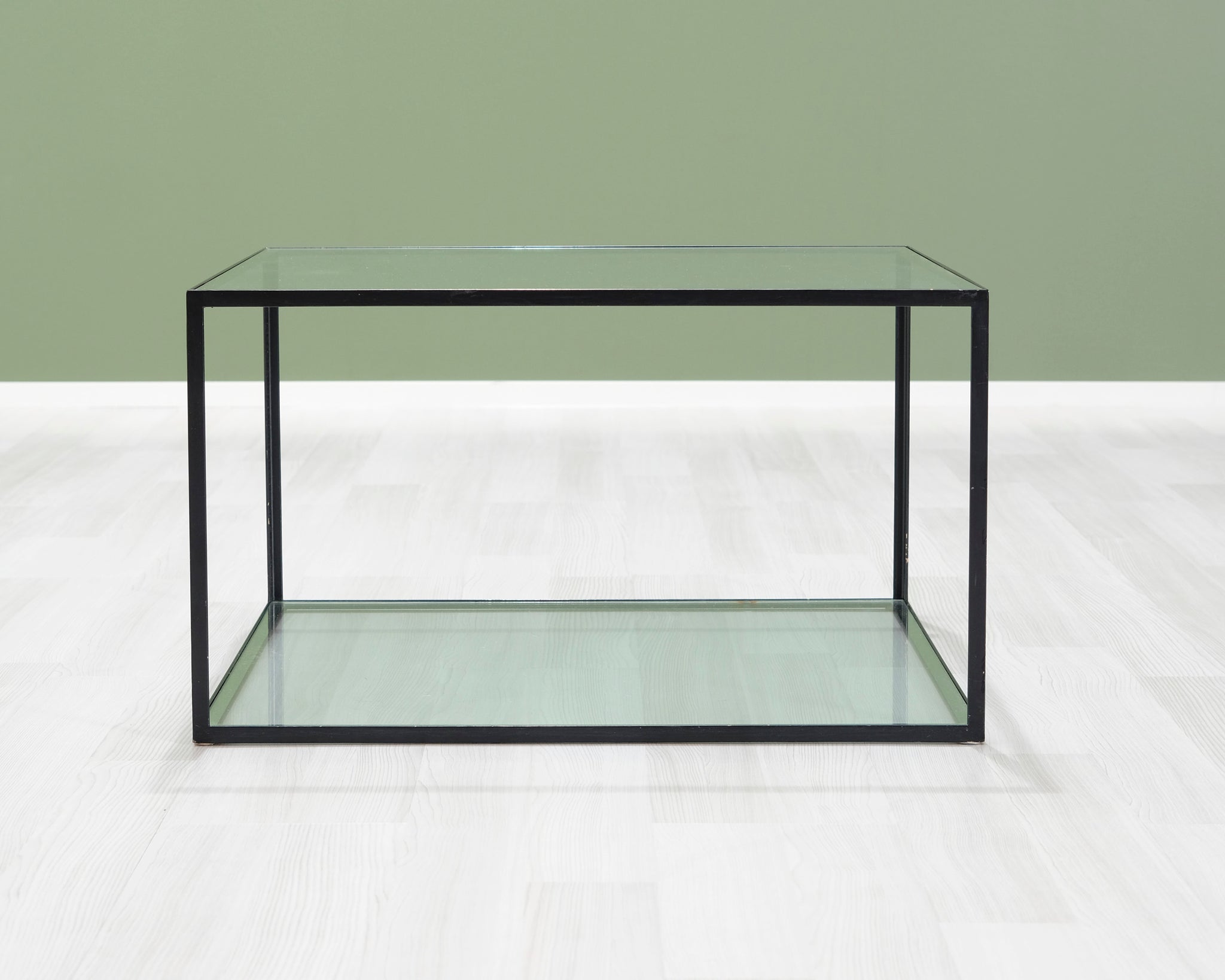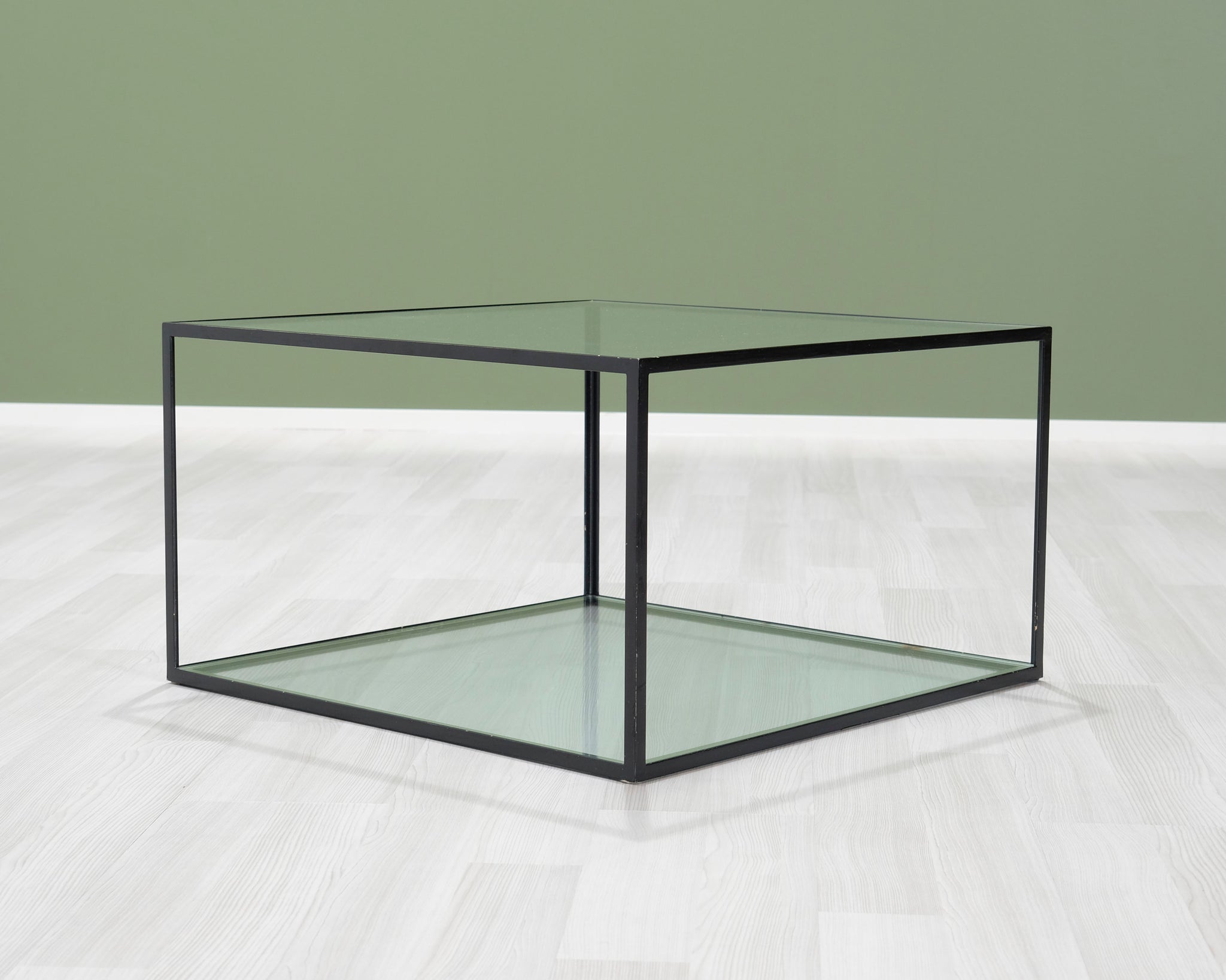 B&B Italia -brändin huonekalut edustavat italialaista huippumuotoilua. Linjakas sohvapöytä, jossa musta metallirunko ja kaksi lasilevyä.