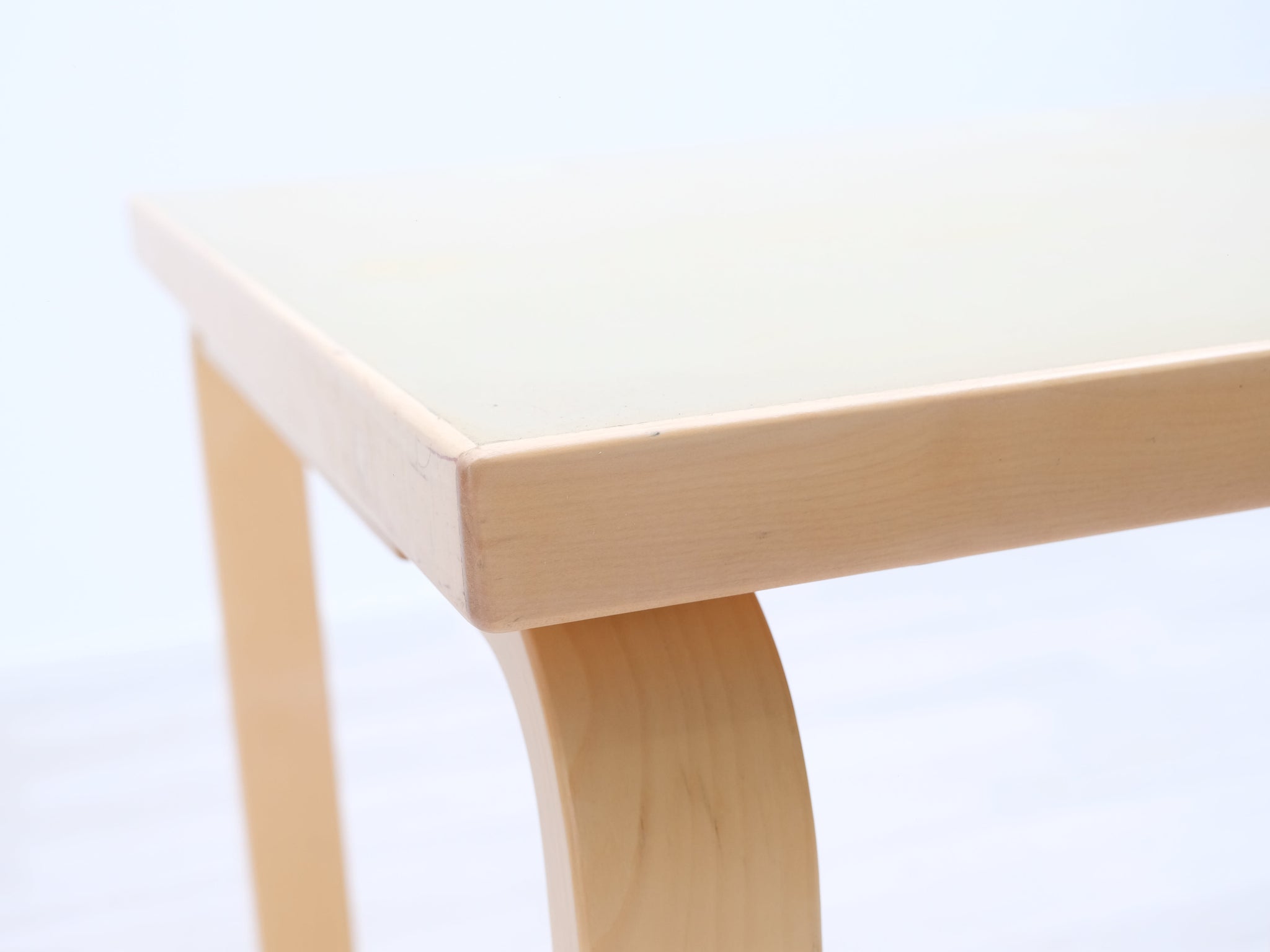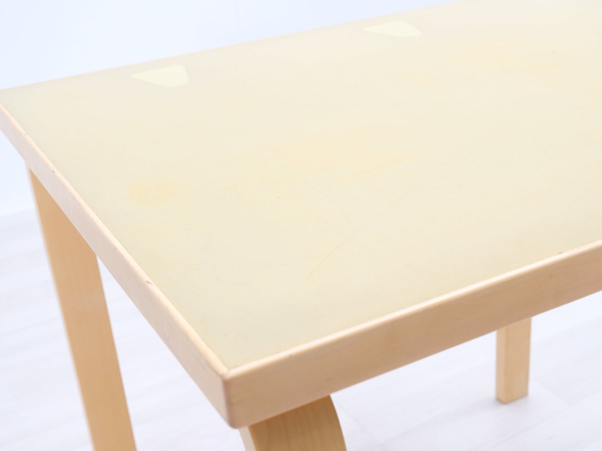 Artekin pöytä. Pöydässä on Alvar Aallon suunnittelulle tunnusomaista arjen estetiikkaa pelkistetyn ulkonäön ja toiminnallisuuden muodossa. Pöydän runko on valmistettu koivusta ja pöytälevy on vaaleanvihreä. Patentoidu L-jalat.