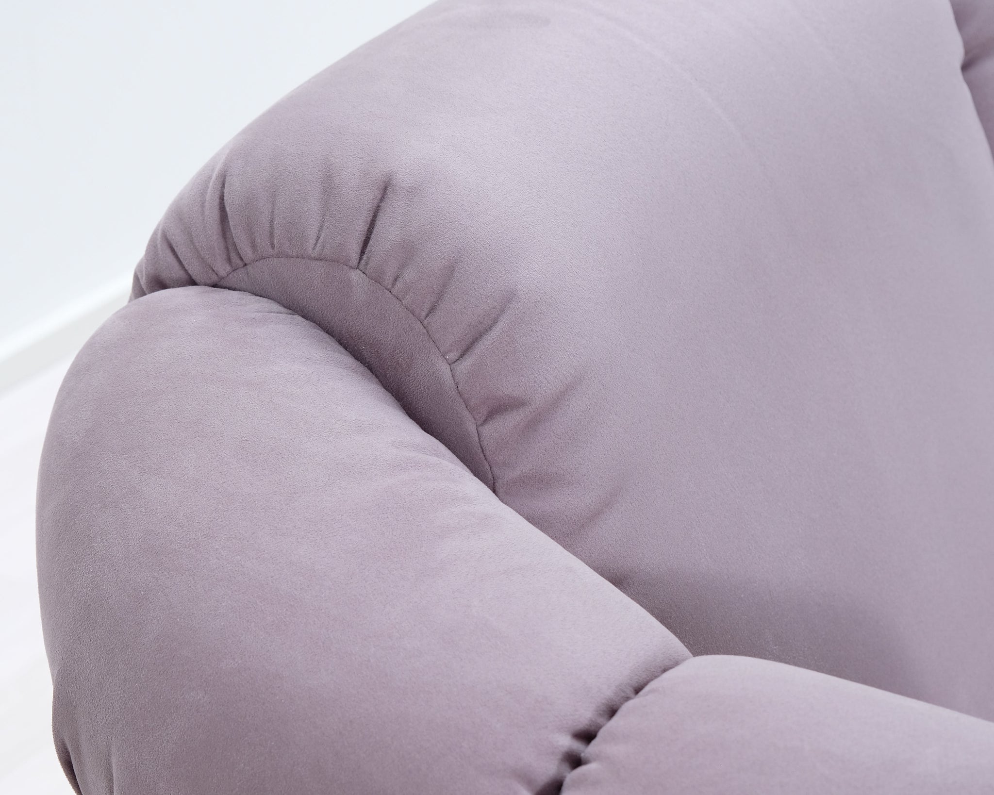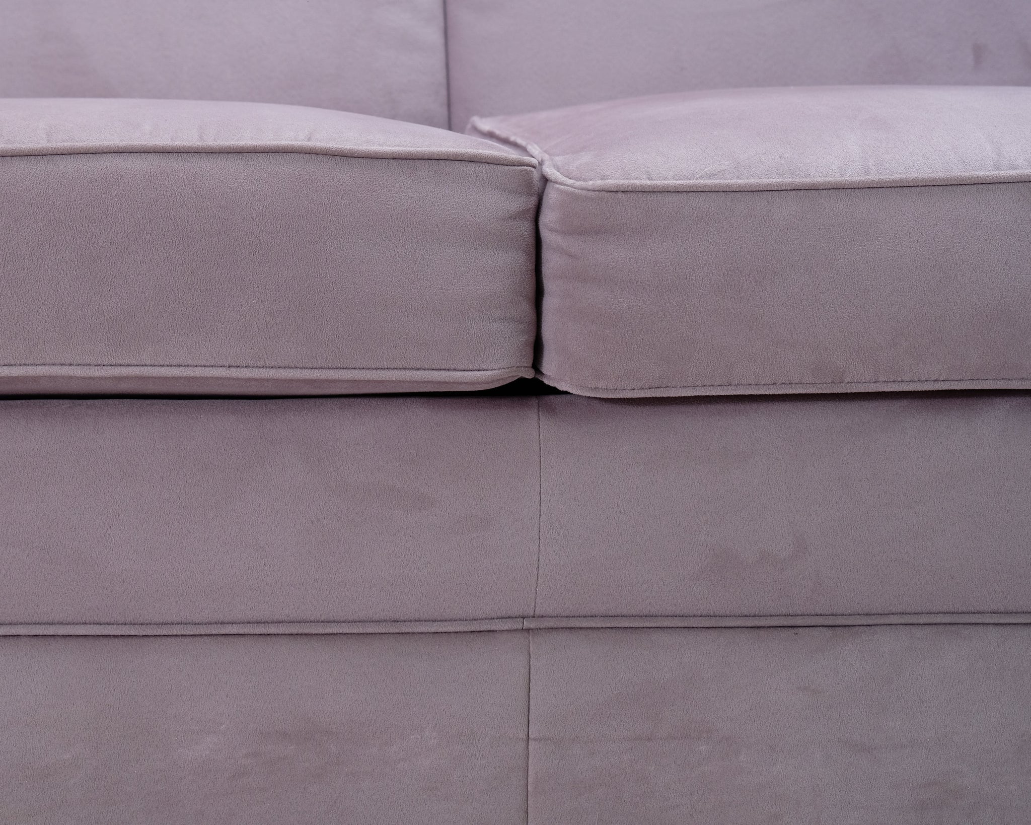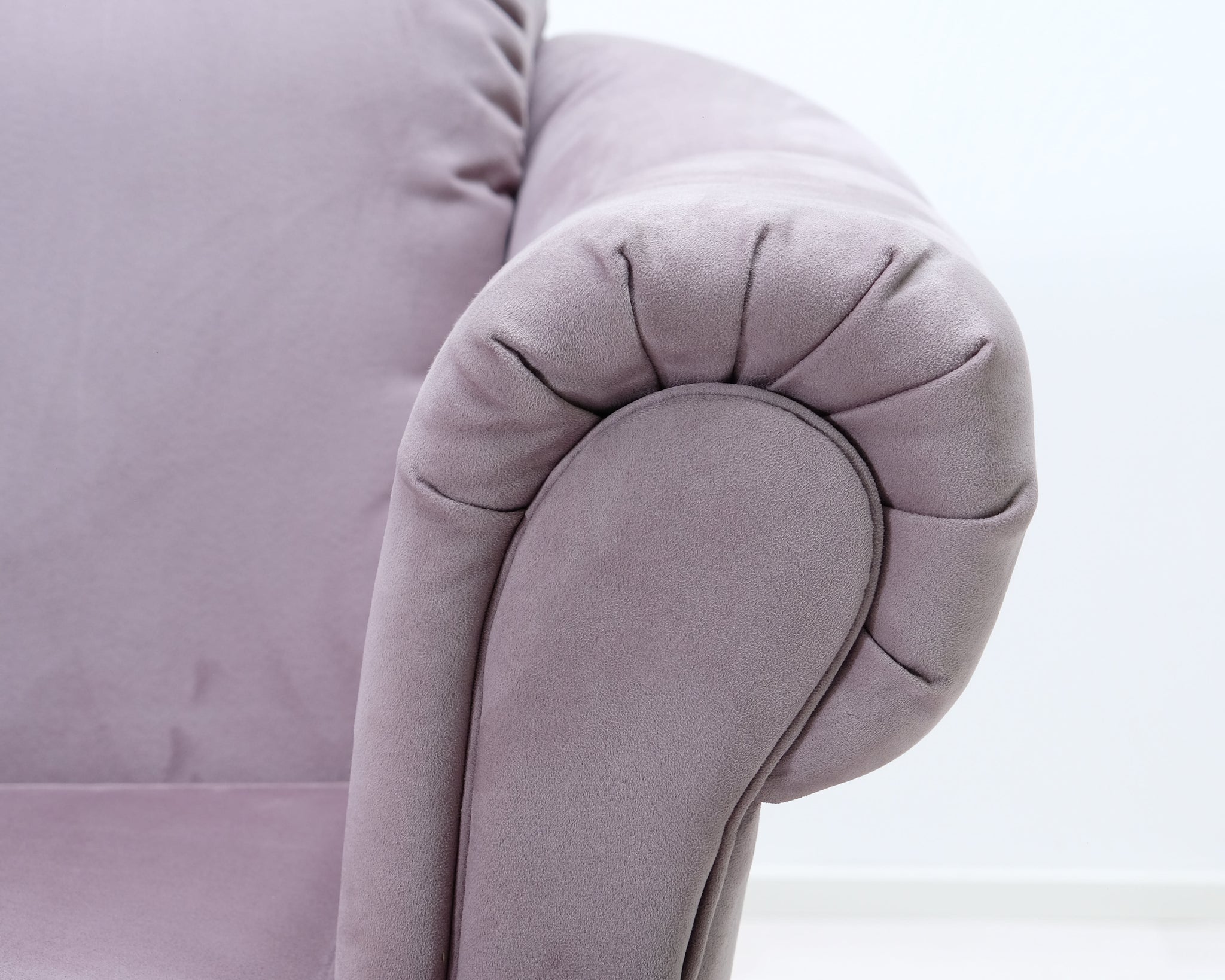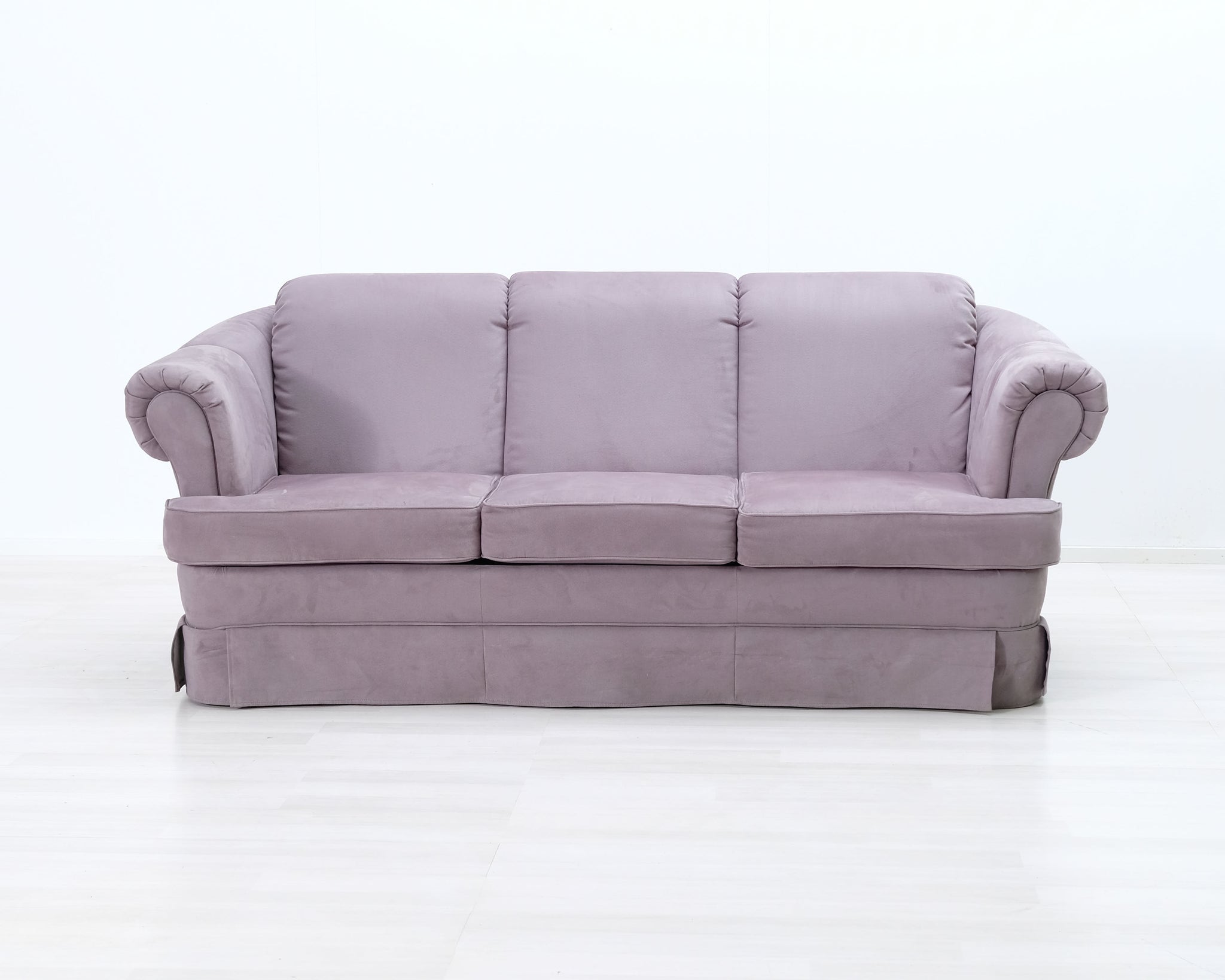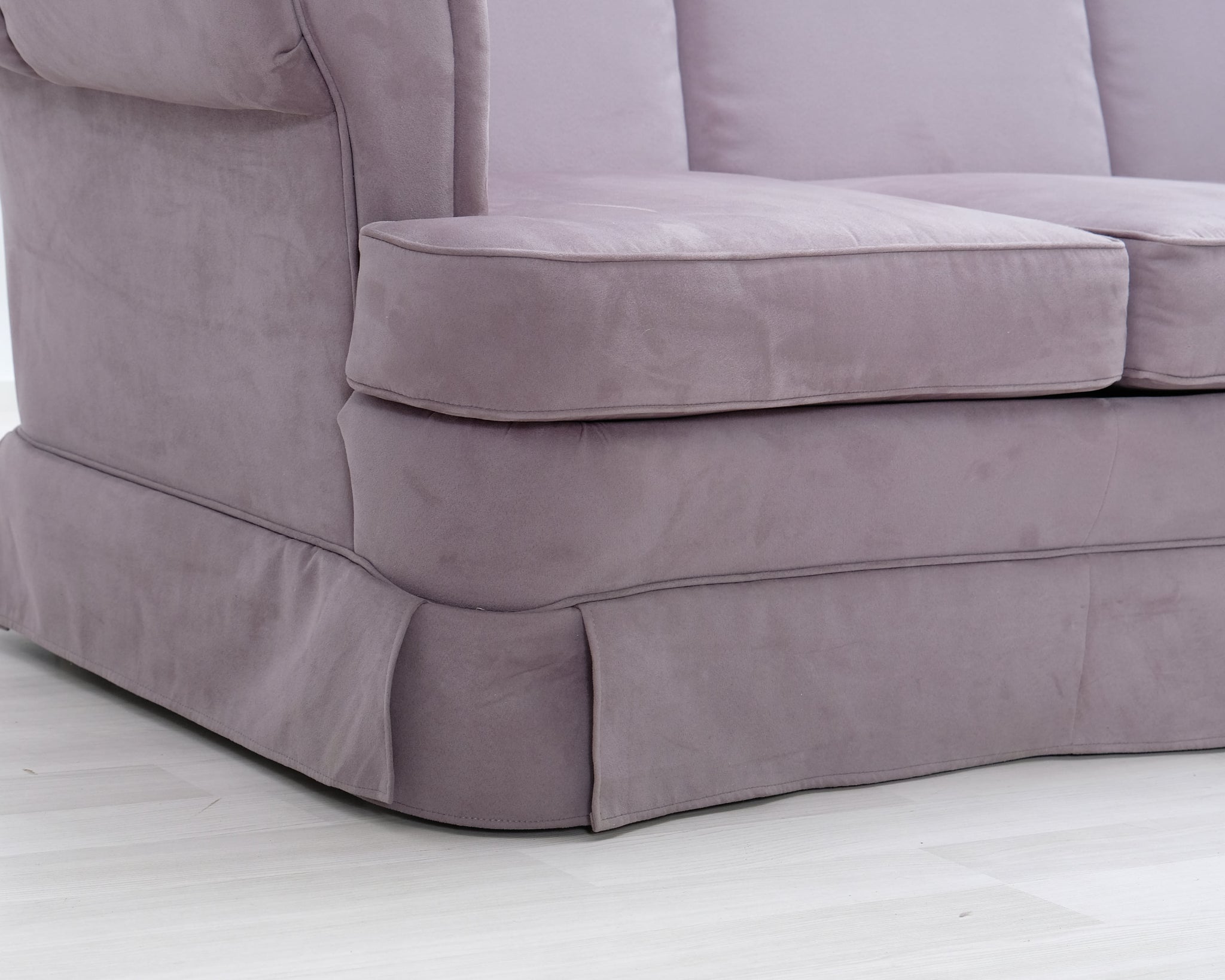 Kolmen istuttava kangassohva. Sohva on verhoiltu mokkamaisella alcantara-kankaalla, joka on pehmeä ja helppohoitoinen kangas.