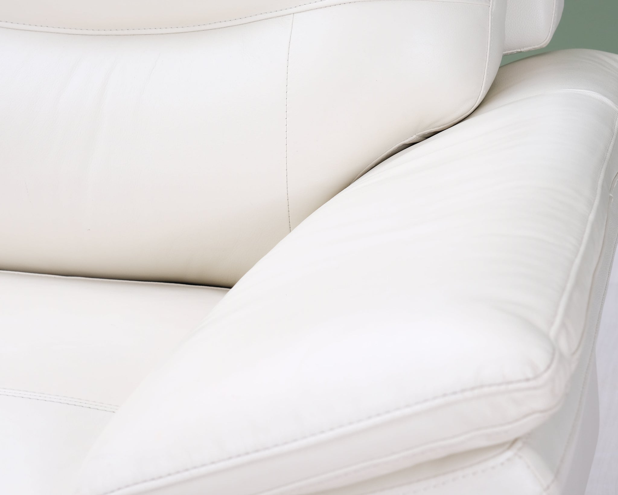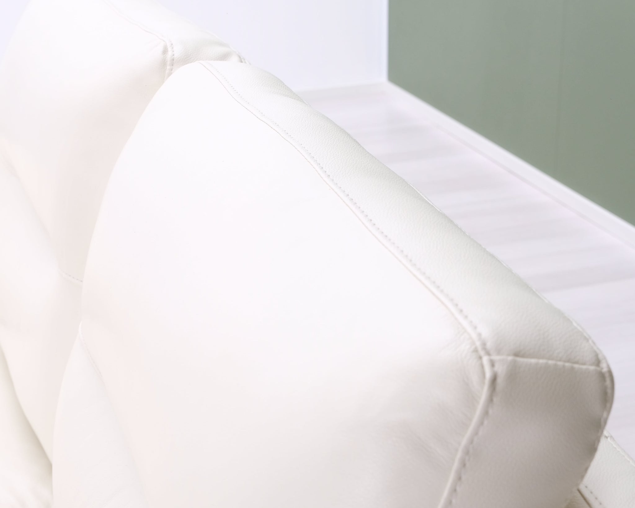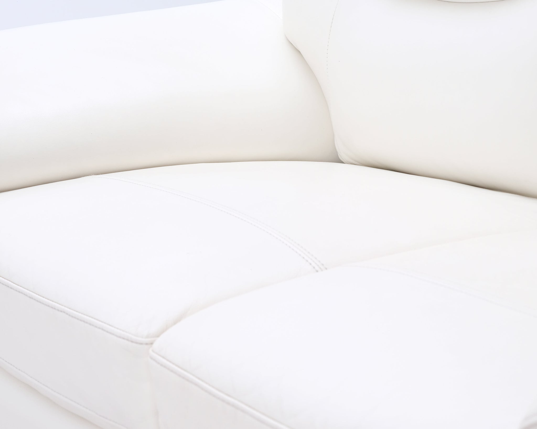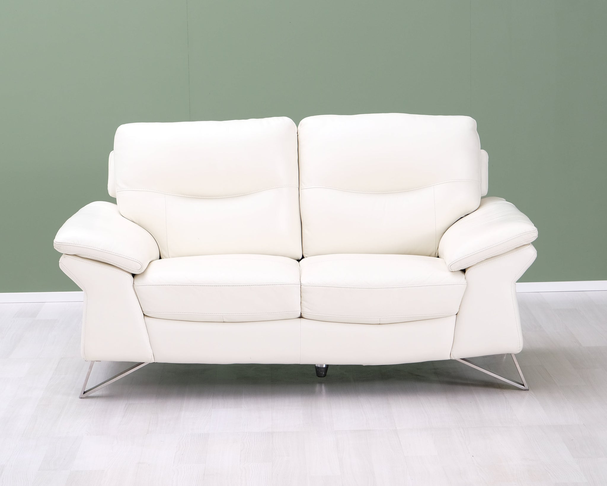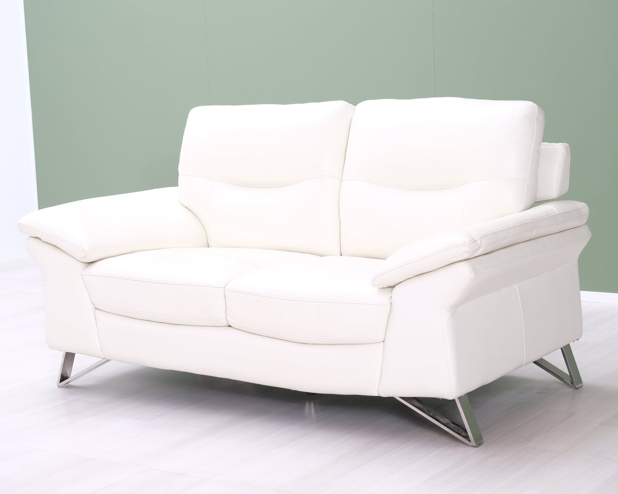 Valkoinen kahden istuttava nahkasohva. Aavistuksen ulospäin kääntyvät metallijalat.