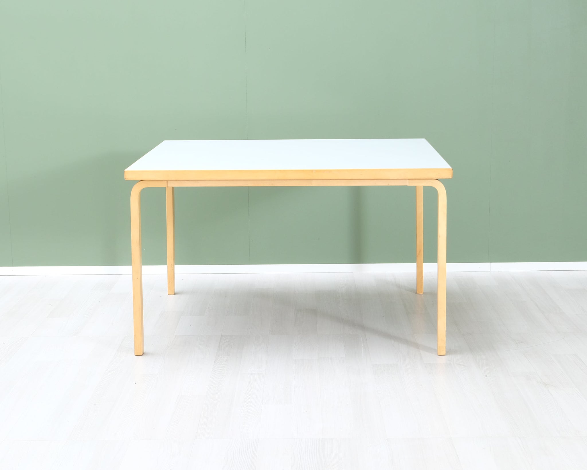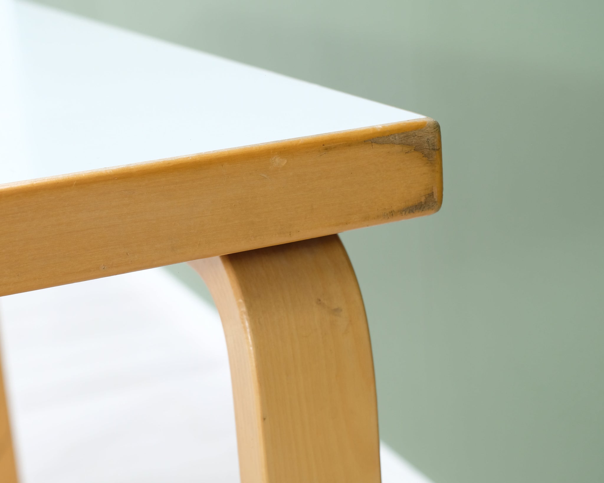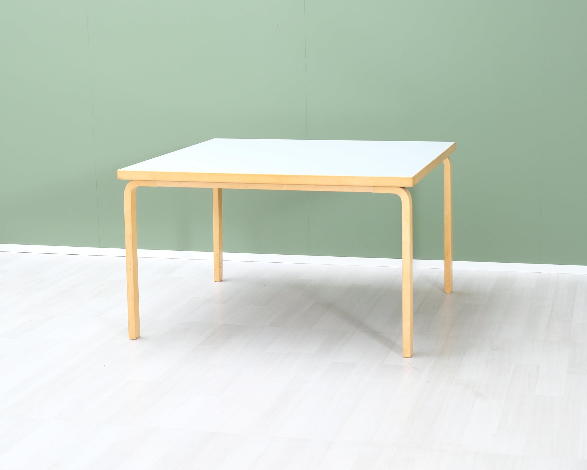 Artekin ruokapöytä. Pöydässä on Alvar Aallon suunnittelulle tunnusomaista arjen estetiikkaa pelkistetyn ulkonäön ja toiminnallisuuden muodossa. Pöydän runko on valmistettu koivusta ja pöytälevy on valkoinen. Patentoidu L-jalat.