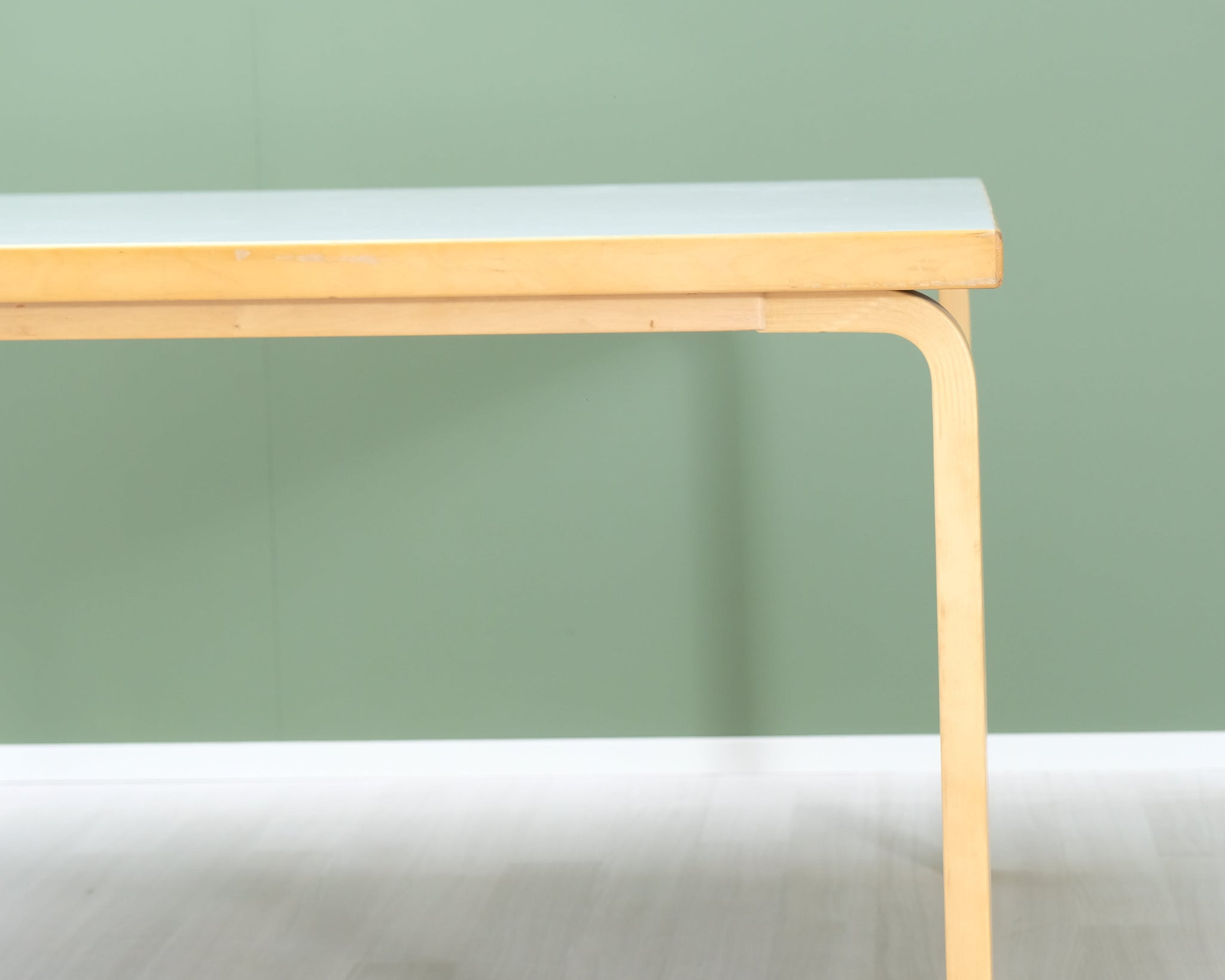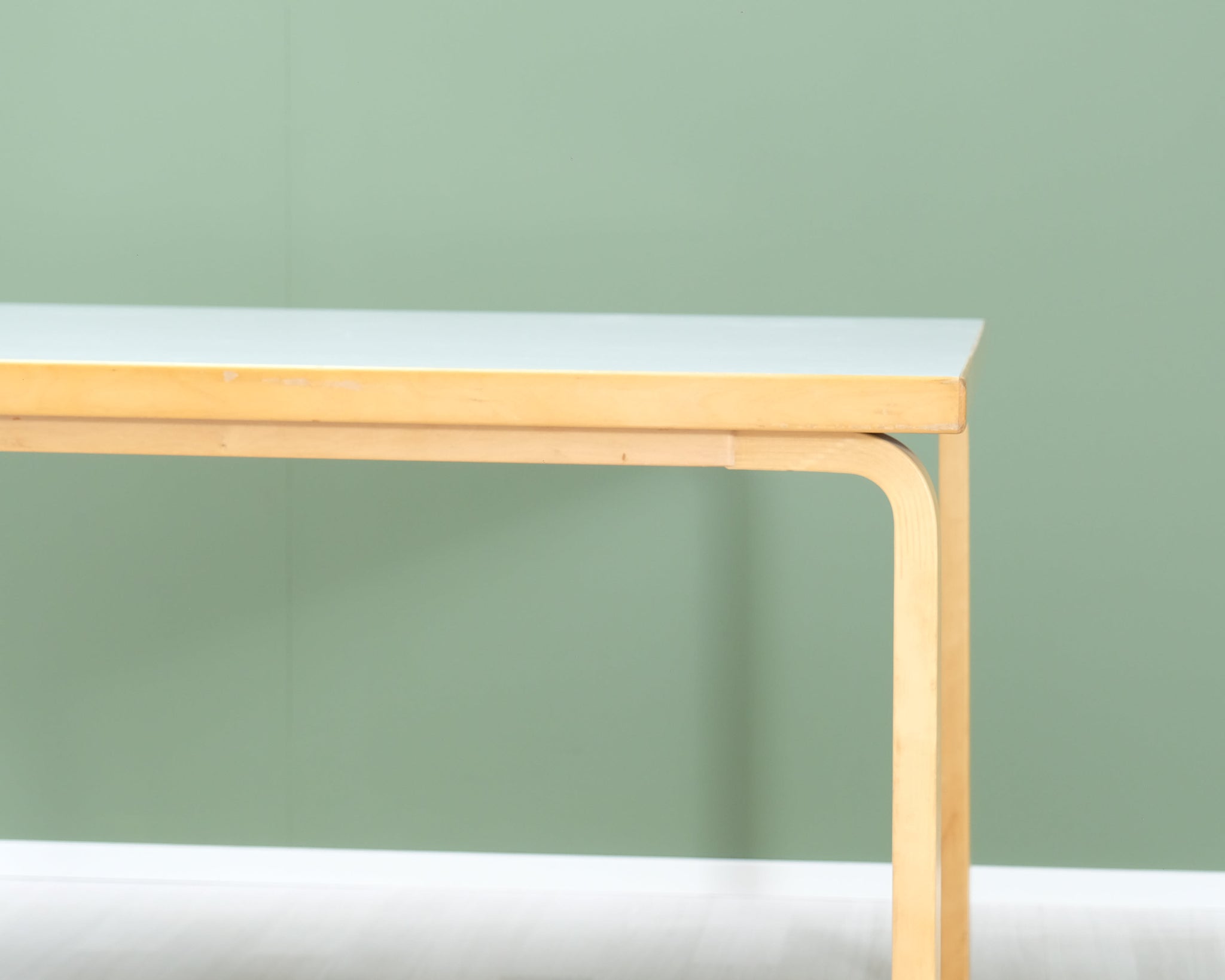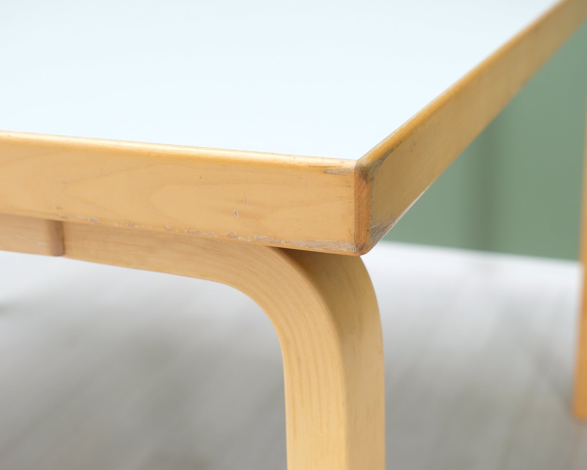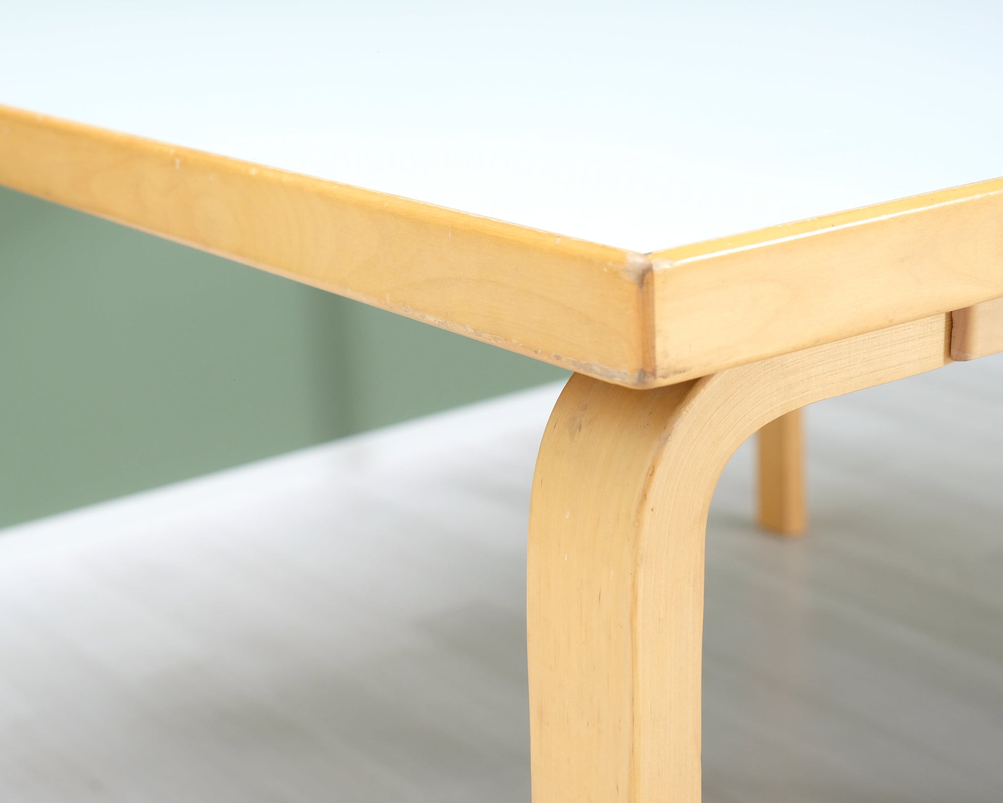 Artekin ruokapöytä. Pöydässä on Alvar Aallon suunnittelulle tunnusomaista arjen estetiikkaa pelkistetyn ulkonäön ja toiminnallisuuden muodossa. Pöydän runko on valmistettu koivusta ja pöytälevy on valkoinen. Patentoidu L-jalat.