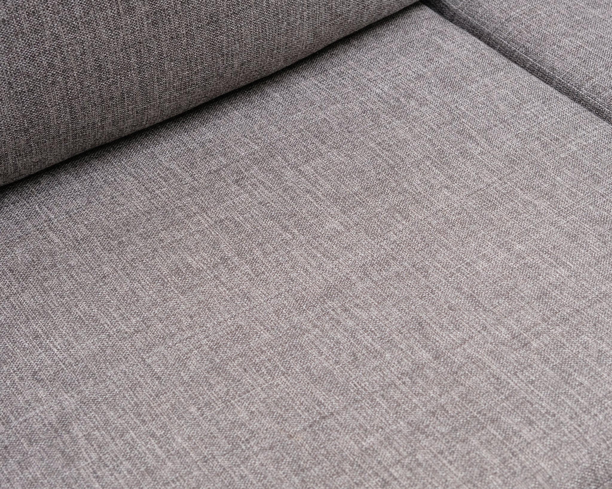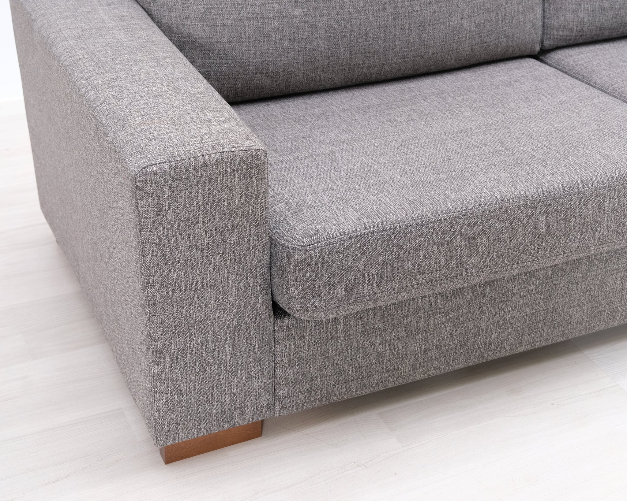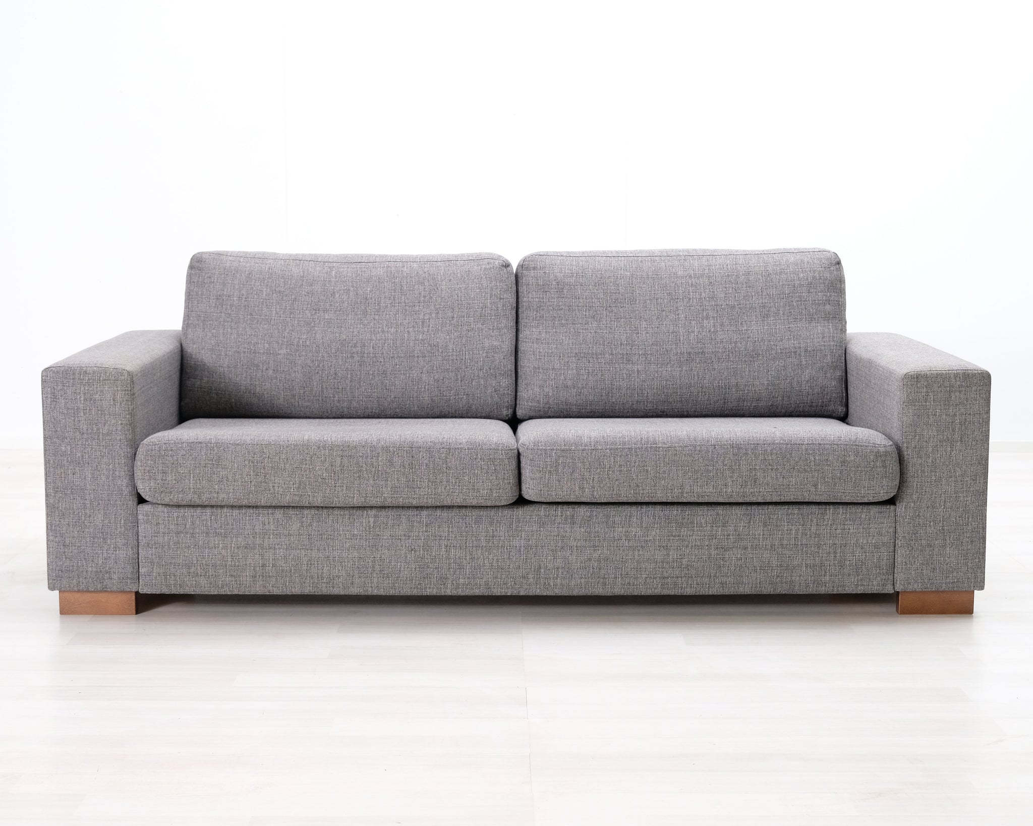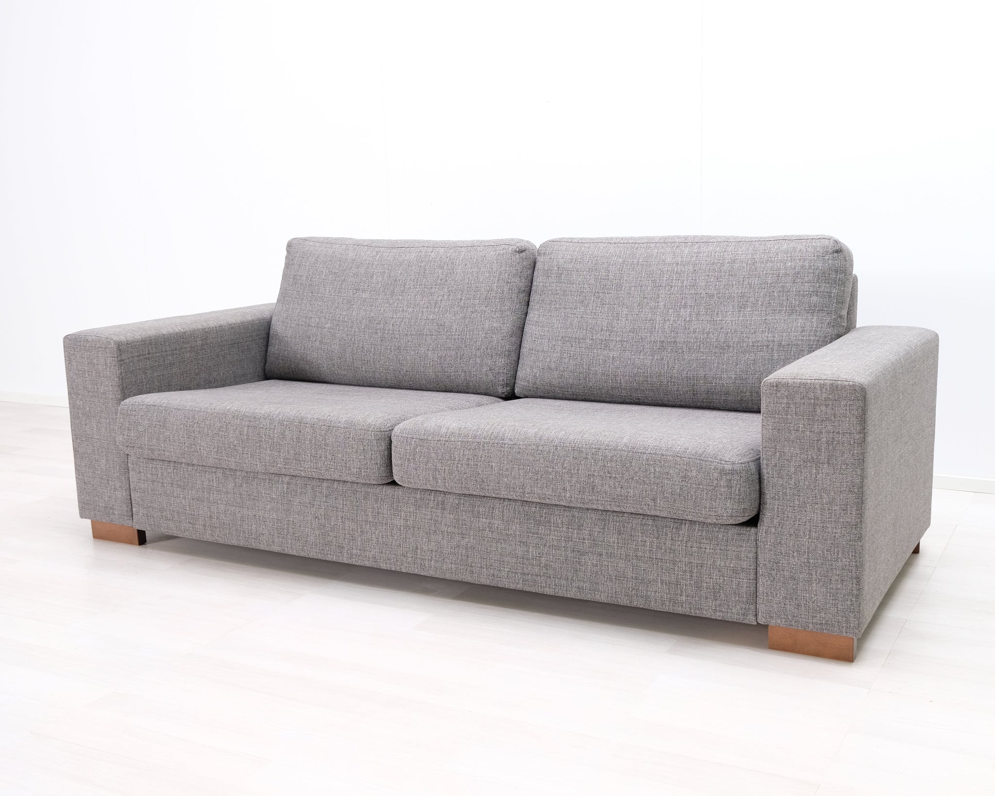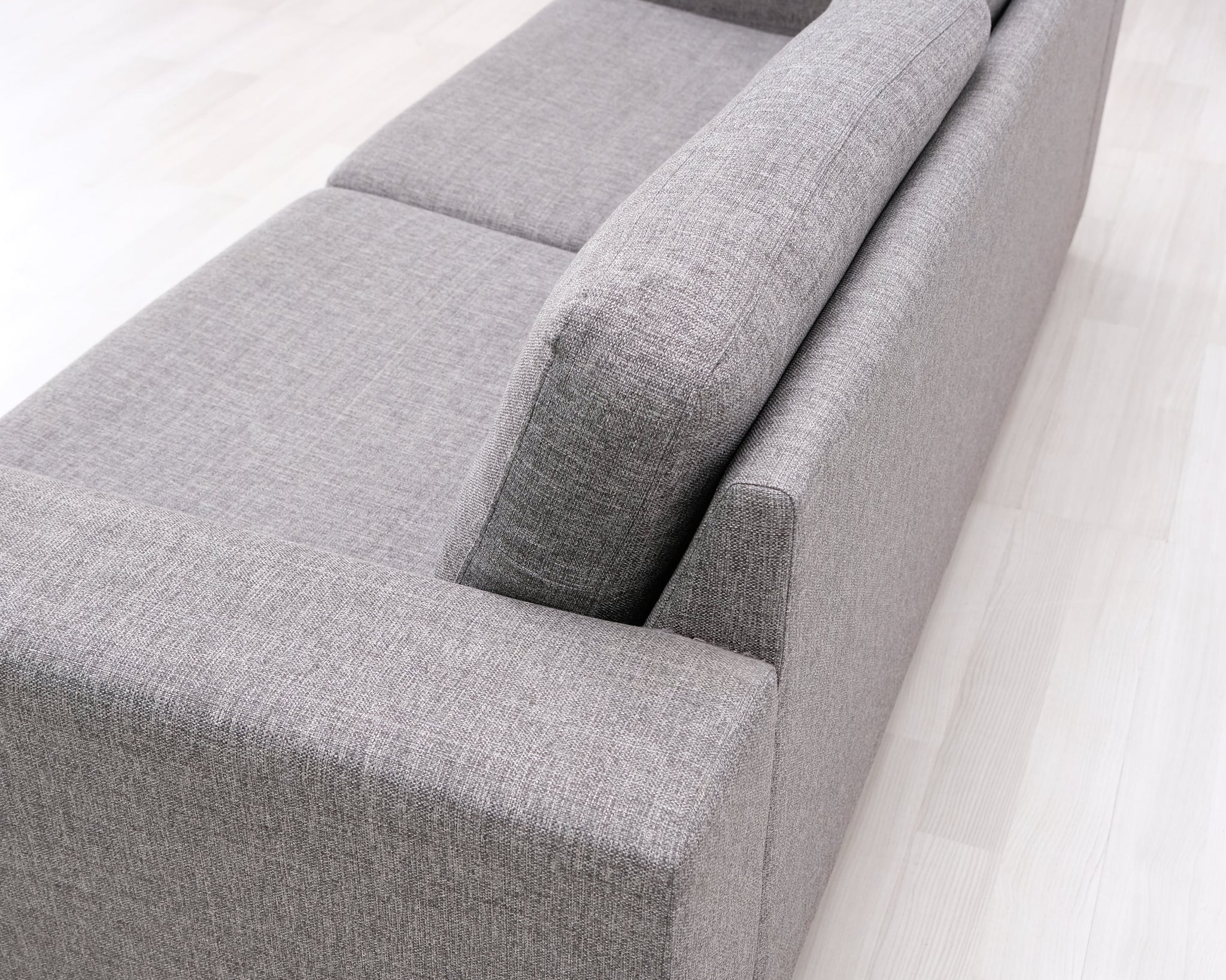Harmaa kangasverhoiltu sohva. Sopii kolmelle hengelle.