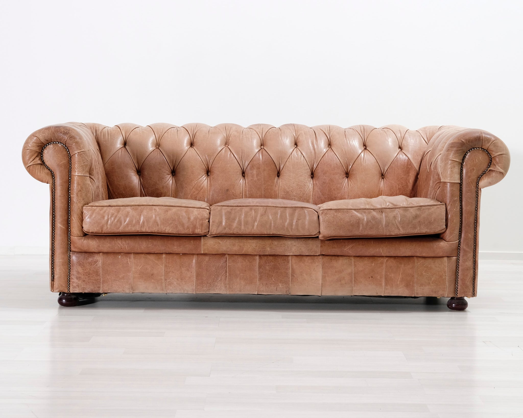 Chesterfield-tyylinen sohva on todellinen klassikko! Tämä yksilö on kolmen istuttava ja siinä on ruskea nahkaverhoilu.