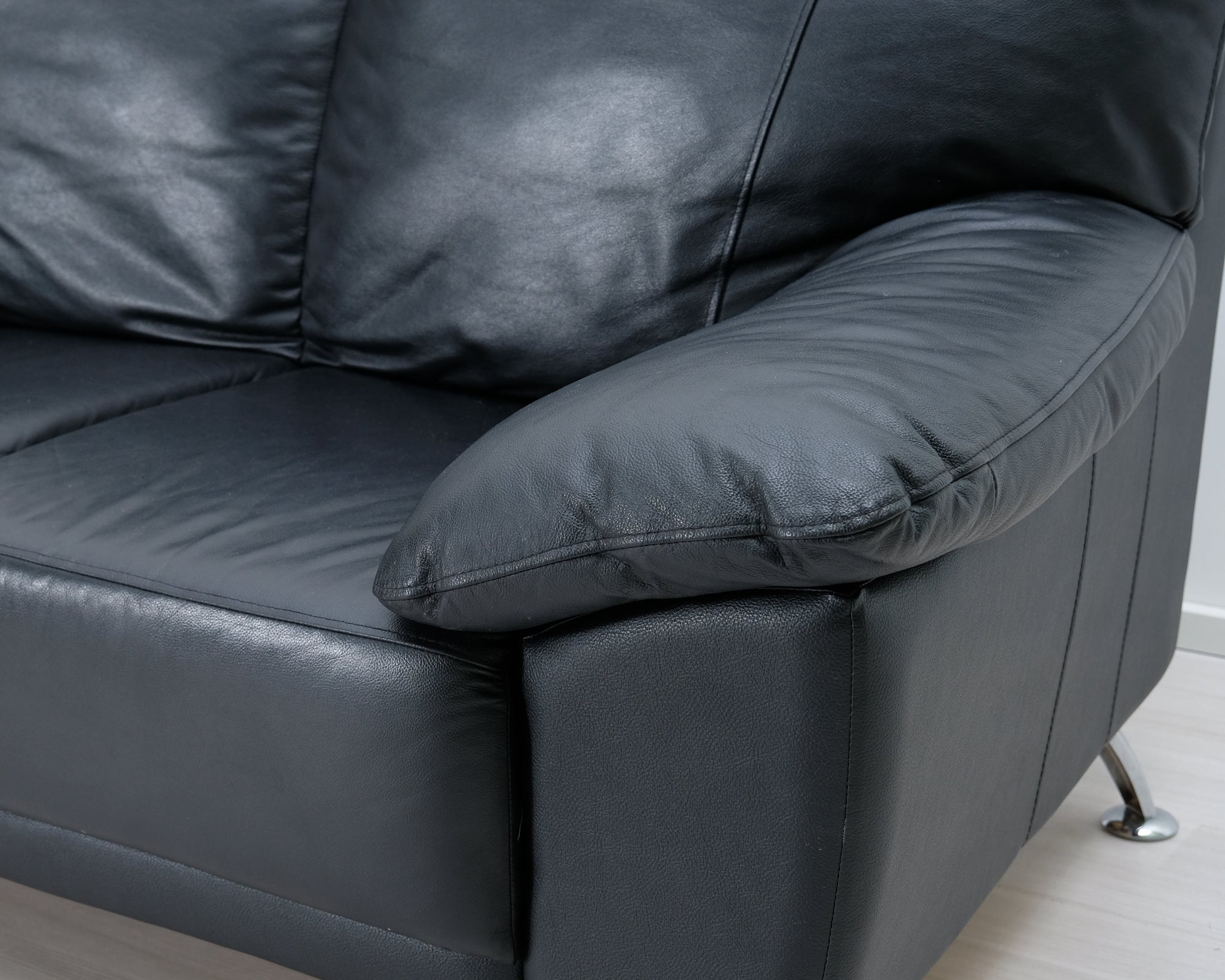 Musta nahkasohva metallijaloilla, joka sopii myös pienempään tilaan.