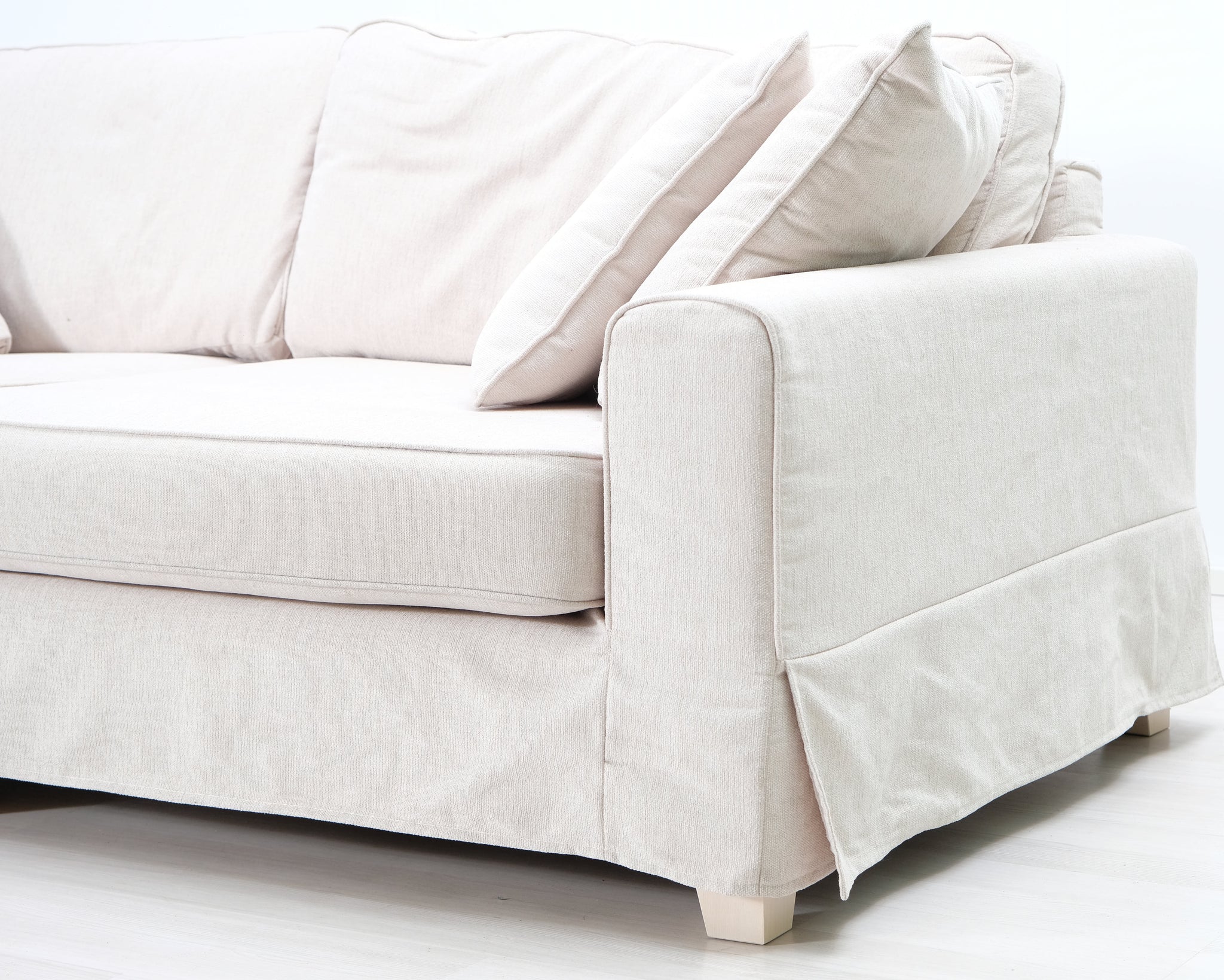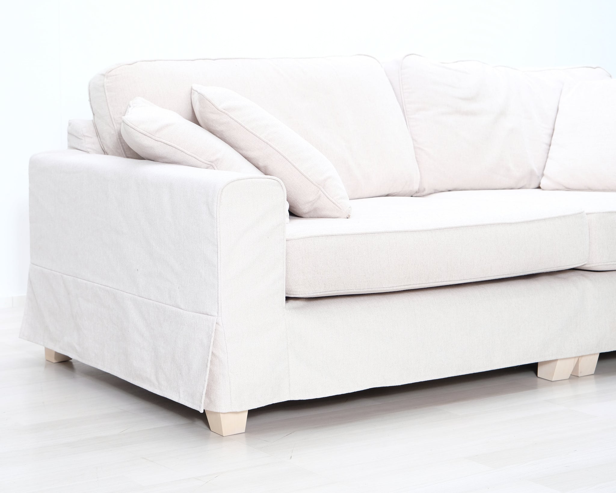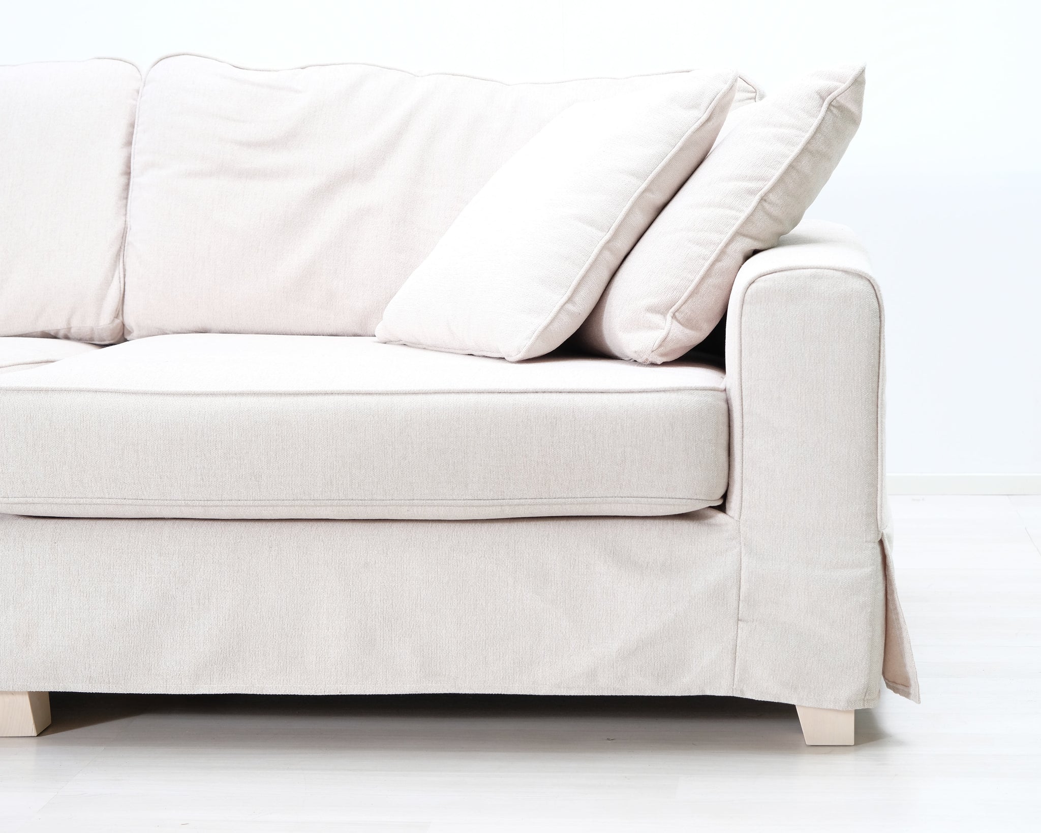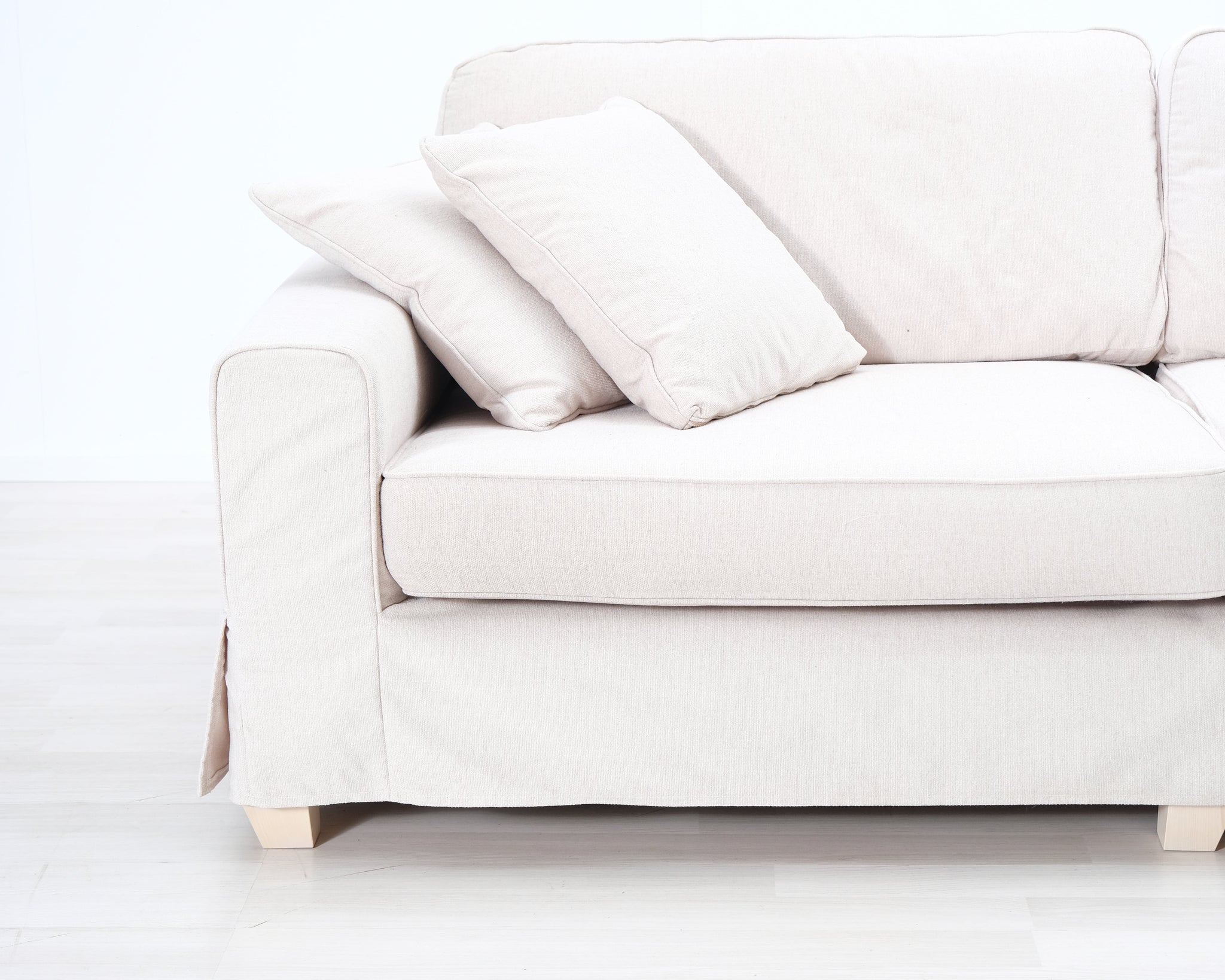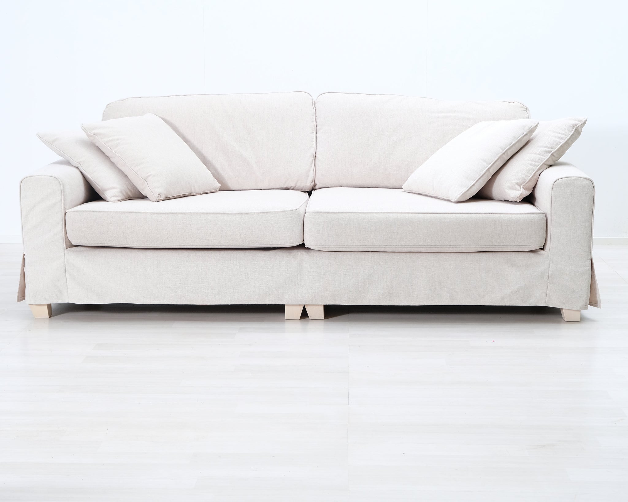 Askon valmistama kolmen istuttava kangassohva. Vaalean beige verhoilu.