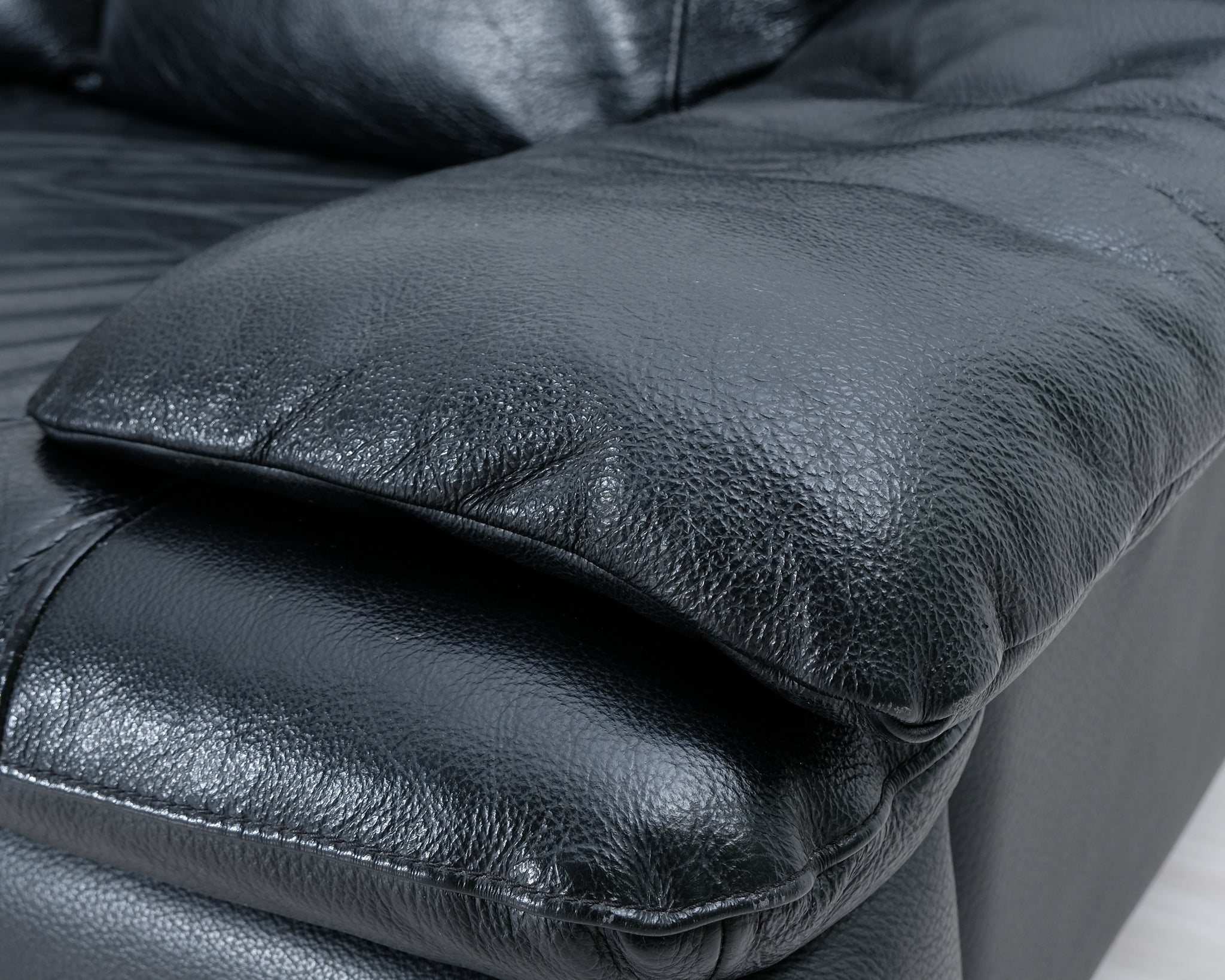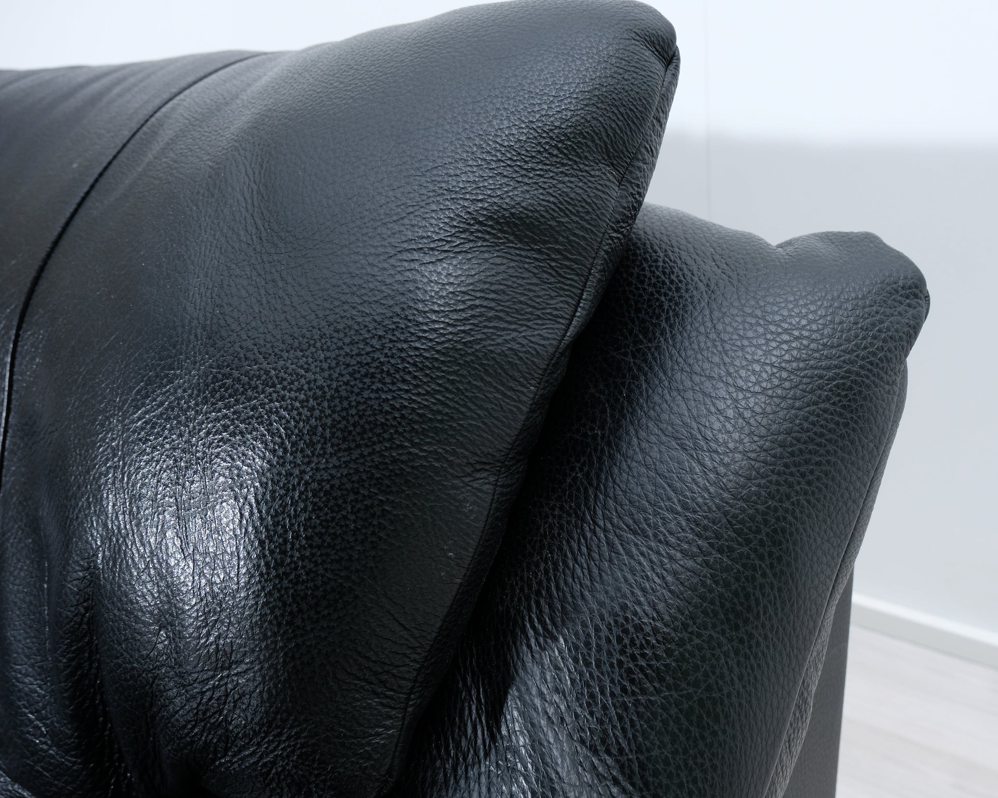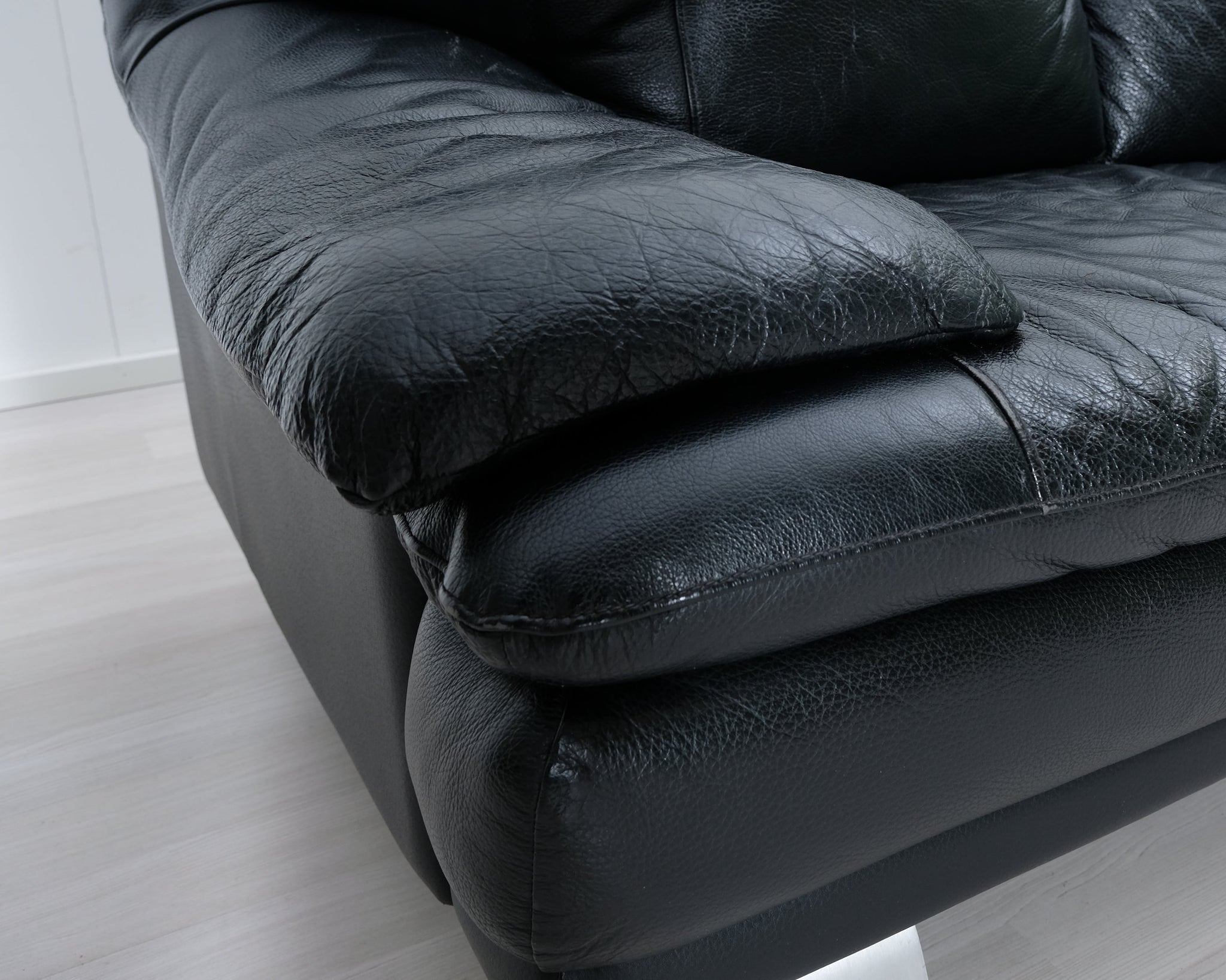 Maskun Corona-sohva. Musta nahkaverhoilu metallijalat.