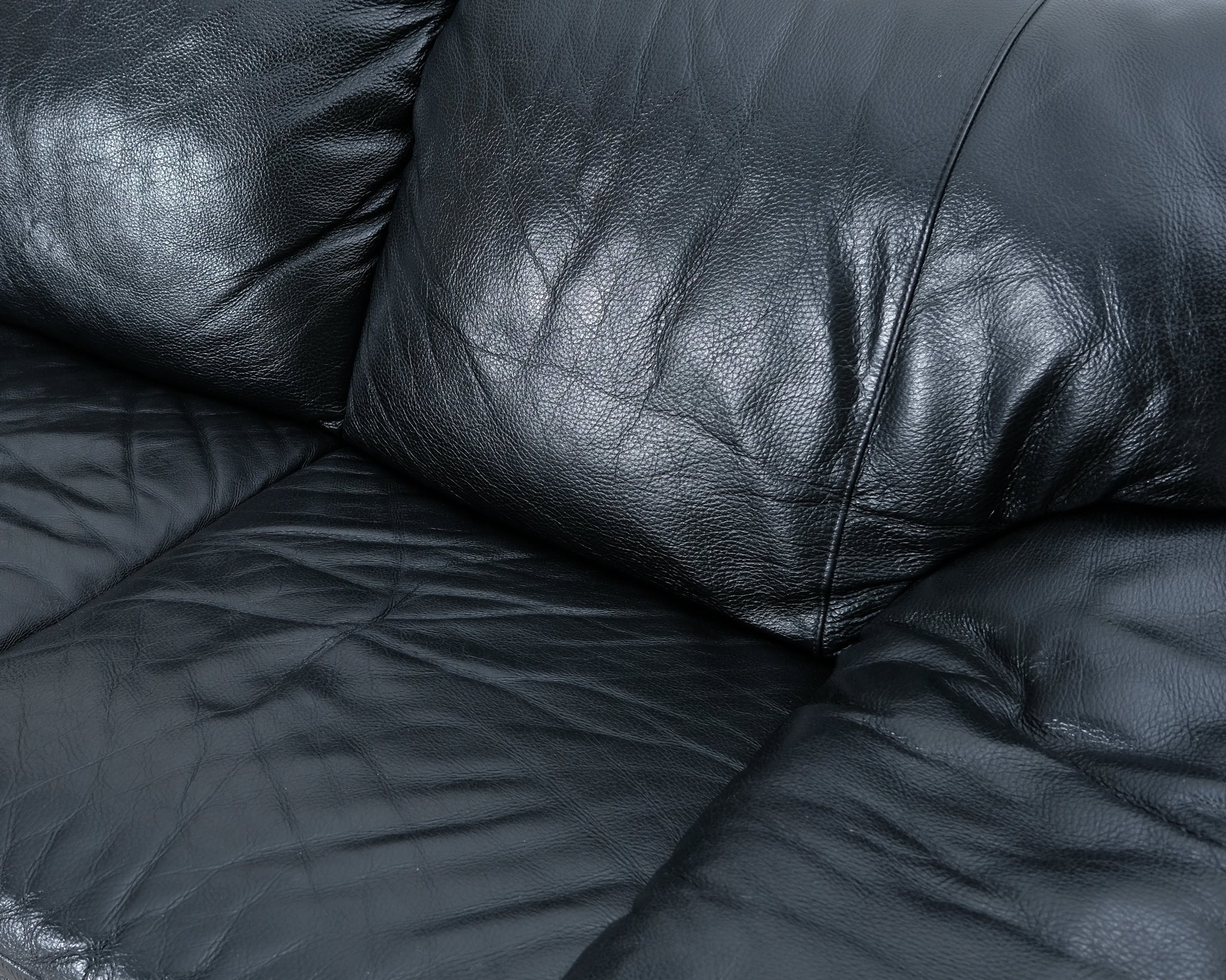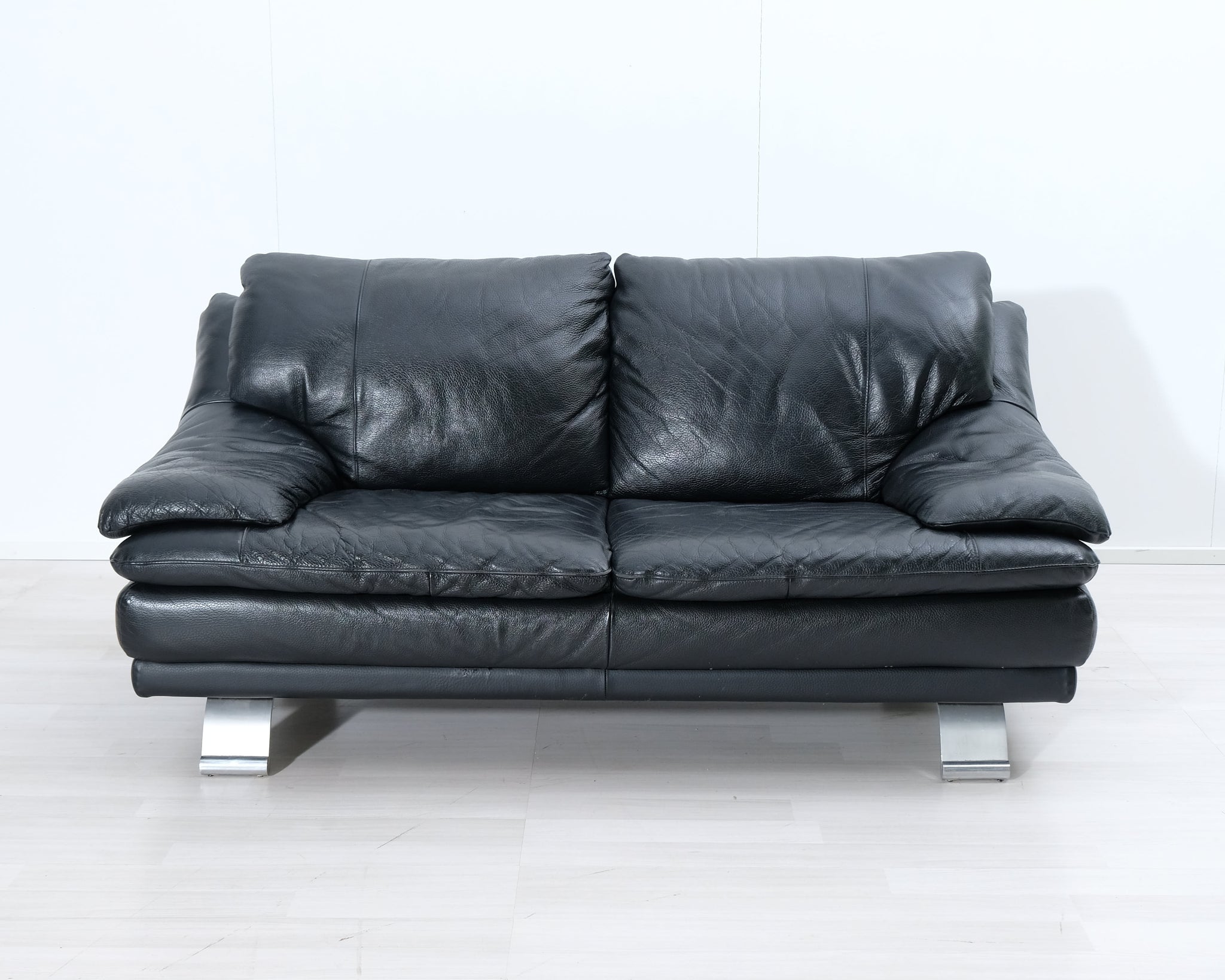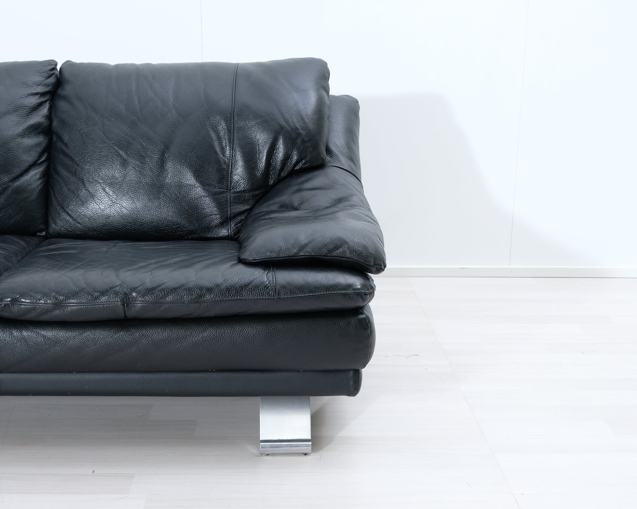 Maskun Corona-sohva. Musta nahkaverhoilu metallijalat.