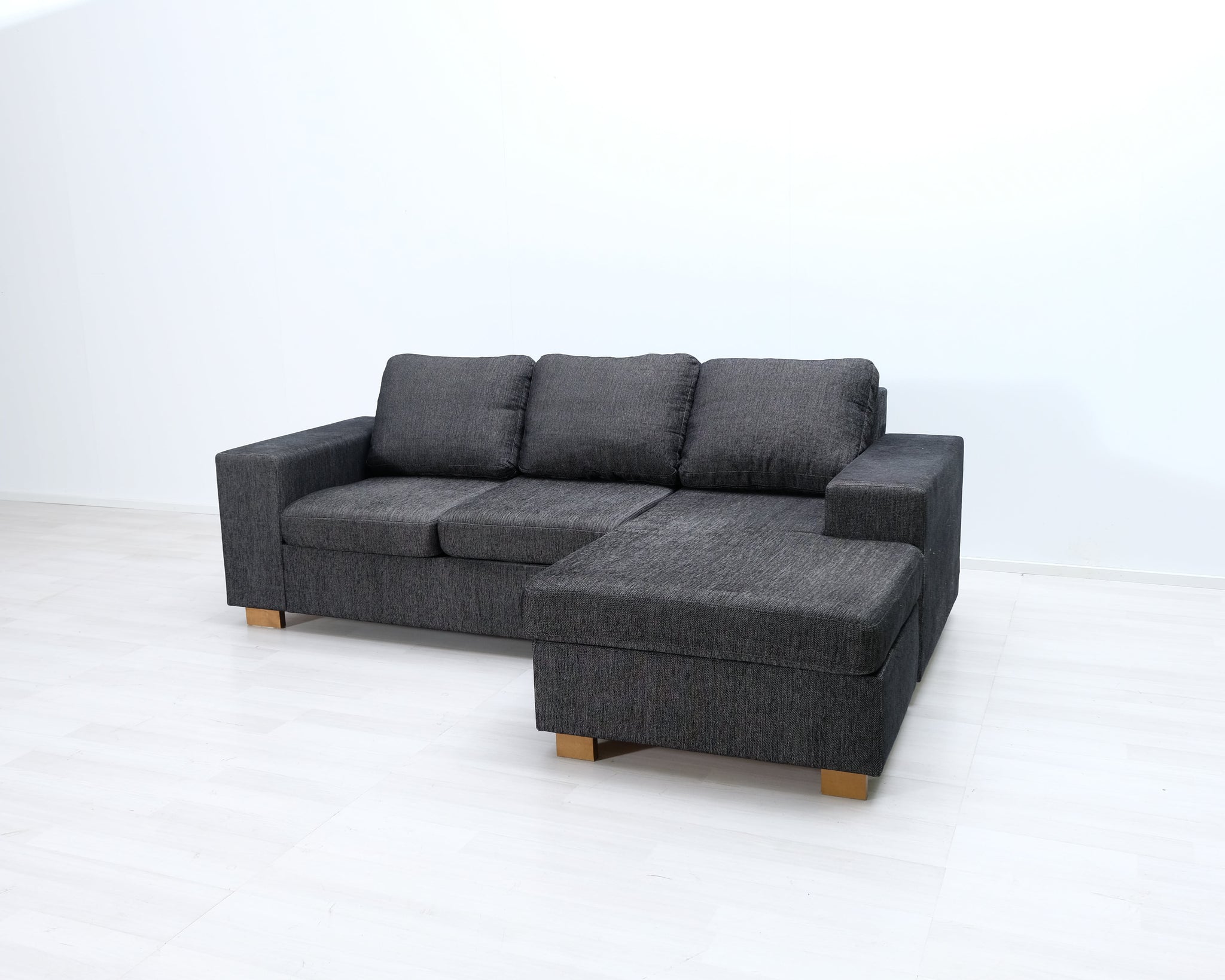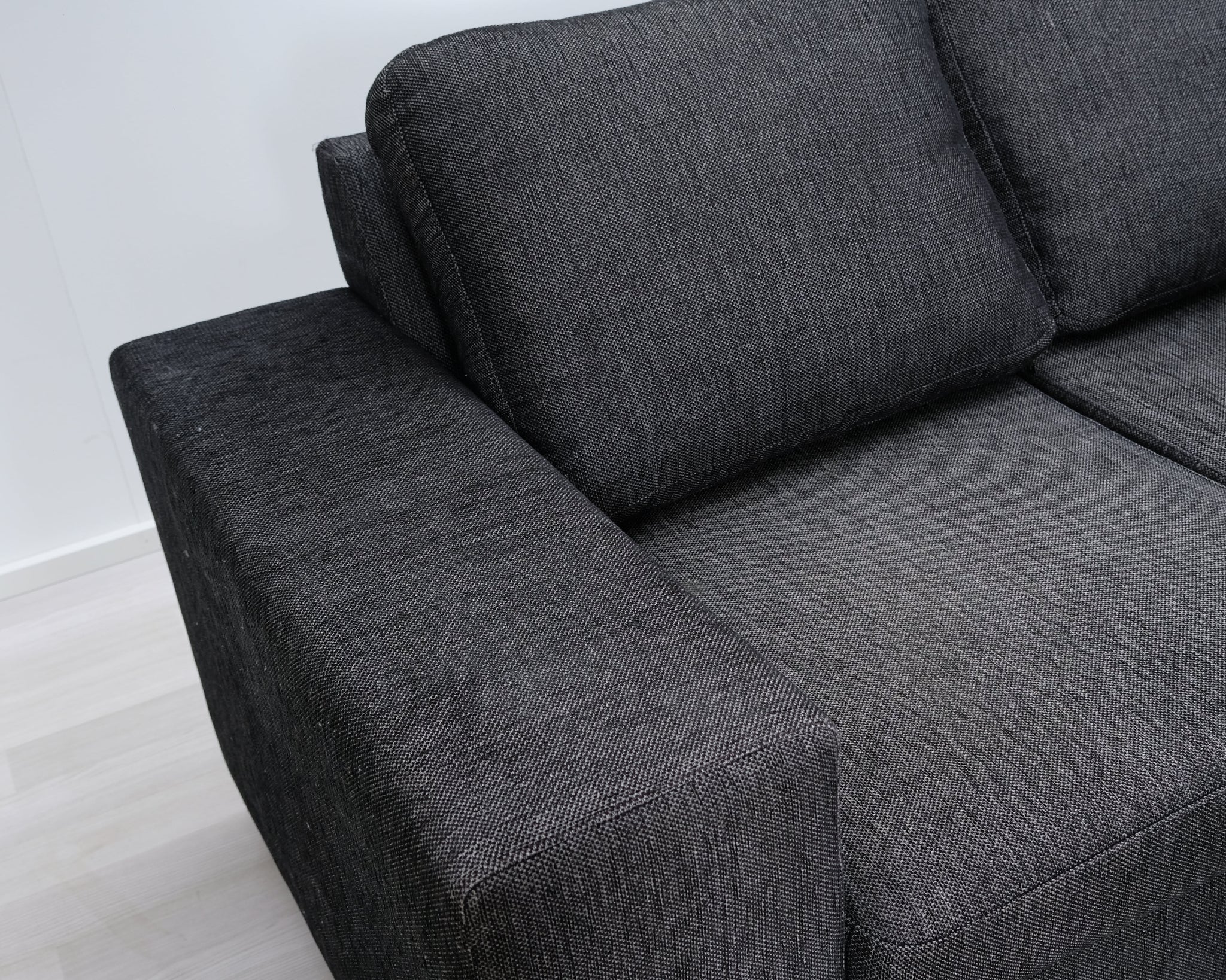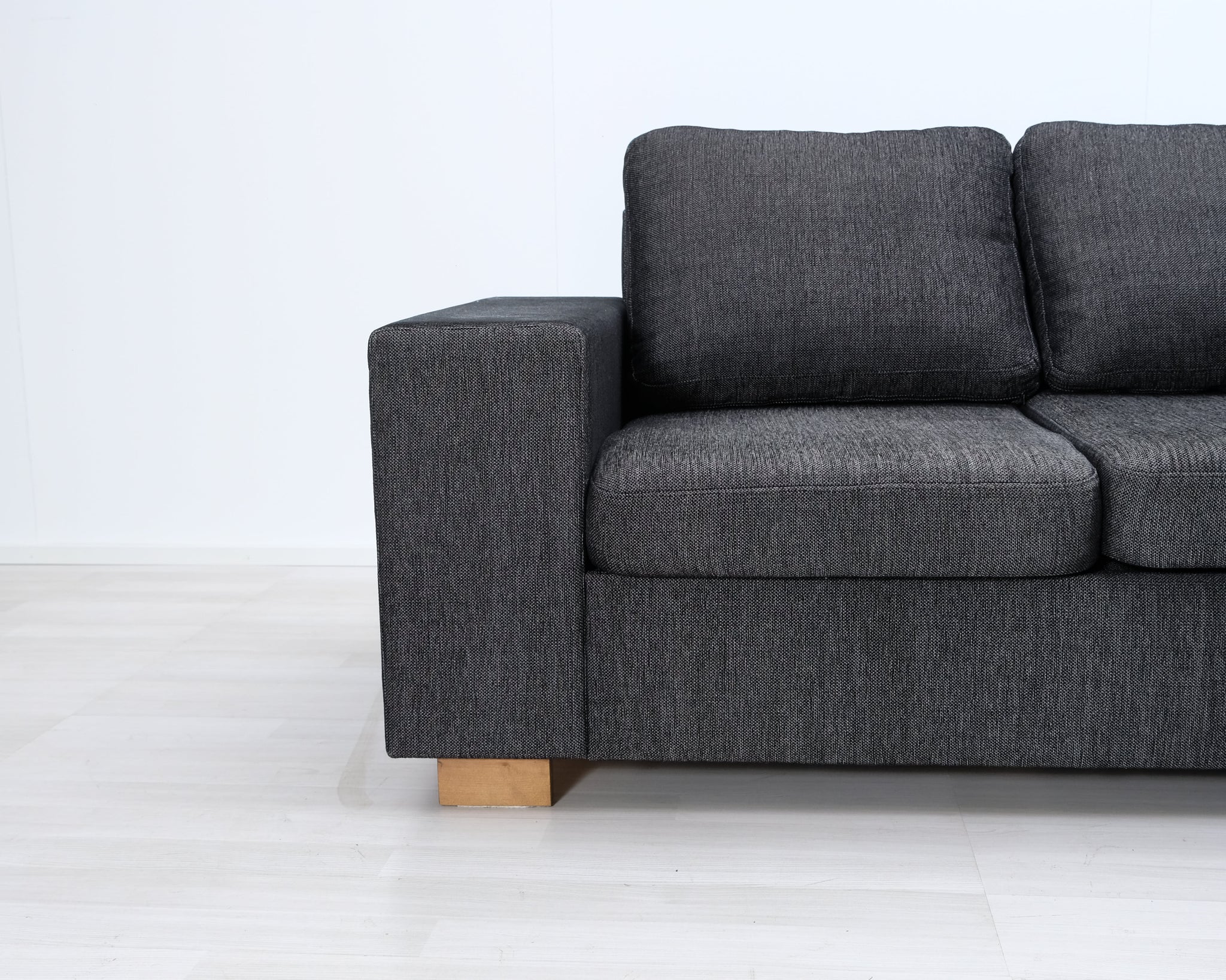 Kolmen istuttava divaanisohva. Tummanharmaa kangasverhoilu.