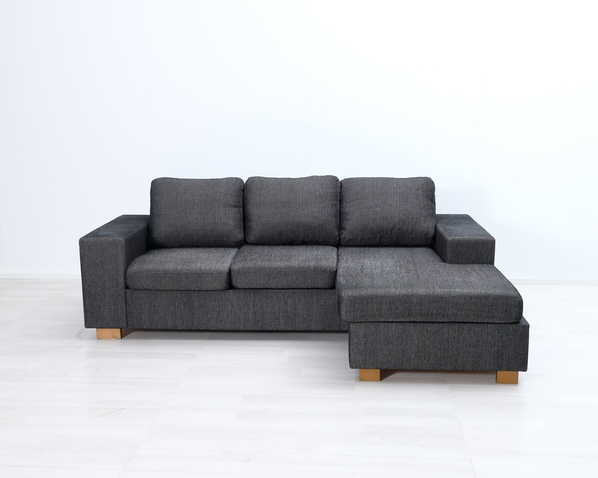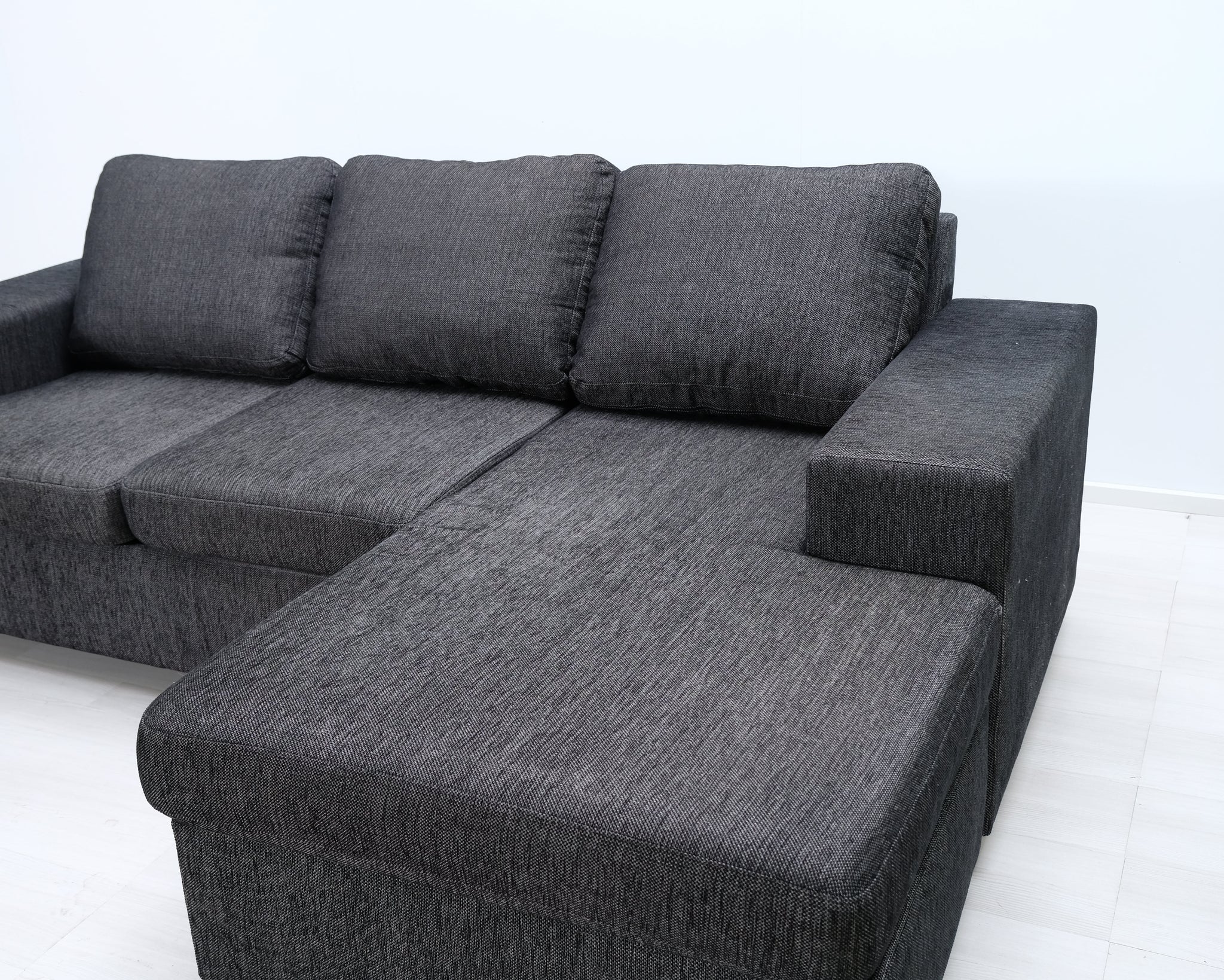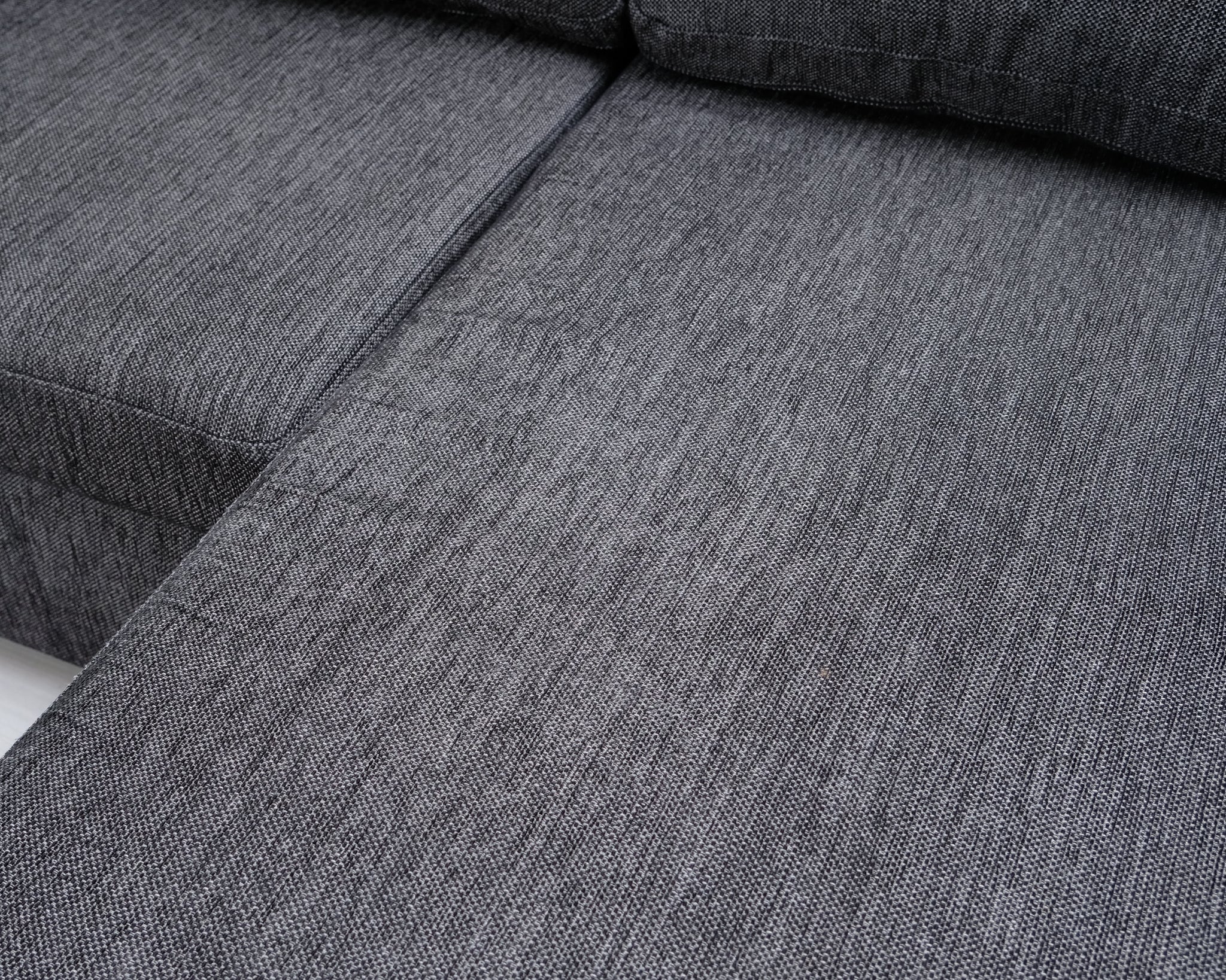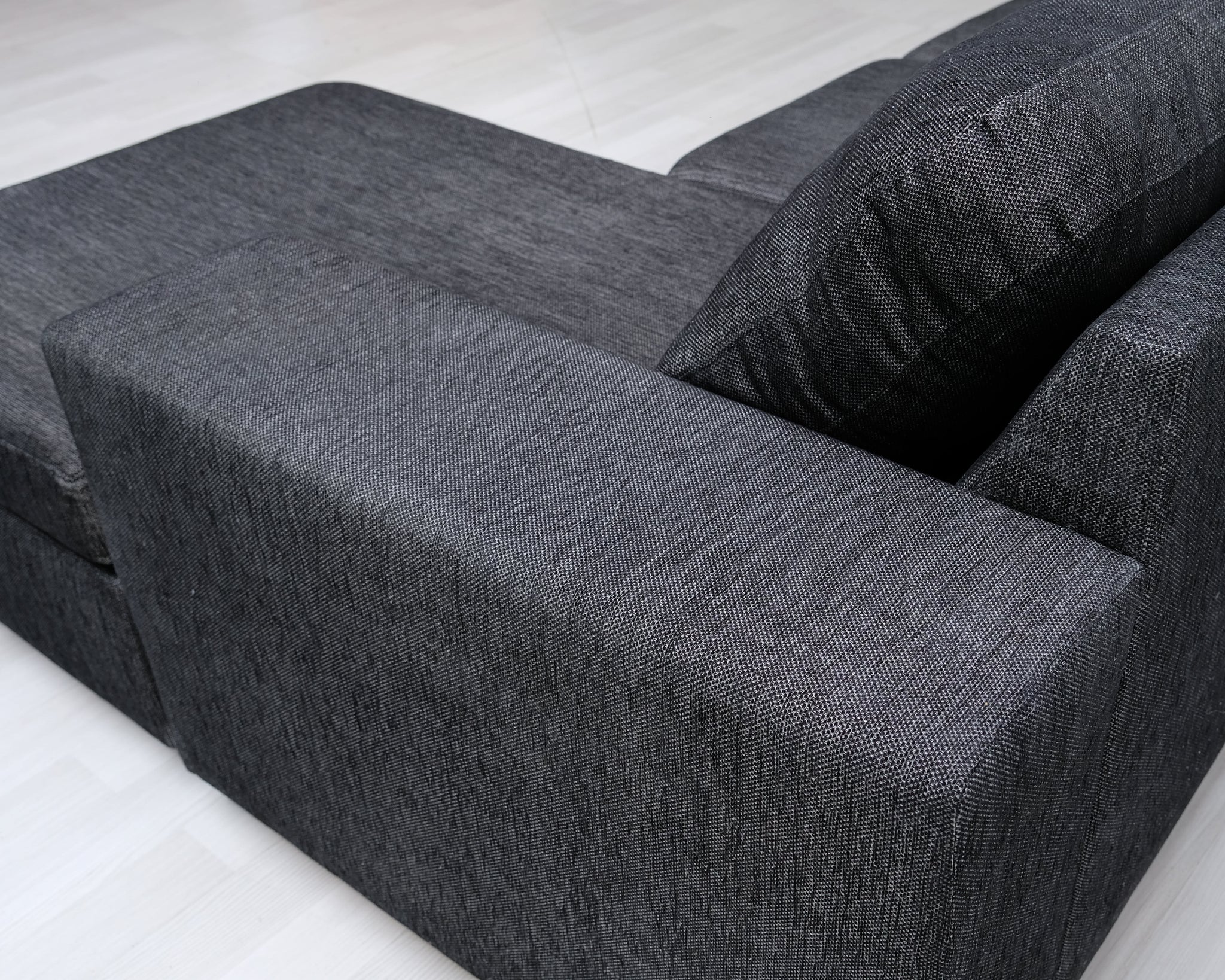 Kolmen istuttava divaanisohva. Tummanharmaa kangasverhoilu.