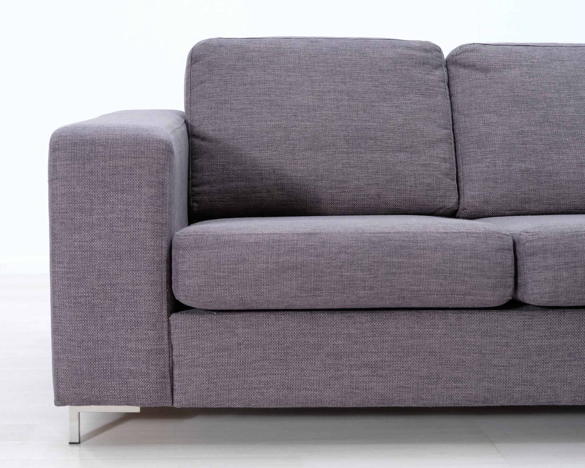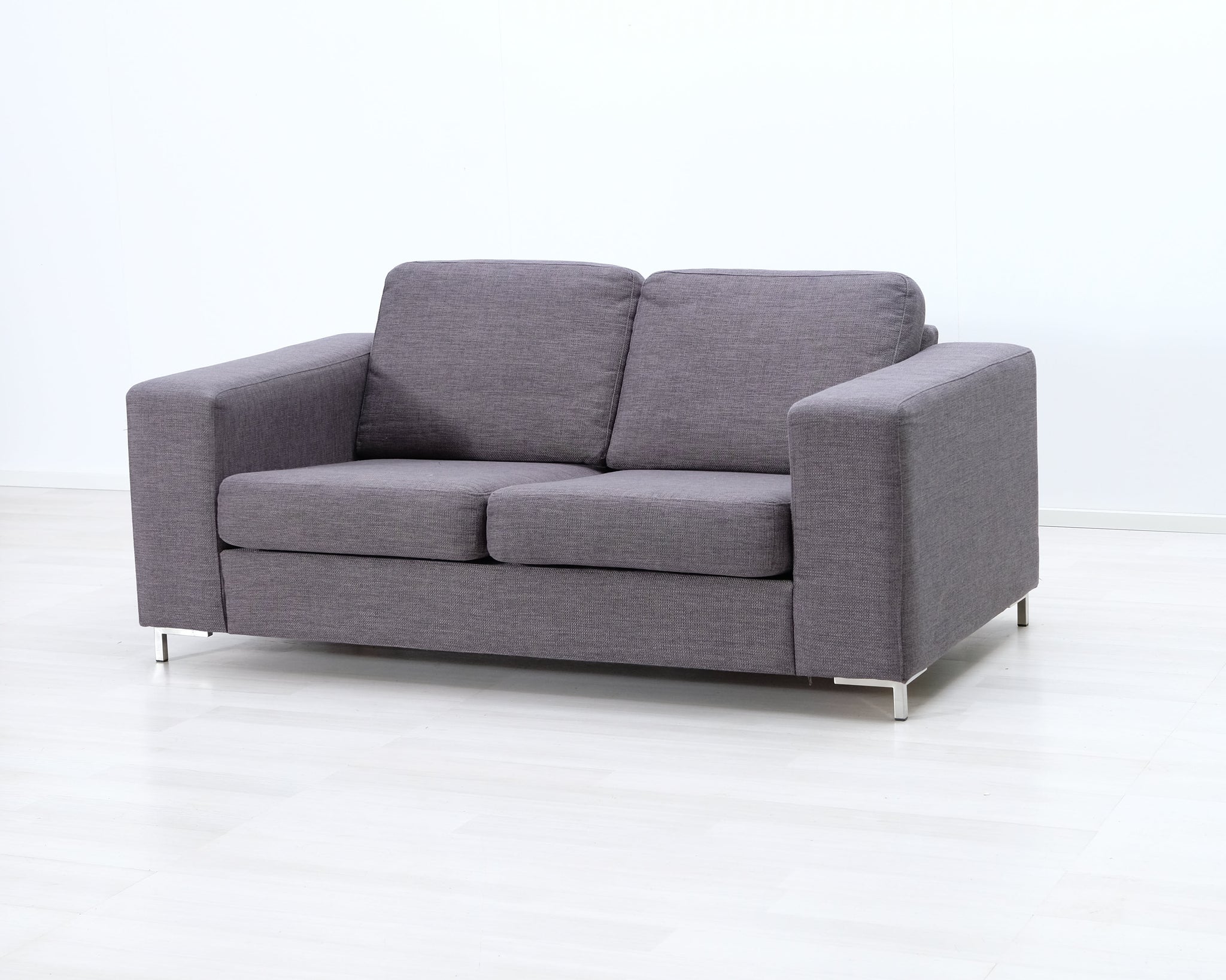 Kompakti kahden istuttava sohva. Harmaa kangasverhoilu.