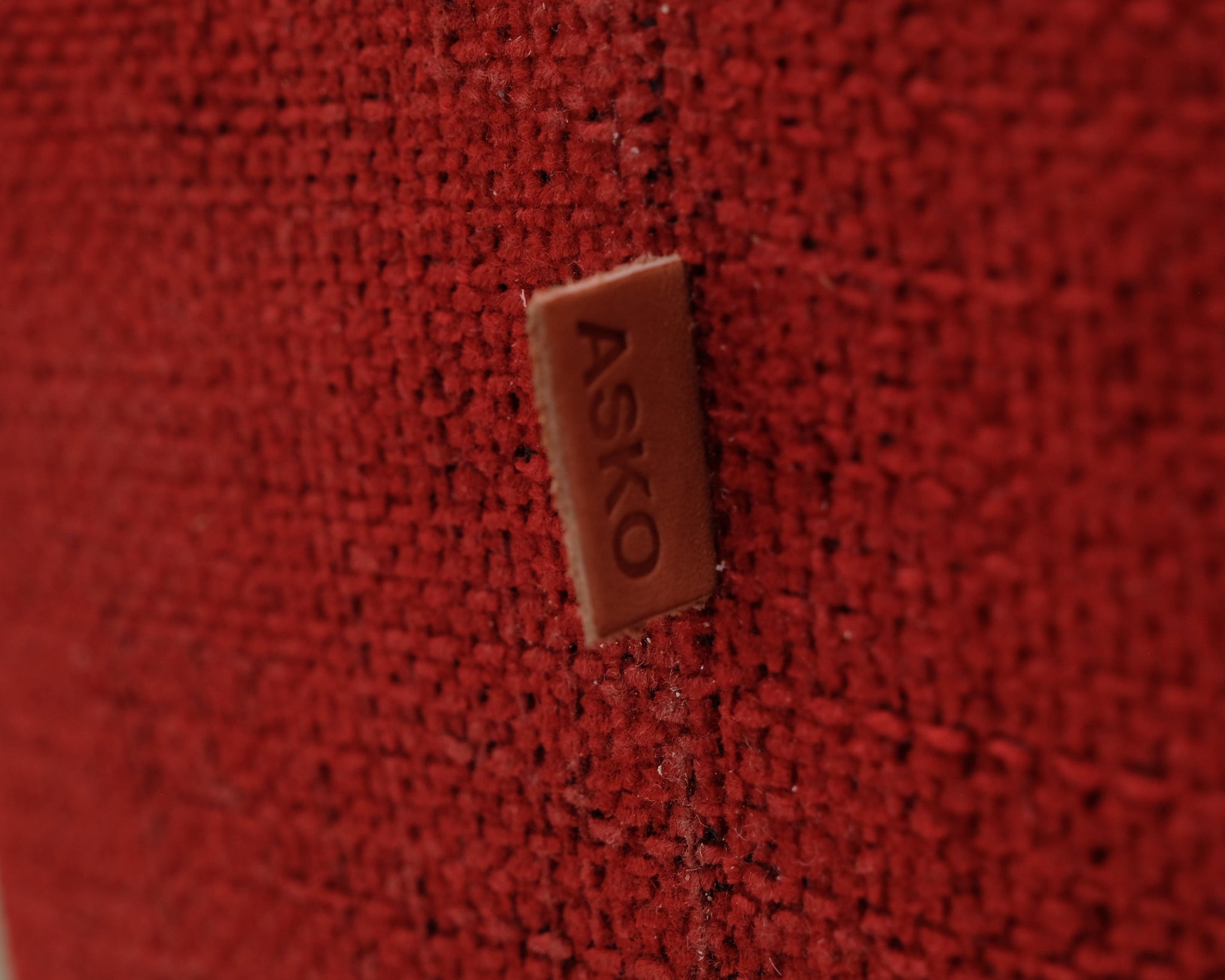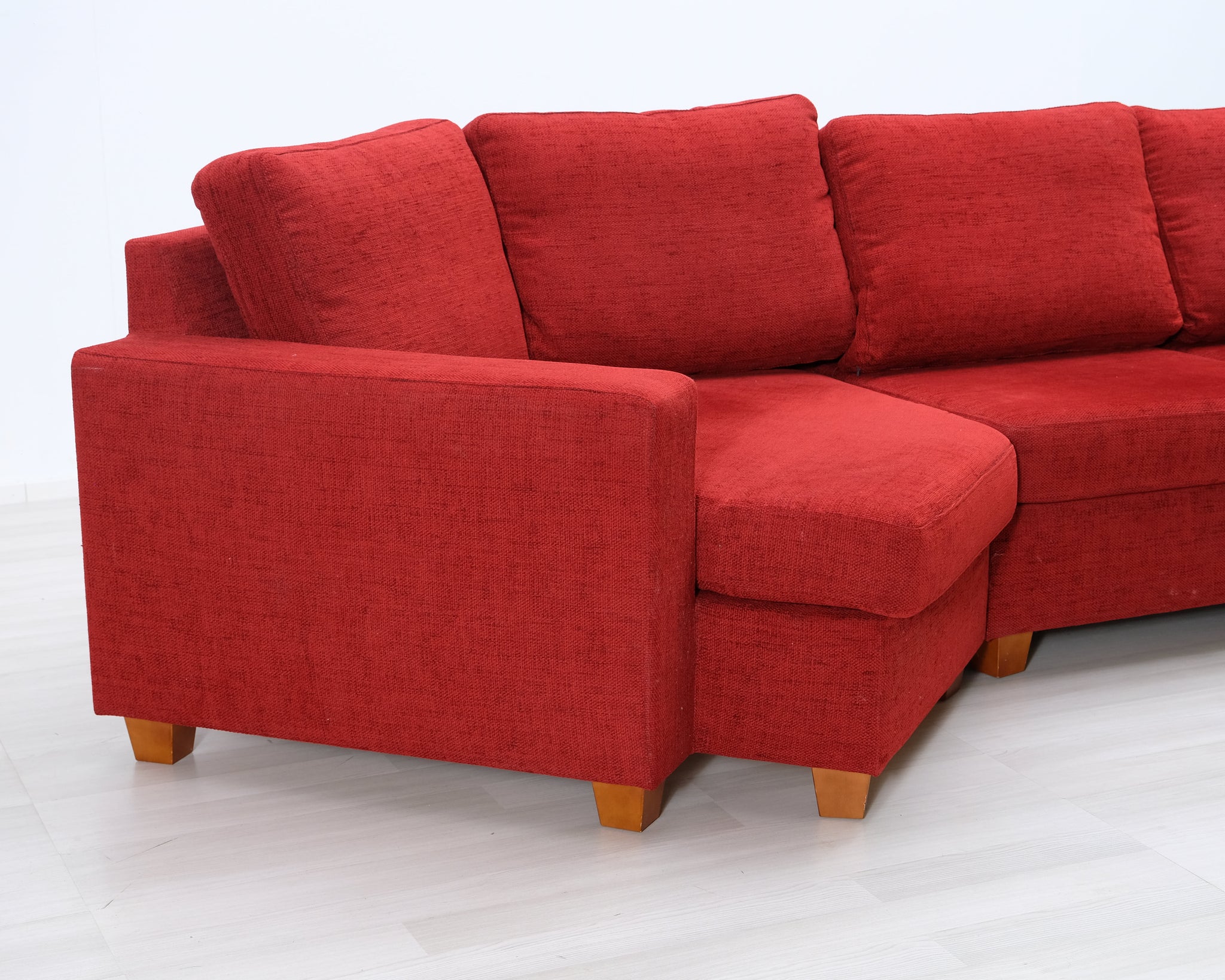 Punainen kangassohva pienellä kulmalla. Sopii neljälle hengelle.