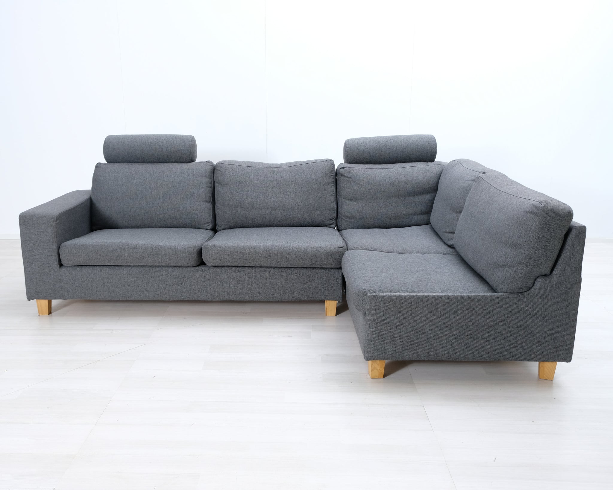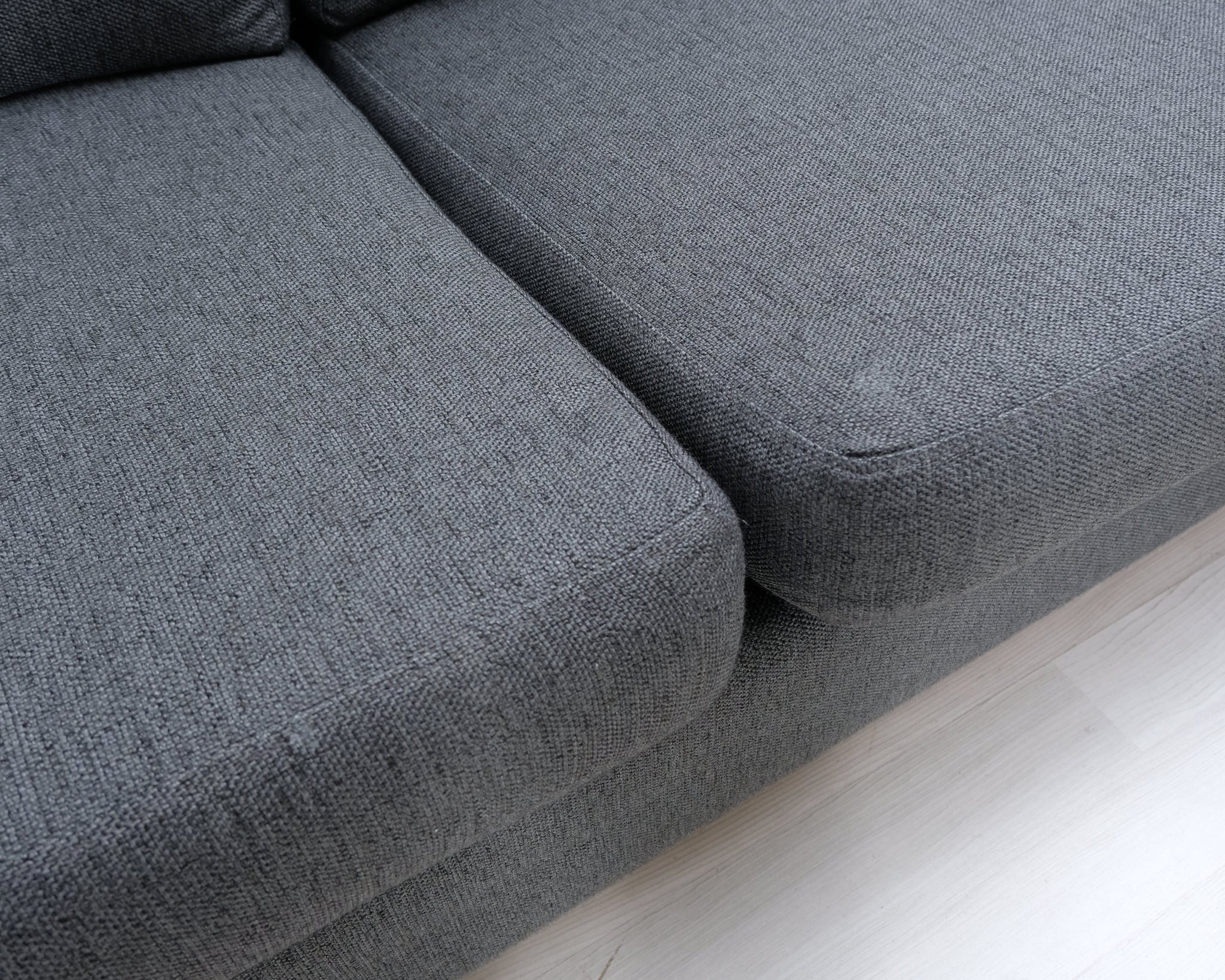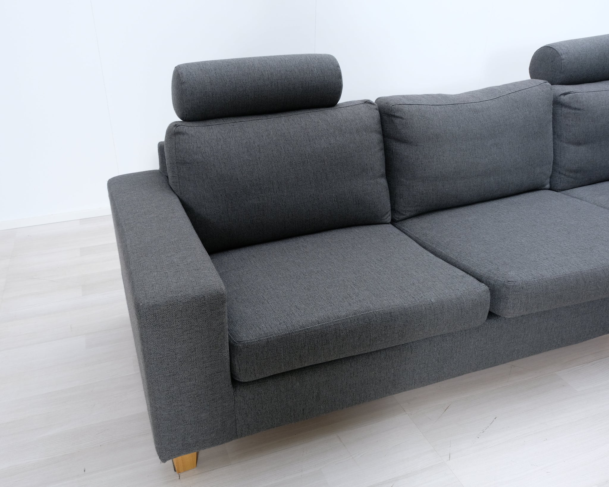 4-istuttava harmaa kankainen divaanisohva. Vaaleat tammijalat ja mukavat muhkeat irrotettavat tyynyt untuvatäytteellä. Tyynynpäälliset irrotettavat ja pestävät.