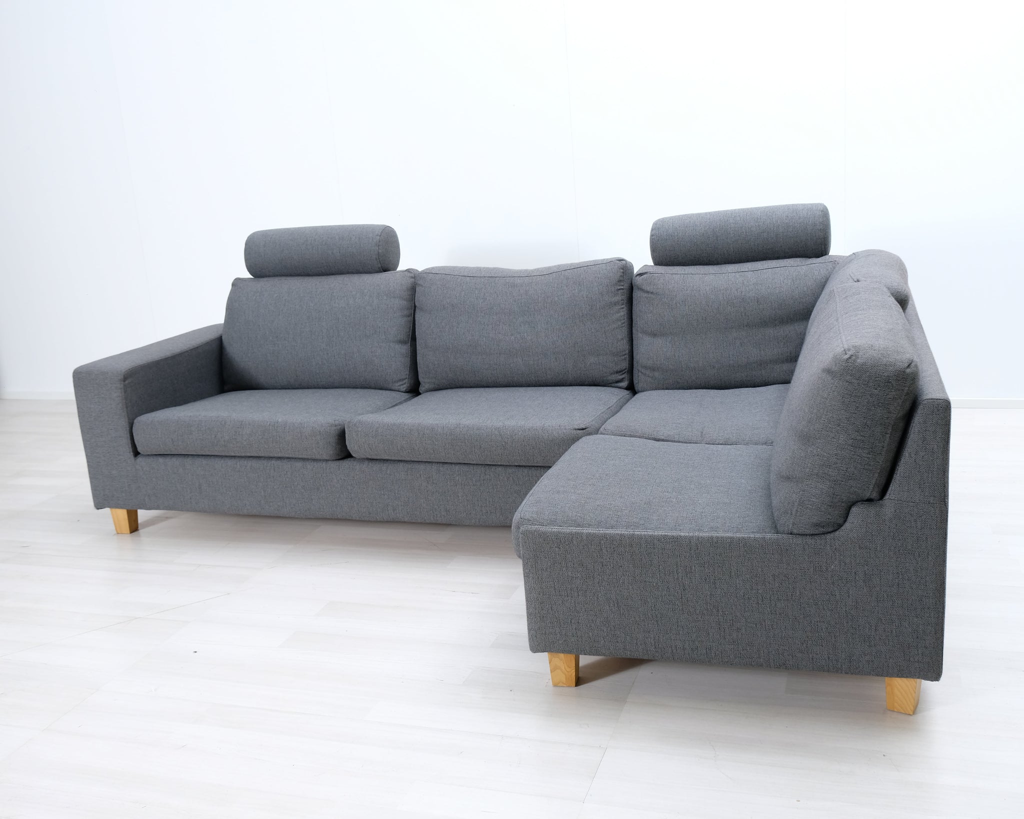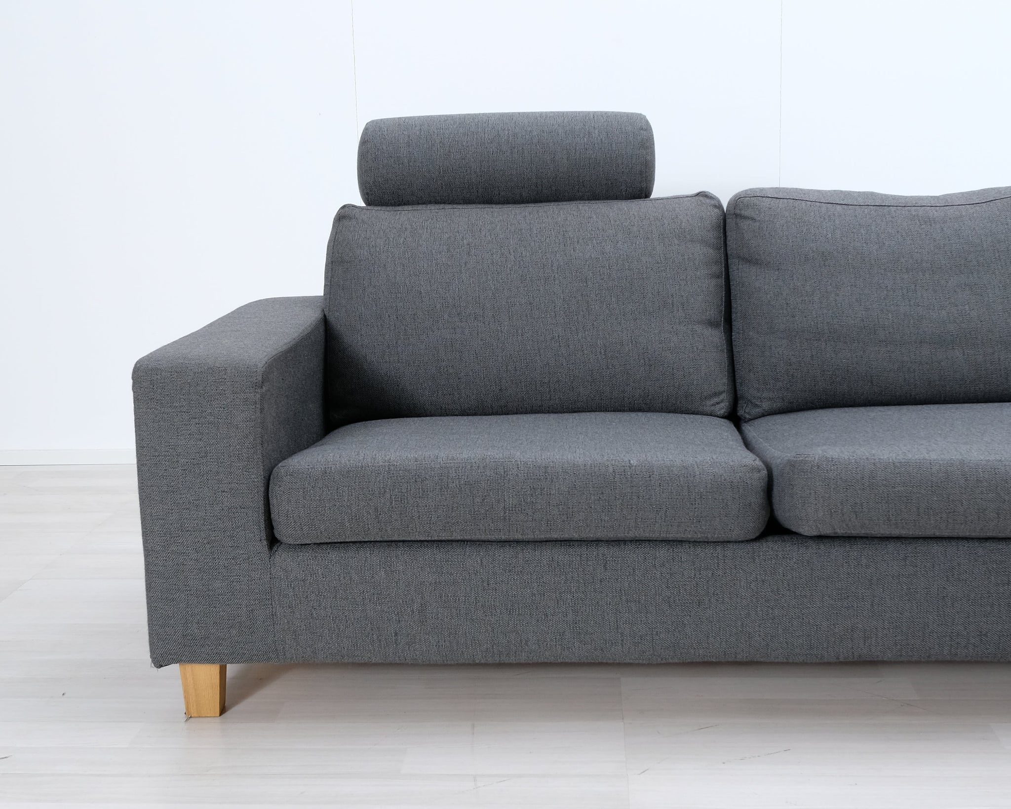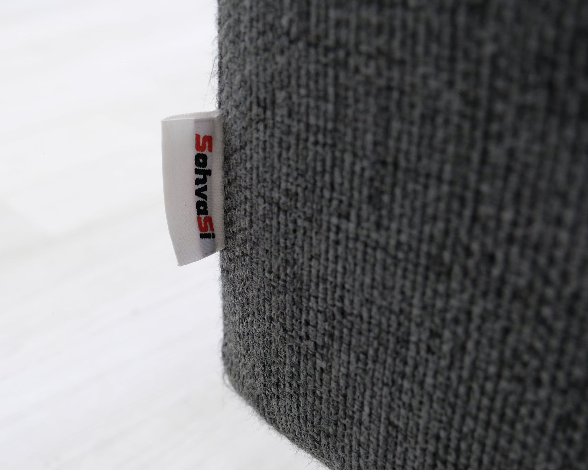 4-istuttava harmaa kankainen divaanisohva. Vaaleat tammijalat ja mukavat muhkeat irrotettavat tyynyt untuvatäytteellä. Tyynynpäälliset irrotettavat ja pestävät.