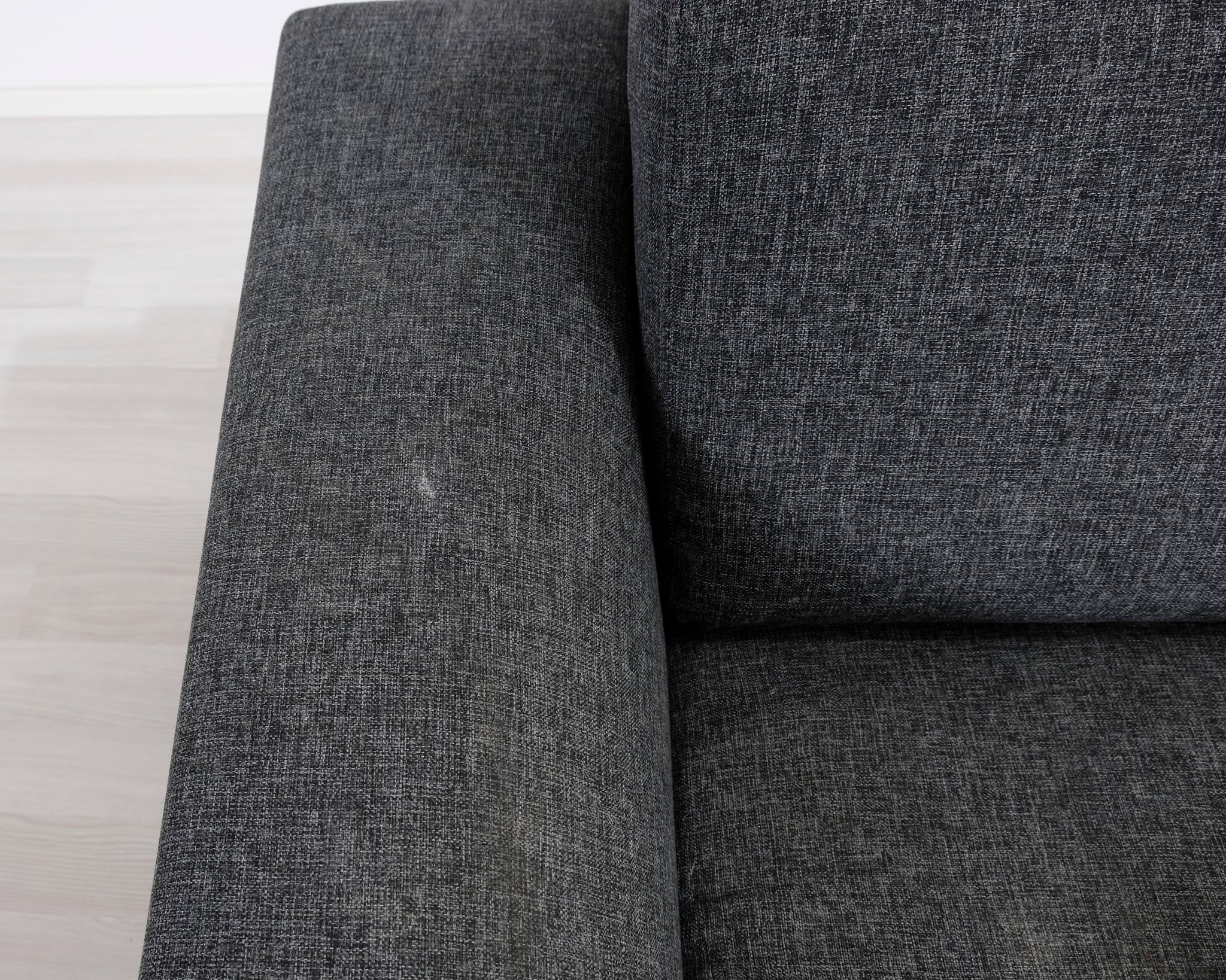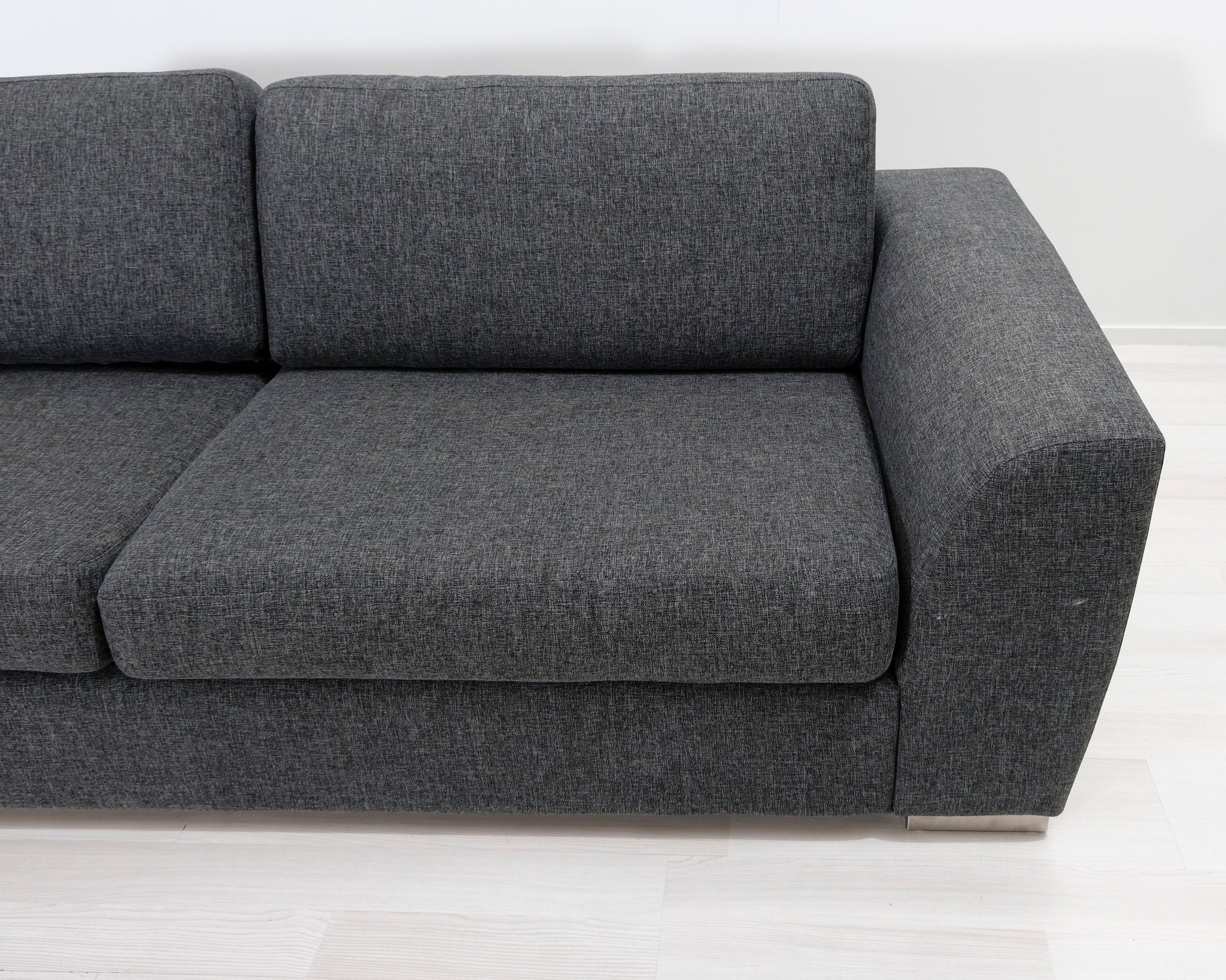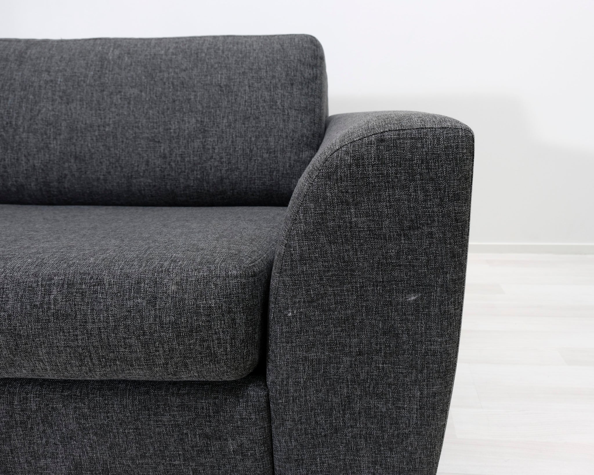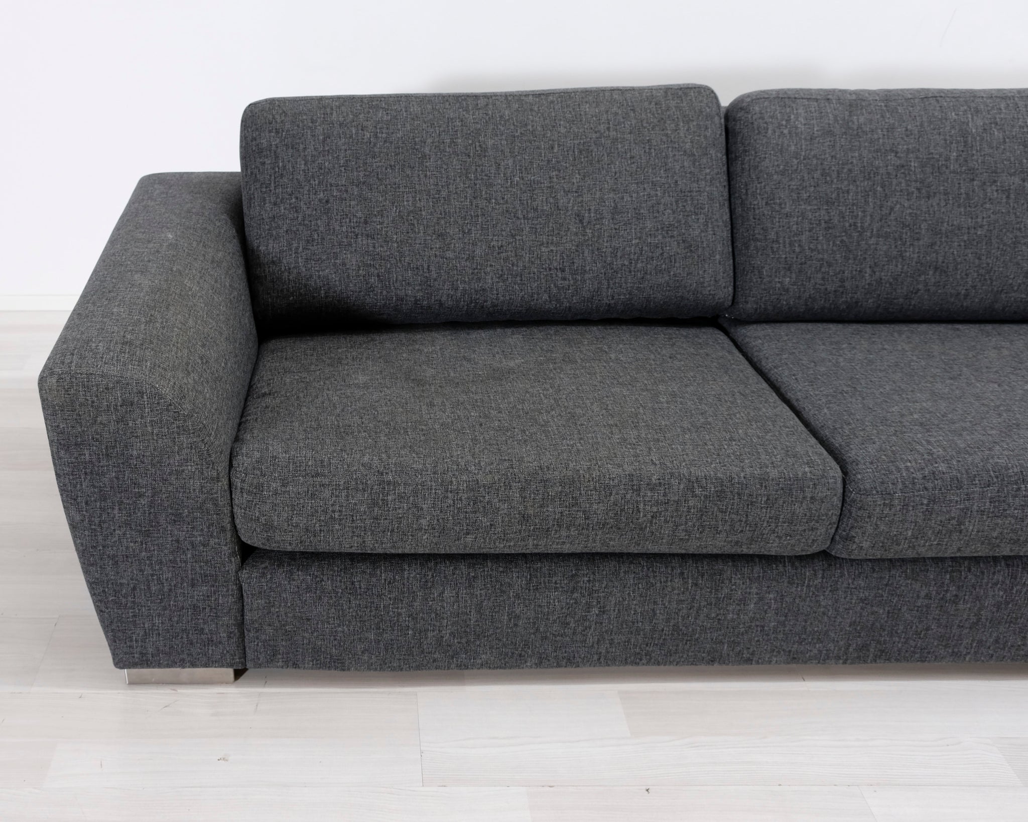 Tummanharmaa kangassohva. Tyynynpäälliset irrotettavat ja vesipestävät.