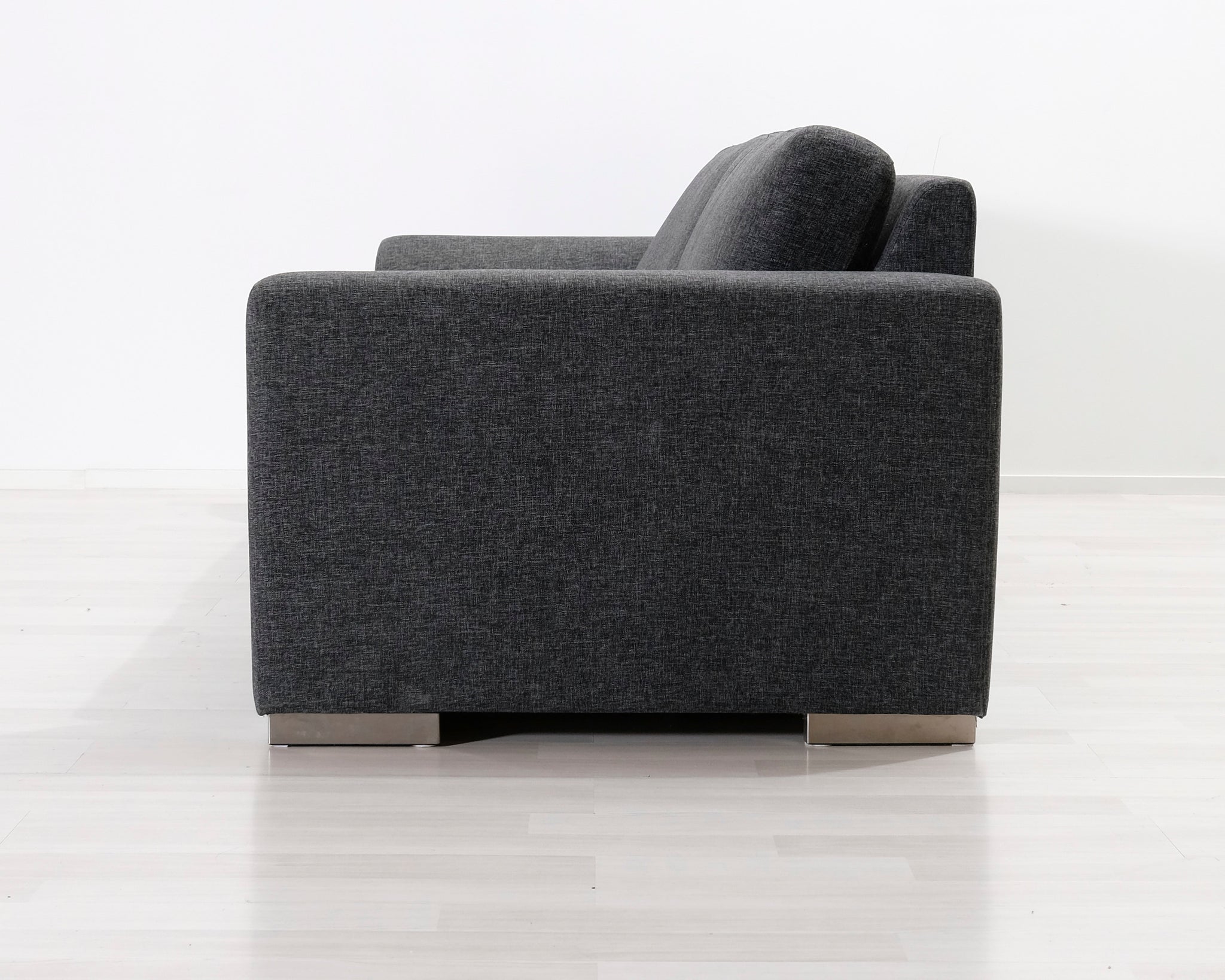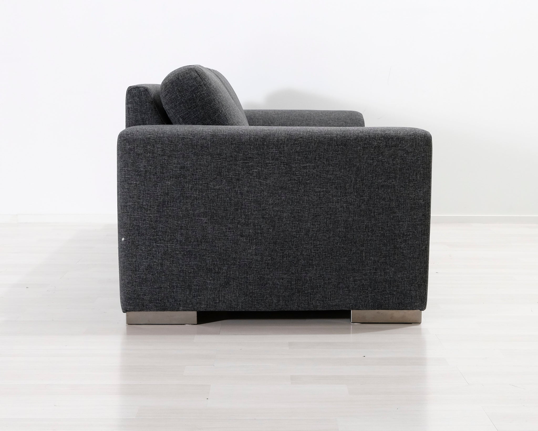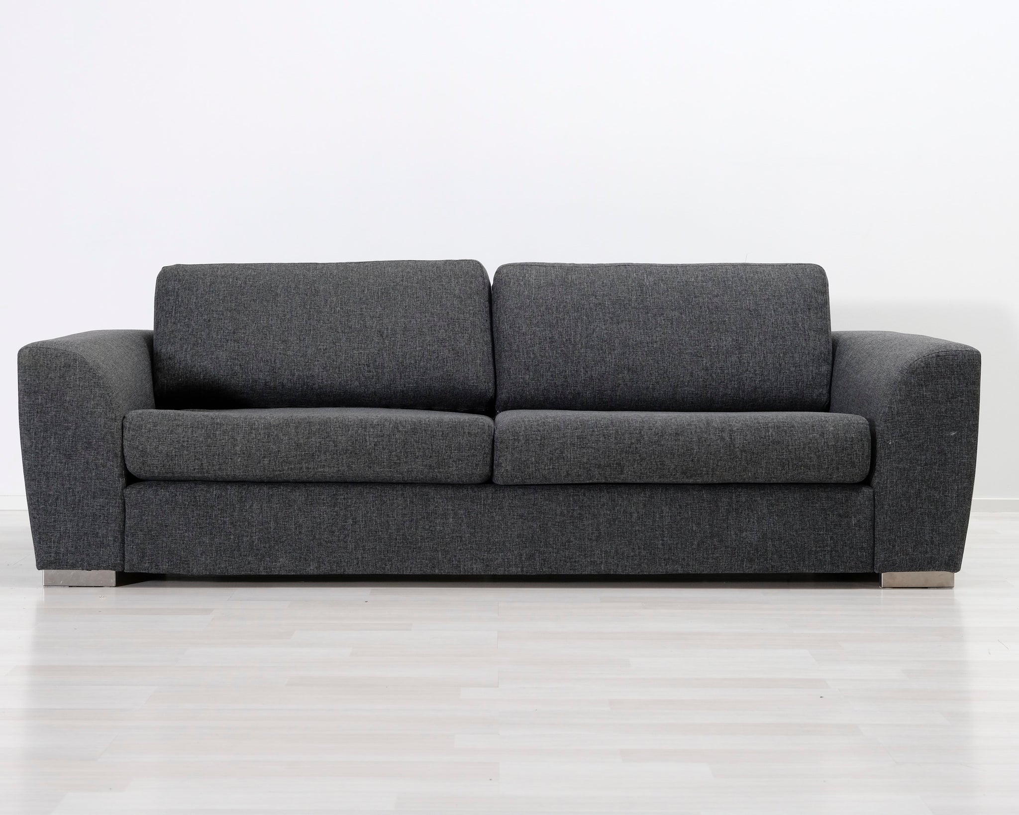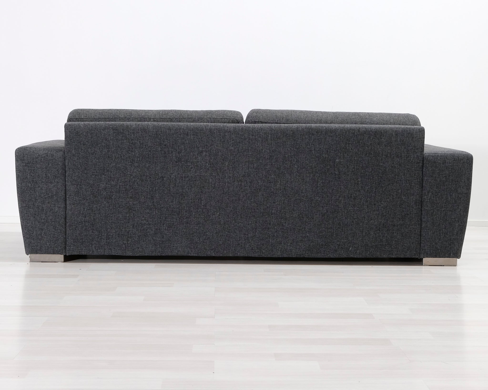 Tummanharmaa kangassohva. Tyynynpäälliset irrotettavat ja vesipestävät.