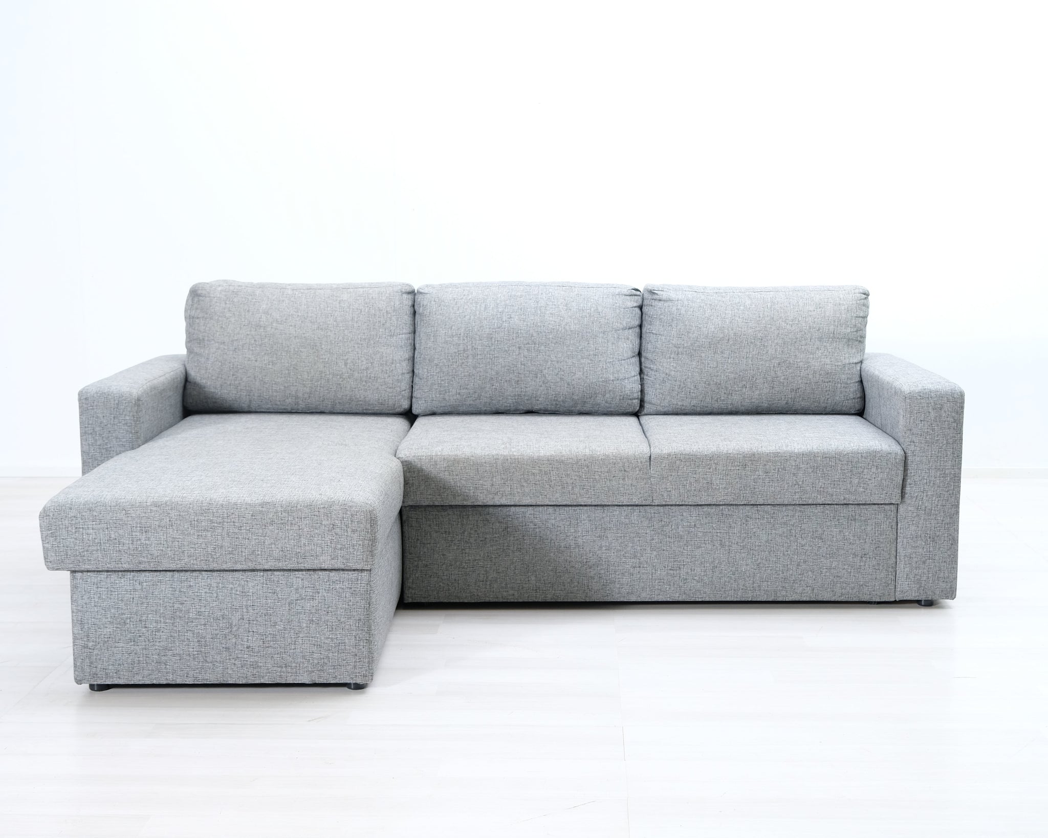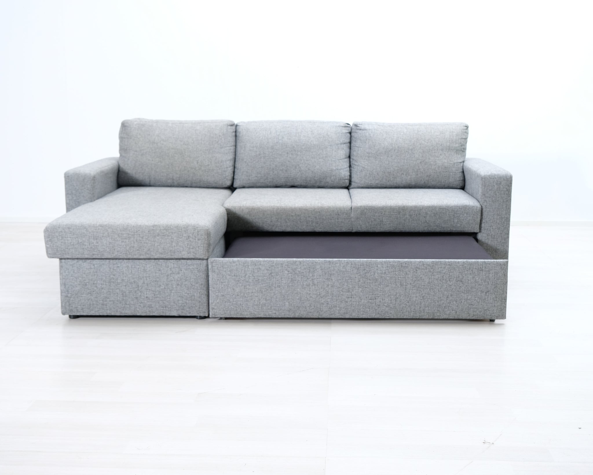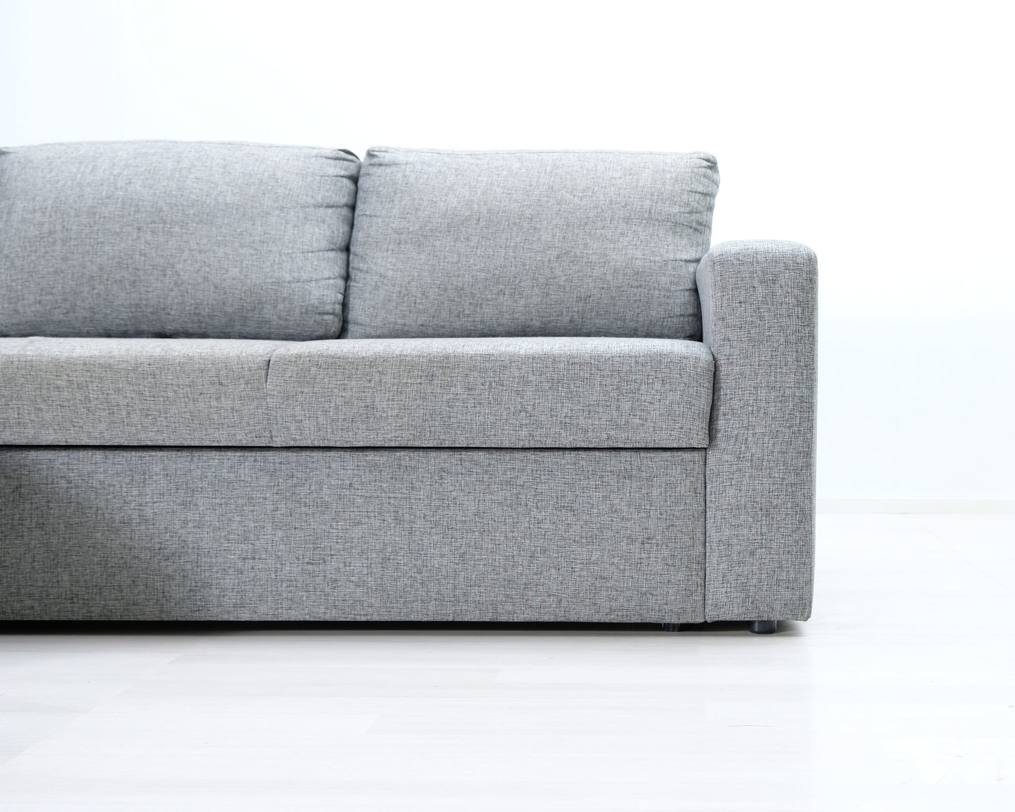 Kolmen istuttava VIGO-divaanisvuodesohva. Vaaleanharmaa kangasverhoilu. Sohvassa on tilava vuodevaatelaatikko.